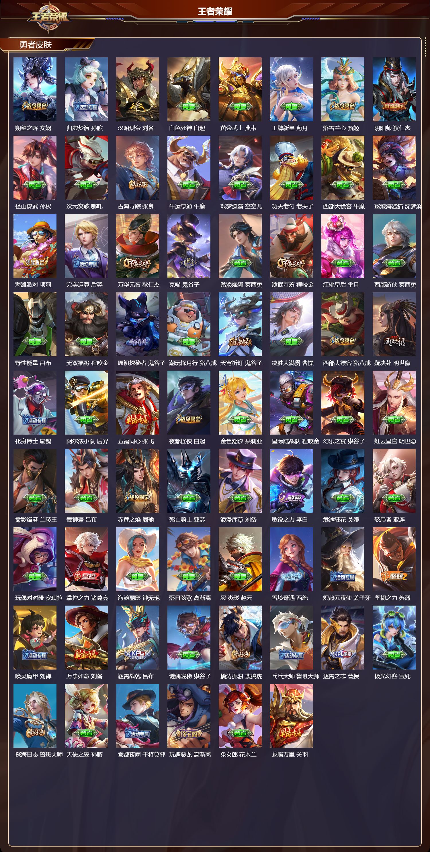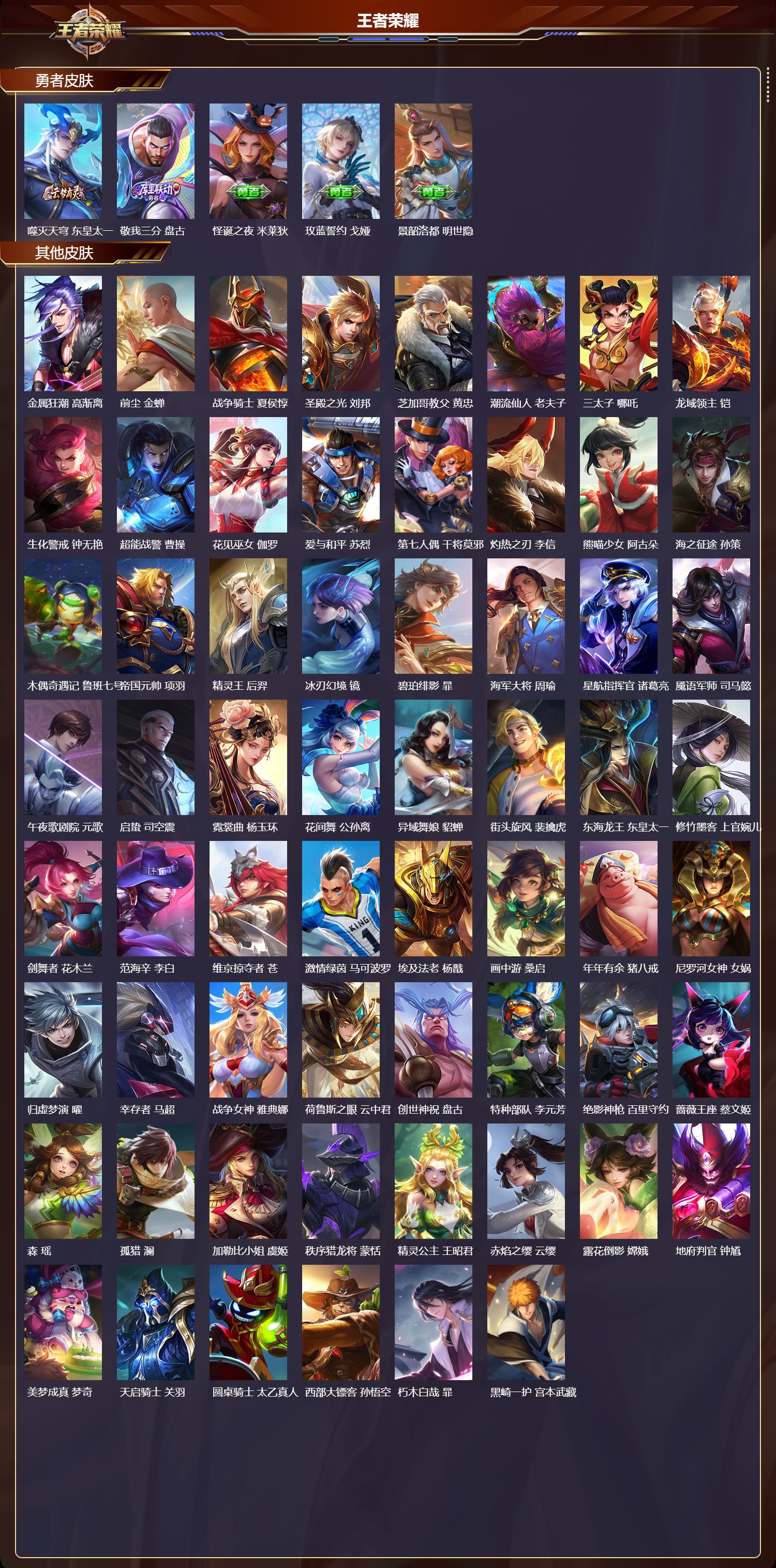 【164,勇者皮肤】时空谍影,海诺,玲珑珍味,西施,胡桃夹子,干将莫邪,圆桌骑士,盾山,爱心护理,阿轲,太极少年,赵怀真,沙漠行僧,达摩,大漠名商,沈梦溪,缤纷绘卷,张良,纽约教父,刘备,拳王,达摩,大发明家,达摩,龙舞盛年,沈梦溪,乐园追猎者,白起,丁香结,小乔,功夫炙烤,廉颇,铁甲之心,典韦,海盐诗旅,桑启,醍醐杖,老夫子,朔望之晖,女娲,归虚梦演,孙膑,汉昭烈帝,刘备,白色死神,白起,黄金武士,典韦,王牌新星,海月,落雪兰心,甄姬,阴阳师,狄仁杰,径山谋武,孙权,次元突破,哪吒,古海寻踪,张良,牛运亨通,牛魔,戏梦巡演,空空儿,功夫老勺,老夫子,西部大镖客,牛魔,鲨炮海盗猫,沈梦溪,海滩派对,项羽,完美运算,后羿,万华元夜,狄仁杰,克喵,鬼谷子,踏浪烽翎,莱西奥,演武夺筹,程咬金,红桃皇后,芈月,西部游侠,莱西奥,野性能量,吕布,无双福将,程咬金,原初探秘者,鬼谷子,潮玩探月行,猪八戒,天穹祈灯,鬼谷子,决胜大满贯,曹操,西部大镖客,猪八戒,疑决卦,明世隐,化身博士,扁鹊,阿尔法小队,后羿,五福同心,张飞,夜都怪侠,白起,金色潮汐,朵莉亚,星际陆战队,程咬金,幻乐之宴,鬼谷子,虹云星官,明世隐,雾影缉谜,兰陵王,舞狮寰,吕布,赤莲之焰,周瑜,死亡骑士,亚瑟,浪漫序章,刘备,敏锐之力,李白,危途狂花,戈娅,破局者,亚连,玩偶对对碰,安琪拉,掌控之力,诸葛亮,海滩丽影,钟无艳,落日弦歌,高渐离,忍·炎影,赵云,雪境奇遇,西施,炽热元素使,姜子牙,坚韧之力,苏烈,唤灵魔甲,刘禅,万事如意,刘备,逐霄战戟,吕布,谜偶窥秘,鬼谷子,擒涛扼浪,裴擒虎,乓乓大师,鲁班大师,逐霄之志,曹操,极光幻客,蚩奼,探海日志,鲁班大师,天使之翼,孙膑,雾都夜雨,干将莫邪,玩趣恶龙,高渐离,兔女郎,花木兰,龙腾万里,关羽,流音漫舞,艾琳,金庭之子,兰陵王,幻夜行动,兰陵王,未来纪元,宫本武藏,罗小黑战记,哪吒,千军破阵,苏烈,零食大作战,姬小满,荣光之誓,亚瑟,花好人间,甄姬,万象初新,宫本武藏,聚星闪耀,钟无艳,潮玩造梦师,刘备,单词大作战,雅典娜,时尚教父,姜子牙,春野之旅,钟无艳,秘密基地,刘禅,教廷特使,韩信,黑猫爱糖果,李元芳,街头霸王,韩信,云中旅人,李元芳,妄想特派,李元芳,西部大镖客,孙悟空,神迹守卫,墨子,进击墨子号,墨子,蔬乡物语,李元芳,少女阿狸,妲己,灵卜魔法,妲己,混沌棋,弈星,蔚蓝守将,蒙恬,春野闲踪,苏烈,契约魔法,米莱狄,布丁狗之约,阿古朵,暖冬·兔眠,嫦娥,午后时光,王昭君,幻想奇妙夜,王昭君,灵野札记,张良,驱傩正仪,钟馗,鸭鸭历险记,沈梦溪,命运角斗场,狂铁,死霸装,白起,特工战影,狂铁,虚灵犬护,钟馗,漠中幻影,嫦娥,白执事,赵云,劲辣红锅,太乙真人,神迹守卫,孙悟空,剑破天穹,刘邦,青衿临川,桑启,异域游侠,刘备,苍威无极,项羽,铁骨偃魂,典韦,熔金海岸,周瑜,苍林狼骑,苍,天穹之誓,姜子牙,魅影绮裳,影,长夏之忆,貂蝉,访茗客,马超,星梦巡礼,姜子牙,破阵·退雄兵,杨戬,谧流熔炉,太乙真人,群星魔术团,程咬金,经纬探寻者,盘古,暗都幽影,大司命,夏日便利店,虞姬,鹤鸣心笺,艾琳,锦麟游梦,庄周,逆浪荇歌,甄姬,海之女神,海月,线条小狗,周瑜,百相守梦,老夫子,噬灭天穹,东皇太一,敬我三分,盘古,怪诞之夜,米莱狄,玫蓝誓约,戈娅,景韶洛都,明世隐,