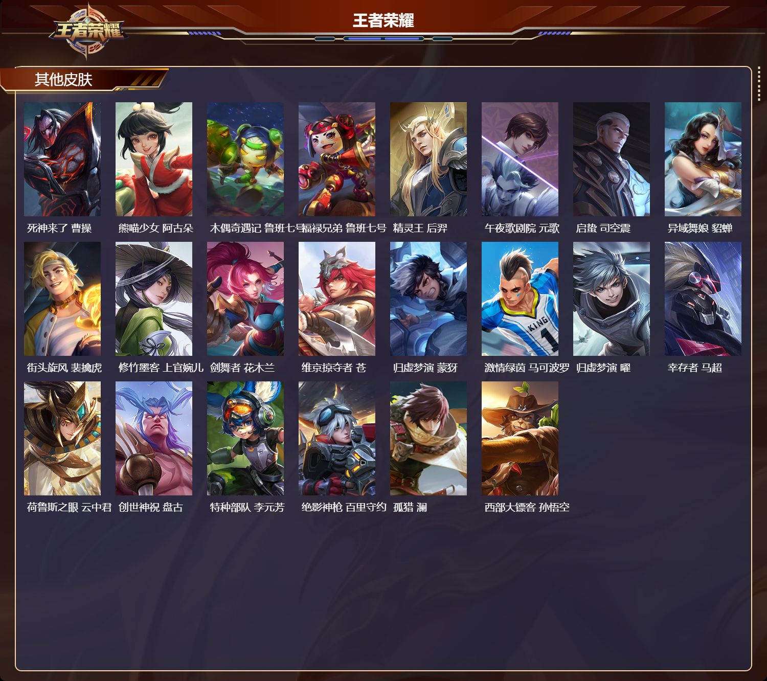 【24,其他皮肤】芝加哥教父,黄忠,龙域领主,铠,死神来了,曹操,熊喵少女,阿古朵,木偶奇遇记,鲁班七号,福禄兄弟,鲁班七号,精灵王,后羿,午夜歌剧院,元歌,启蛰,司空震,异域舞娘,貂蝉,街头旋风,裴擒虎,修竹墨客,上官婉儿,剑舞者,花木兰,维京掠夺者,苍,归虚梦演,蒙犽,激情绿茵,马可波罗,归虚梦演,曜,幸存者,马超,荷鲁斯之眼,云中君,创世神祝,盘古,特种部队,李元芳,绝影神枪,百里守约,孤猎,澜,西部大镖客,孙悟空,