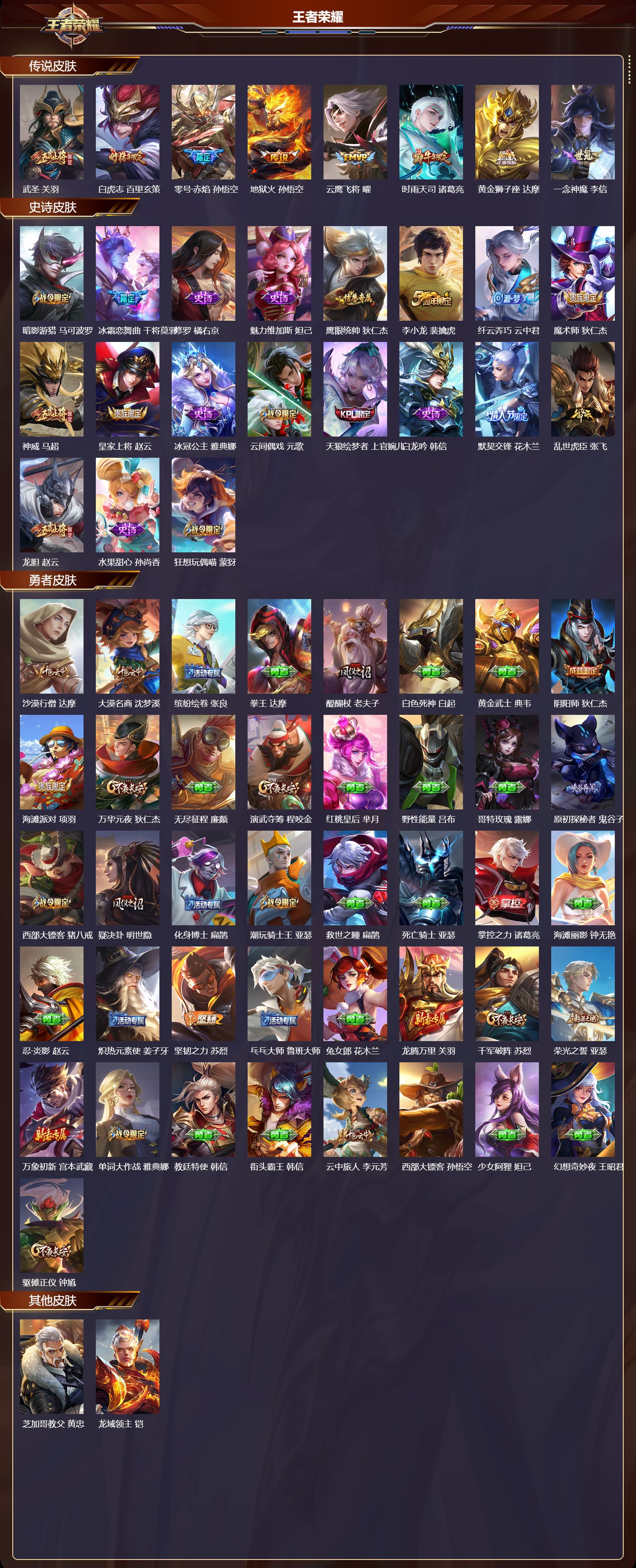 【41,勇者皮肤】沙漠行僧,达摩,大漠名商,沈梦溪,缤纷绘卷,张良,拳王,达摩,醍醐杖,老夫子,白色死神,白起,黄金武士,典韦,阴阳师,狄仁杰,海滩派对,项羽,万华元夜,狄仁杰,无尽征程,廉颇,演武夺筹,程咬金,红桃皇后,芈月,野性能量,吕布,哥特玫瑰,露娜,原初探秘者,鬼谷子,西部大镖客,猪八戒,疑决卦,明世隐,化身博士,扁鹊,潮玩骑士王,亚瑟,救世之瞳,扁鹊,死亡骑士,亚瑟,掌控之力,诸葛亮,海滩丽影,钟无艳,忍·炎影,赵云,炽热元素使,姜子牙,坚韧之力,苏烈,乓乓大师,鲁班大师,兔女郎,花木兰,龙腾万里,关羽,千军破阵,苏烈,荣光之誓,亚瑟,万象初新,宫本武藏,单词大作战,雅典娜,教廷特使,韩信,街头霸王,韩信,云中旅人,李元芳,西部大镖客,孙悟空,少女阿狸,妲己,幻想奇妙夜,王昭君,驱傩正仪,钟馗,