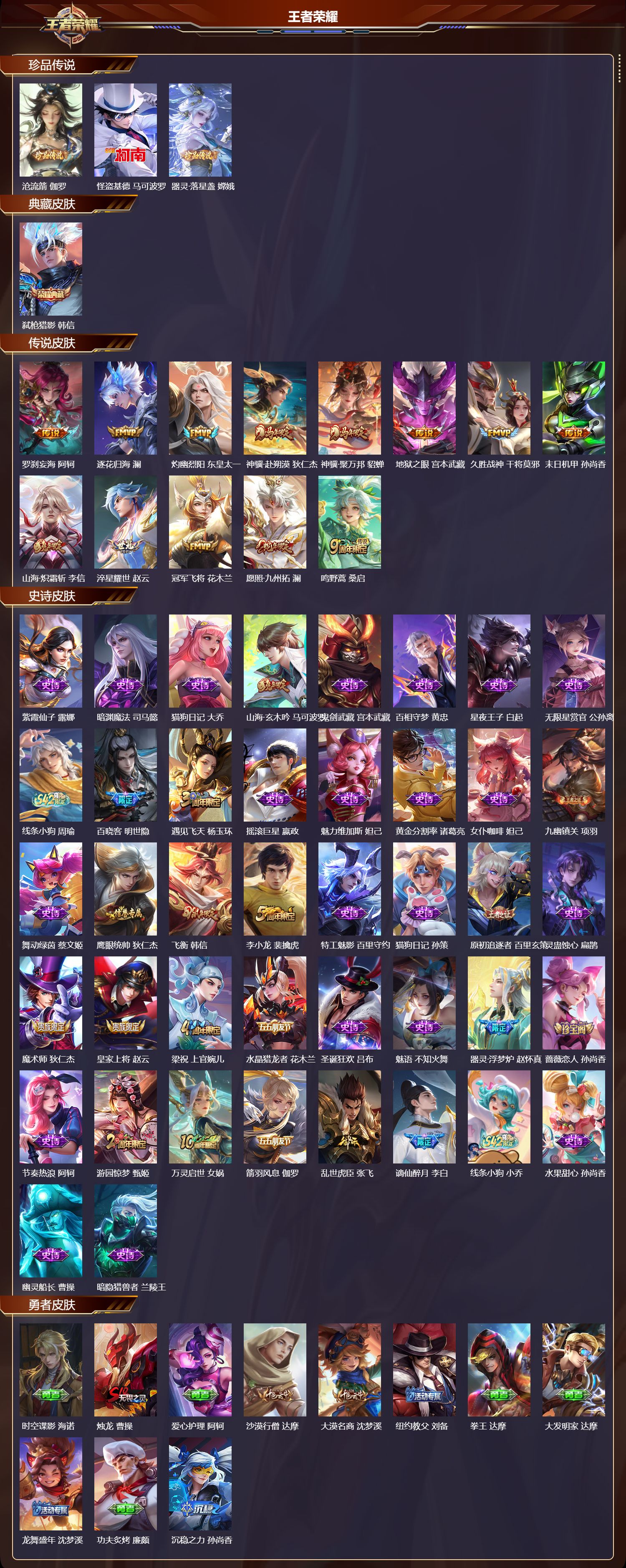 【42,史诗皮肤】紫霞仙子,露娜,暗渊魔法,司马懿,猫狗日记,大乔,山海·玄木吟,马可波罗,鬼剑武藏,宫本武藏,百相守梦,黄忠,星夜王子,白起,无限星赏官,公孙离,线条小狗,周瑜,百晓客,明世隐,遇见飞天,杨玉环,摇滚巨星,嬴政,魅力维加斯,妲己,黄金分割率,诸葛亮,女仆咖啡,妲己,九幽镇关,项羽,舞动绿茵,蔡文姬,鹰眼统帅,狄仁杰,飞衡,韩信,李小龙,裴擒虎,特工魅影,百里守约,猫狗日记,孙策,原初追逐者,百里玄策,灵蛊蚀心,扁鹊,魔术师,狄仁杰,皇家上将,赵云,梁祝,上官婉儿,水晶猎龙者,花木兰,圣诞狂欢,吕布,魅语,不知火舞,器灵·浮梦炉,赵怀真,蔷薇恋人,孙尚香,节奏热浪,阿轲,游园惊梦,甄姬,万灵启世,女娲,箭羽风息,伽罗,乱世虎臣,张飞,谪仙醉月,李白,线条小狗,小乔,水果甜心,孙尚香,幽灵船长,曹操,暗隐猎兽者,兰陵王,