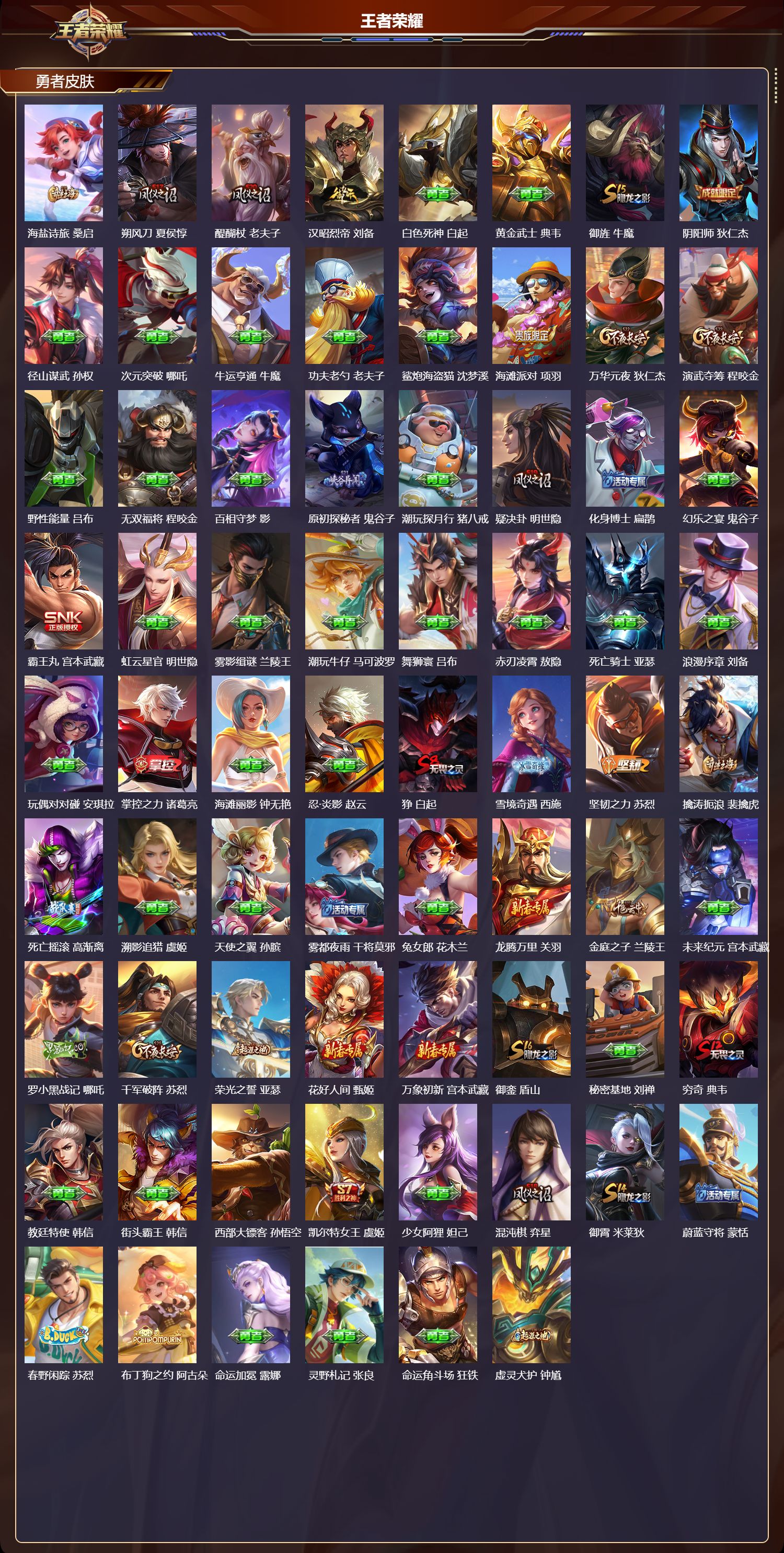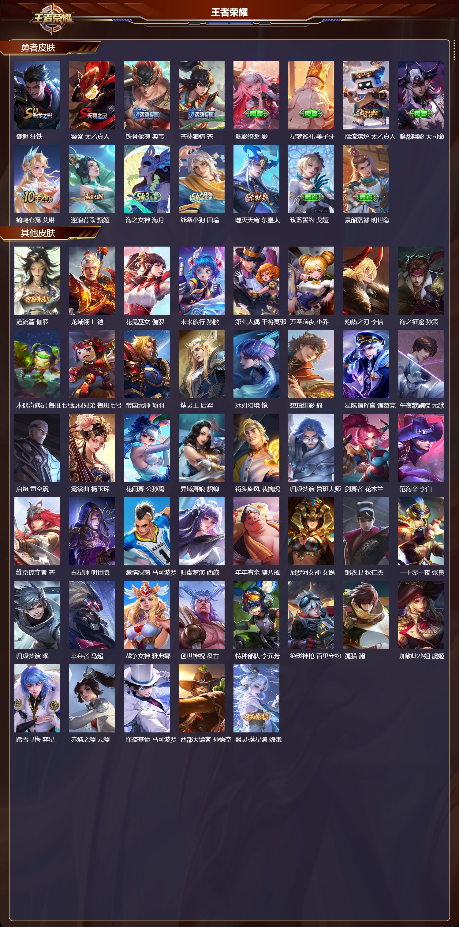 【96,勇者皮肤】时空谍影,海诺,烛龙,曹操,爱心护理,阿轲,沙漠行僧,达摩,大漠名商,沈梦溪,纽约教父,刘备,拳王,达摩,大发明家,达摩,龙舞盛年,沈梦溪,功夫炙烤,廉颇,沉稳之力,孙尚香,海盐诗旅,桑启,朔风刀,夏侯惇,醍醐杖,老夫子,汉昭烈帝,刘备,白色死神,白起,黄金武士,典韦,御旌,牛魔,阴阳师,狄仁杰,径山谋武,孙权,次元突破,哪吒,牛运亨通,牛魔,功夫老勺,老夫子,鲨炮海盗猫,沈梦溪,海滩派对,项羽,万华元夜,狄仁杰,演武夺筹,程咬金,野性能量,吕布,无双福将,程咬金,百相守梦,影,原初探秘者,鬼谷子,潮玩探月行,猪八戒,疑决卦,明世隐,化身博士,扁鹊,幻乐之宴,鬼谷子,霸王丸,宫本武藏,虹云星官,明世隐,雾影缉谜,兰陵王,潮玩牛仔,马可波罗,舞狮寰,吕布,赤刃凌霄,敖隐,死亡骑士,亚瑟,浪漫序章,刘备,玩偶对对碰,安琪拉,掌控之力,诸葛亮,海滩丽影,钟无艳,忍·炎影,赵云,狰,白起,雪境奇遇,西施,坚韧之力,苏烈,擒涛扼浪,裴擒虎,死亡摇滚,高渐离,溯影追猎,虞姬,天使之翼,孙膑,雾都夜雨,干将莫邪,兔女郎,花木兰,龙腾万里,关羽,金庭之子,兰陵王,未来纪元,宫本武藏,罗小黑战记,哪吒,千军破阵,苏烈,荣光之誓,亚瑟,花好人间,甄姬,万象初新,宫本武藏,御銮,盾山,秘密基地,刘禅,穷奇,典韦,教廷特使,韩信,街头霸王,韩信,西部大镖客,孙悟空,凯尔特女王,虞姬,少女阿狸,妲己,混沌棋,弈星,御霄,米莱狄,蔚蓝守将,蒙恬,春野闲踪,苏烈,布丁狗之约,阿古朵,命运加冕,露娜,灵野札记,张良,命运角斗场,狂铁,虚灵犬护,钟馗,御狮,狂铁,饕餮,太乙真人,铁骨偃魂,典韦,苍林狼骑,苍,魅影绮裳,影,星梦巡礼,姜子牙,谧流熔炉,太乙真人,暗都幽影,大司命,鹤鸣心笺,艾琳,逆浪荇歌,甄姬,海之女神,海月,线条小狗,周瑜,噬灭天穹,东皇太一,玫蓝誓约,戈娅,景韶洛都,明世隐,