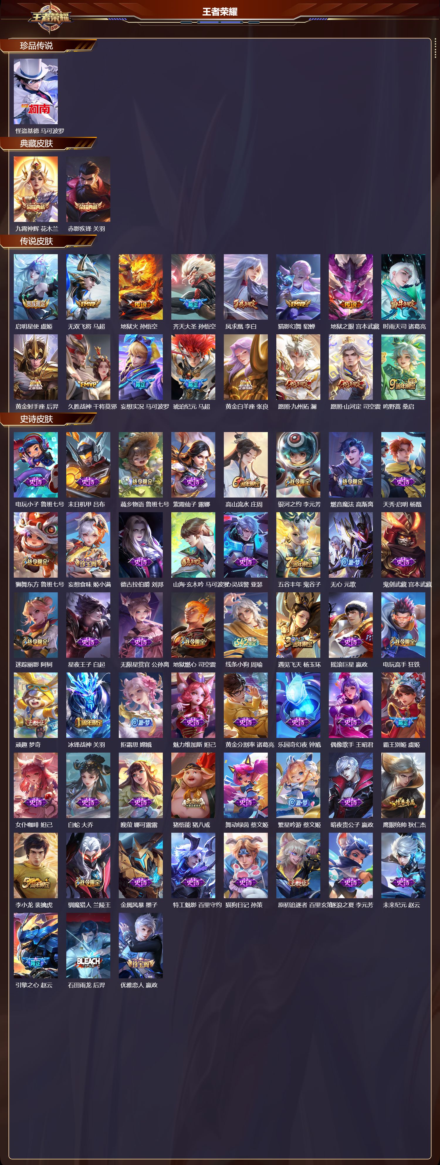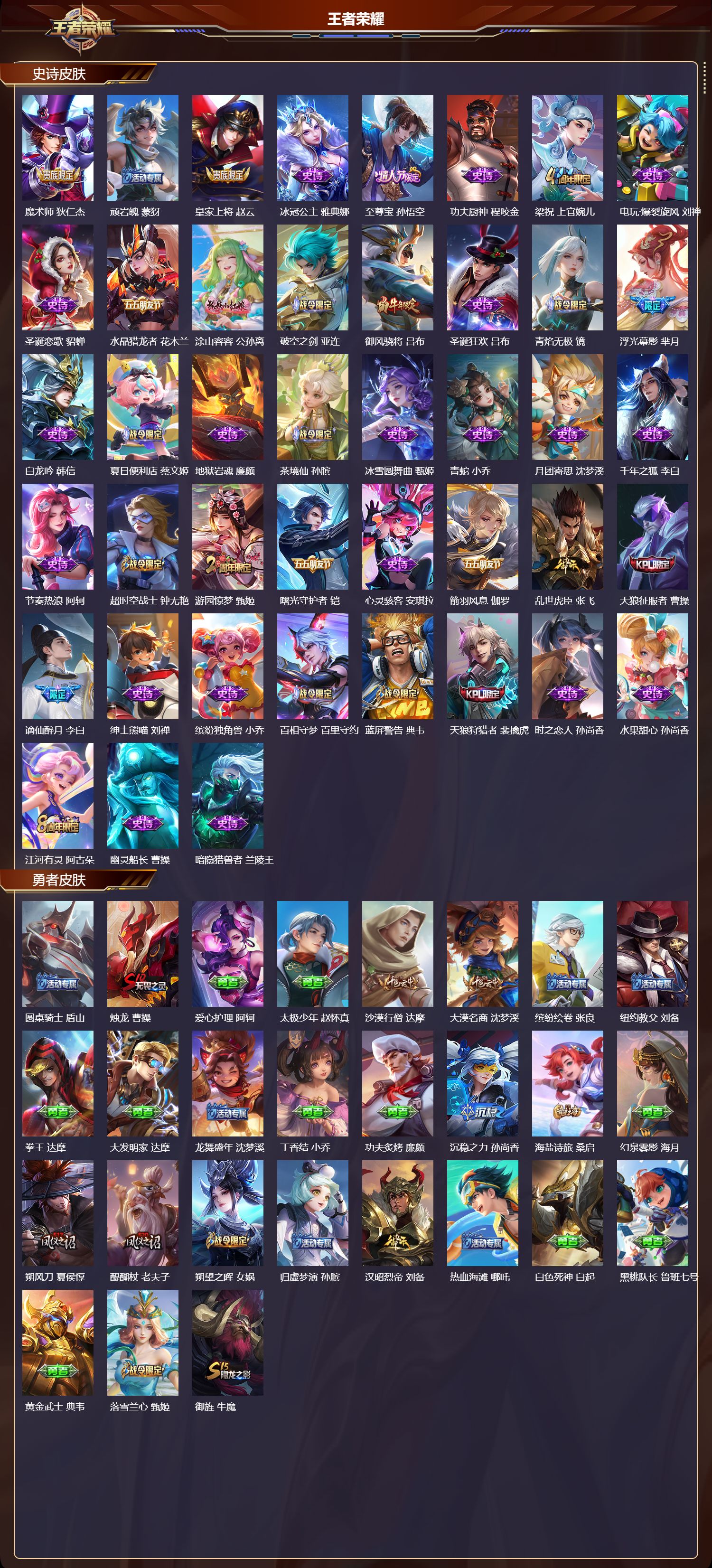 【94,史诗皮肤】电玩小子,鲁班七号,末日机甲,吕布,蔬乡物语,鲁班七号,紫霞仙子,露娜,高山流水,庄周,银河之约,李元芳,燃音魔法,高渐离,天秀·启明,杨戬,狮舞东方,鲁班七号,妄想食味,姬小满,德古拉伯爵,刘邦,山海·玄木吟,马可波罗,心灵战警,亚瑟,五谷丰年,鬼谷子,无心,元歌,鬼剑武藏,宫本武藏,迷踪丽影,阿轲,星夜王子,白起,无限星赏官,公孙离,地狱燃心,司空震,线条小狗,周瑜,遇见飞天,杨玉环,摇滚巨星,嬴政,电玩高手,狂铁,顽趣,梦奇,冰锋战神,关羽,拒霜思,嫦娥,魅力维加斯,妲己,黄金分割率,诸葛亮,乐园奇幻夜,钟馗,偶像歌手,王昭君,霸王别姬,虞姬,女仆咖啡,妲己,白蛇,大乔,晚萤,娜可露露,猪悟能,猪八戒,舞动绿茵,蔡文姬,繁星吟游,蔡文姬,暗夜贵公子,嬴政,鹰眼统帅,狄仁杰,李小龙,裴擒虎,驯魔猎人,兰陵王,金属风暴,墨子,特工魅影,百里守约,猫狗日记,孙策,原初追逐者,百里玄策,逐浪之夏,李元芳,未来纪元,赵云,引擎之心,赵云,石田雨龙,后羿,优雅恋人,嬴政,魔术师,狄仁杰,顽岩魄,蒙犽,皇家上将,赵云,冰冠公主,雅典娜,至尊宝,孙悟空,功夫厨神,程咬金,梁祝,上官婉儿,电玩·爆裂旋风,刘禅,圣诞恋歌,貂蝉,水晶猎龙者,花木兰,涂山容容,公孙离,破空之剑,亚连,御风骁将,吕布,圣诞狂欢,吕布,青焰无极,镜,浮光幕影,芈月,白龙吟,韩信,夏日便利店,蔡文姬,地狱岩魂,廉颇,茶境仙,孙膑,冰雪圆舞曲,甄姬,青蛇,小乔,月团寄思,沈梦溪,千年之狐,李白,节奏热浪,阿轲,超时空战士,钟无艳,游园惊梦,甄姬,曙光守护者,铠,心灵骇客,安琪拉,箭羽风息,伽罗,乱世虎臣,张飞,天狼征服者,曹操,谪仙醉月,李白,绅士熊喵,刘禅,缤纷独角兽,小乔,百相守梦,百里守约,蓝屏警告,典韦,天狼狩猎者,裴擒虎,时之恋人,孙尚香,水果甜心,孙尚香,江河有灵,阿古朵,幽灵船长,曹操,暗隐猎兽者,兰陵王,