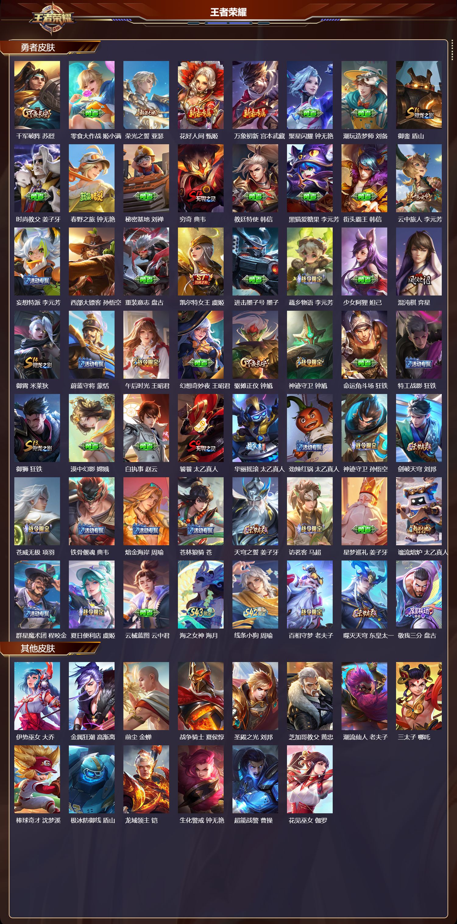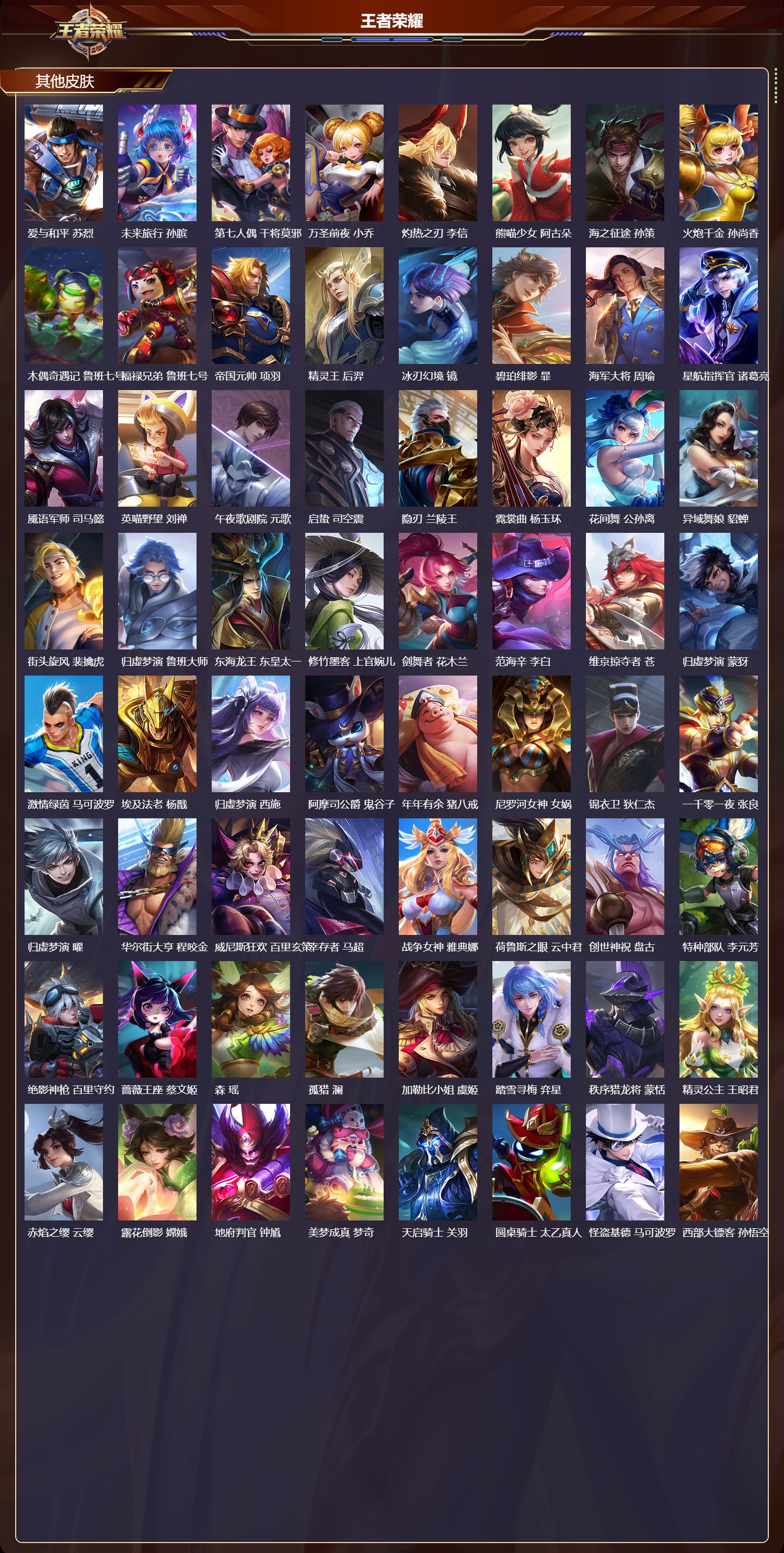 【78,其他皮肤】伊势巫女,大乔,金属狂潮,高渐离,前尘,金蝉,战争骑士,夏侯惇,圣殿之光,刘邦,芝加哥教父,黄忠,潮流仙人,老夫子,三太子,哪吒,棒球奇才,沈梦溪,极冰防御线,盾山,龙域领主,铠,生化警戒,钟无艳,超能战警,曹操,花见巫女,伽罗,爱与和平,苏烈,未来旅行,孙膑,第七人偶,干将莫邪,万圣前夜,小乔,灼热之刃,李信,熊喵少女,阿古朵,海之征途,孙策,火炮千金,孙尚香,木偶奇遇记,鲁班七号,福禄兄弟,鲁班七号,帝国元帅,项羽,精灵王,后羿,冰刃幻境,镜,碧珀绯影,暃,海军大将,周瑜,星航指挥官,诸葛亮,魇语军师,司马懿,英喵野望,刘禅,午夜歌剧院,元歌,启蛰,司空震,隐刃,兰陵王,霓裳曲,杨玉环,花间舞,公孙离,异域舞娘,貂蝉,街头旋风,裴擒虎,归虚梦演,鲁班大师,东海龙王,东皇太一,修竹墨客,上官婉儿,剑舞者,花木兰,范海辛,李白,维京掠夺者,苍,归虚梦演,蒙犽,激情绿茵,马可波罗,埃及法老,杨戬,归虚梦演,西施,阿摩司公爵,鬼谷子,年年有余,猪八戒,尼罗河女神,女娲,锦衣卫,狄仁杰,一千零一夜,张良,归虚梦演,曜,华尔街大亨,程咬金,威尼斯狂欢,百里玄策,幸存者,马超,战争女神,雅典娜,荷鲁斯之眼,云中君,创世神祝,盘古,特种部队,李元芳,绝影神枪,百里守约,蔷薇王座,蔡文姬,森,瑶,孤猎,澜,加勒比小姐,虞姬,踏雪寻梅,弈星,秩序猎龙将,蒙恬,精灵公主,王昭君,赤焰之缨,云缨,露花倒影,嫦娥,地府判官,钟馗,美梦成真,梦奇,天启骑士,关羽,圆桌骑士,太乙真人,怪盗基德,马可波罗,西部大镖客,孙悟空,