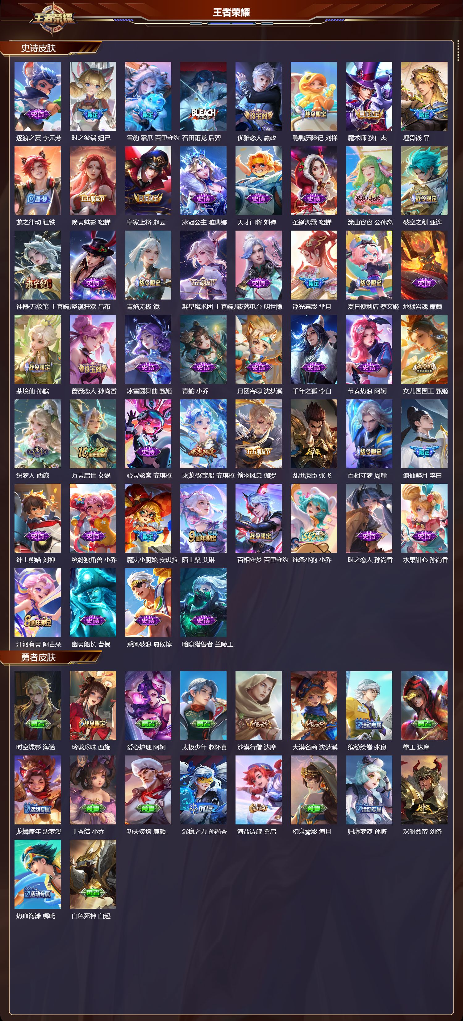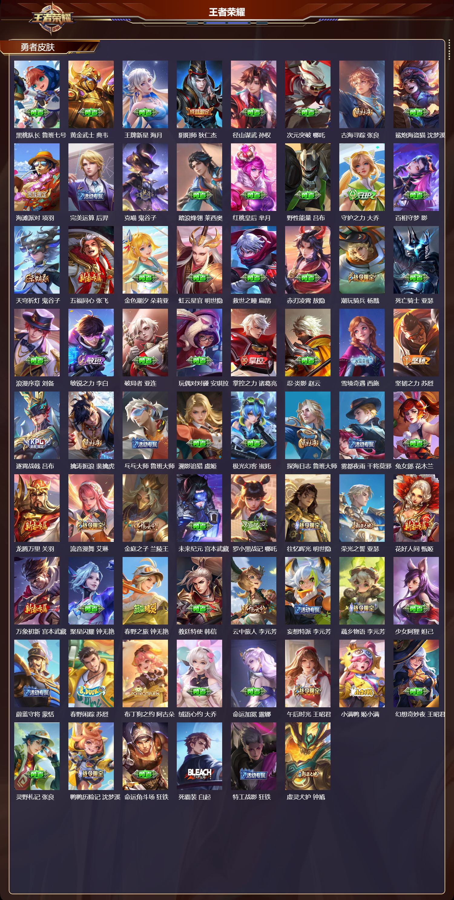 【120,勇者皮肤】时空谍影,海诺,玲珑珍味,西施,爱心护理,阿轲,太极少年,赵怀真,沙漠行僧,达摩,大漠名商,沈梦溪,缤纷绘卷,张良,拳王,达摩,龙舞盛年,沈梦溪,丁香结,小乔,功夫炙烤,廉颇,沉稳之力,孙尚香,海盐诗旅,桑启,幻泉雾影,海月,归虚梦演,孙膑,汉昭烈帝,刘备,热血海滩,哪吒,白色死神,白起,黑桃队长,鲁班七号,黄金武士,典韦,王牌新星,海月,阴阳师,狄仁杰,径山谋武,孙权,次元突破,哪吒,古海寻踪,张良,鲨炮海盗猫,沈梦溪,海滩派对,项羽,完美运算,后羿,克喵,鬼谷子,踏浪烽翎,莱西奥,红桃皇后,芈月,野性能量,吕布,守护之力,大乔,百相守梦,影,天穹祈灯,鬼谷子,五福同心,张飞,金色潮汐,朵莉亚,虹云星官,明世隐,救世之瞳,扁鹊,赤刃凌霄,敖隐,潮玩骑兵,杨戬,死亡骑士,亚瑟,浪漫序章,刘备,敏锐之力,李白,破局者,亚连,玩偶对对碰,安琪拉,掌控之力,诸葛亮,忍·炎影,赵云,雪境奇遇,西施,坚韧之力,苏烈,逐霄战戟,吕布,擒涛扼浪,裴擒虎,乓乓大师,鲁班大师,溯影追猎,虞姬,极光幻客,蚩奼,探海日志,鲁班大师,雾都夜雨,干将莫邪,兔女郎,花木兰,龙腾万里,关羽,流音漫舞,艾琳,金庭之子,兰陵王,未来纪元,宫本武藏,罗小黑战记,哪吒,往忆晖光,明世隐,荣光之誓,亚瑟,花好人间,甄姬,万象初新,宫本武藏,聚星闪耀,钟无艳,春野之旅,钟无艳,教廷特使,韩信,云中旅人,李元芳,妄想特派,李元芳,蔬乡物语,李元芳,少女阿狸,妲己,蔚蓝守将,蒙恬,春野闲踪,苏烈,布丁狗之约,阿古朵,绒语心约,大乔,命运加冕,露娜,午后时光,王昭君,小满鸭,姬小满,幻想奇妙夜,王昭君,灵野札记,张良,鸭鸭历险记,沈梦溪,命运角斗场,狂铁,死霸装,白起,特工战影,狂铁,虚灵犬护,钟馗,漠中幻影,嫦娥,白执事,赵云,劲辣红锅,太乙真人,神迹守卫,孙悟空,罗小黑战记,张良,剑破天穹,刘邦,异域游侠,刘备,苍威无极,项羽,铁骨偃魂,典韦,熔金海岸,周瑜,苍林狼骑,苍,天穹之誓,姜子牙,魅影绮裳,影,长夏之忆,貂蝉,访茗客,马超,星梦巡礼,姜子牙,谧流熔炉,太乙真人,群星魔术团,程咬金,暗都幽影,大司命,夏日便利店,虞姬,鹤鸣心笺,艾琳,锦麟游梦,庄周,逆浪荇歌,甄姬,百相守梦,孙策,海之女神,海月,线条小狗,周瑜,线条小狗,桑启,百相守梦,老夫子,噬灭天穹,东皇太一,灵卦秘语,少司缘,怪诞之夜,米莱狄,玫蓝誓约,戈娅,