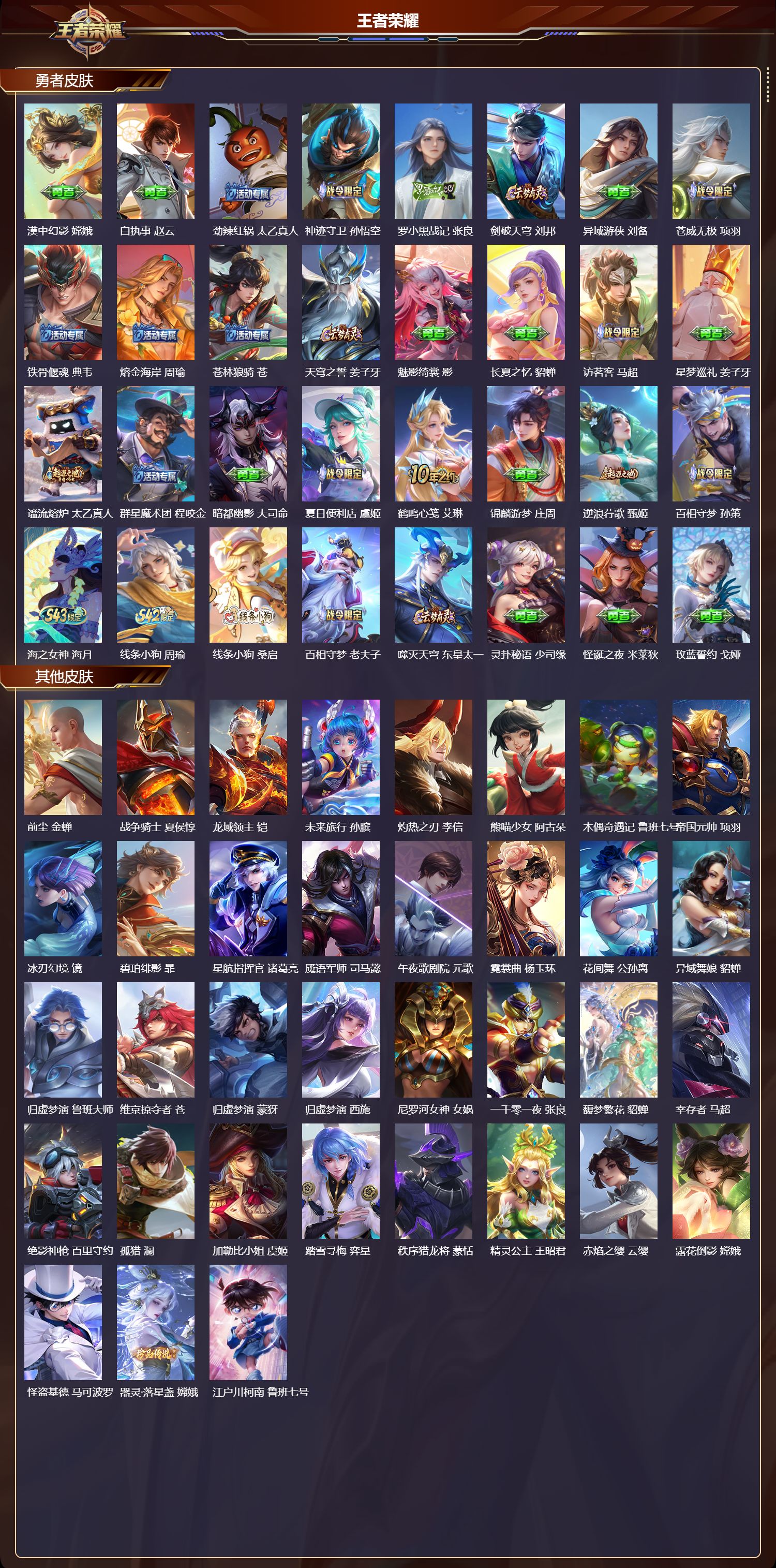 【35,其他皮肤】前尘,金蝉,战争骑士,夏侯惇,龙域领主,铠,未来旅行,孙膑,灼热之刃,李信,熊喵少女,阿古朵,木偶奇遇记,鲁班七号,帝国元帅,项羽,冰刃幻境,镜,碧珀绯影,暃,星航指挥官,诸葛亮,魇语军师,司马懿,午夜歌剧院,元歌,霓裳曲,杨玉环,花间舞,公孙离,异域舞娘,貂蝉,归虚梦演,鲁班大师,维京掠夺者,苍,归虚梦演,蒙犽,归虚梦演,西施,尼罗河女神,女娲,一千零一夜,张良,馥梦繁花,貂蝉,幸存者,马超,绝影神枪,百里守约,孤猎,澜,加勒比小姐,虞姬,踏雪寻梅,弈星,秩序猎龙将,蒙恬,精灵公主,王昭君,赤焰之缨,云缨,露花倒影,嫦娥,怪盗基德,马可波罗,器灵·落星盏,嫦娥,江户川柯南,鲁班七号,
