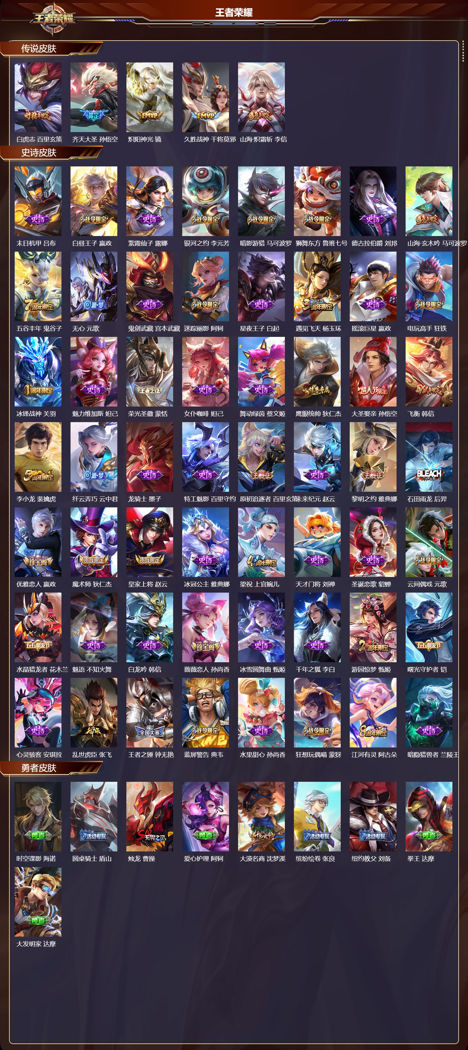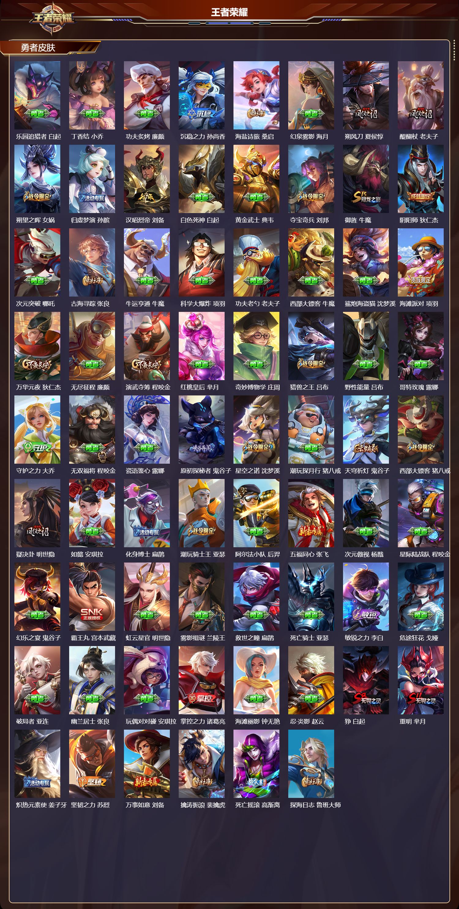 【114,勇者皮肤】时空谍影,海诺,圆桌骑士,盾山,烛龙,曹操,爱心护理,阿轲,大漠名商,沈梦溪,缤纷绘卷,张良,纽约教父,刘备,拳王,达摩,大发明家,达摩,乐园追猎者,白起,丁香结,小乔,功夫炙烤,廉颇,沉稳之力,孙尚香,海盐诗旅,桑启,幻泉雾影,海月,朔风刀,夏侯惇,醍醐杖,老夫子,朔望之晖,女娲,归虚梦演,孙膑,汉昭烈帝,刘备,白色死神,白起,黄金武士,典韦,夺宝奇兵,刘邦,御旌,牛魔,阴阳师,狄仁杰,次元突破,哪吒,古海寻踪,张良,牛运亨通,牛魔,科学大爆炸,项羽,功夫老勺,老夫子,西部大镖客,牛魔,鲨炮海盗猫,沈梦溪,海滩派对,项羽,万华元夜,狄仁杰,无尽征程,廉颇,演武夺筹,程咬金,红桃皇后,芈月,奇妙博物学,庄周,猎兽之王,吕布,野性能量,吕布,哥特玫瑰,露娜,守护之力,大乔,无双福将,程咬金,瓷语鉴心,露娜,原初探秘者,鬼谷子,星空之诺,沈梦溪,潮玩探月行,猪八戒,天穹祈灯,鬼谷子,西部大镖客,猪八戒,疑决卦,明世隐,如懿,安琪拉,化身博士,扁鹊,潮玩骑士王,亚瑟,阿尔法小队,后羿,五福同心,张飞,次元傲视,杨戬,星际陆战队,程咬金,幻乐之宴,鬼谷子,霸王丸,宫本武藏,虹云星官,明世隐,雾影缉谜,兰陵王,救世之瞳,扁鹊,死亡骑士,亚瑟,敏锐之力,李白,危途狂花,戈娅,破局者,亚连,幽兰居士,张良,玩偶对对碰,安琪拉,掌控之力,诸葛亮,海滩丽影,钟无艳,忍·炎影,赵云,狰,白起,重明,芈月,炽热元素使,姜子牙,坚韧之力,苏烈,万事如意,刘备,擒涛扼浪,裴擒虎,死亡摇滚,高渐离,探海日志,鲁班大师,天使之翼,孙膑,兔女郎,花木兰,龙腾万里,关羽,金庭之子,兰陵王,未来纪元,宫本武藏,千军破阵,苏烈,花好人间,甄姬,万象初新,宫本武藏,潮玩造梦师,刘备,御銮,盾山,单词大作战,雅典娜,时尚教父,姜子牙,秘密基地,刘禅,教廷特使,韩信,街头霸王,韩信,云中旅人,李元芳,妄想特派,李元芳,西部大镖客,孙悟空,凯尔特女王,虞姬,少女阿狸,妲己,混沌棋,弈星,御霄,米莱狄,蔚蓝守将,蒙恬,午后时光,王昭君,幻想奇妙夜,王昭君,驱傩正仪,钟馗,神迹守卫,钟馗,命运角斗场,狂铁,御狮,狂铁,饕餮,太乙真人,劲辣红锅,太乙真人,剑破天穹,刘邦,星梦巡礼,姜子牙,海之女神,海月,噬灭天穹,东皇太一,