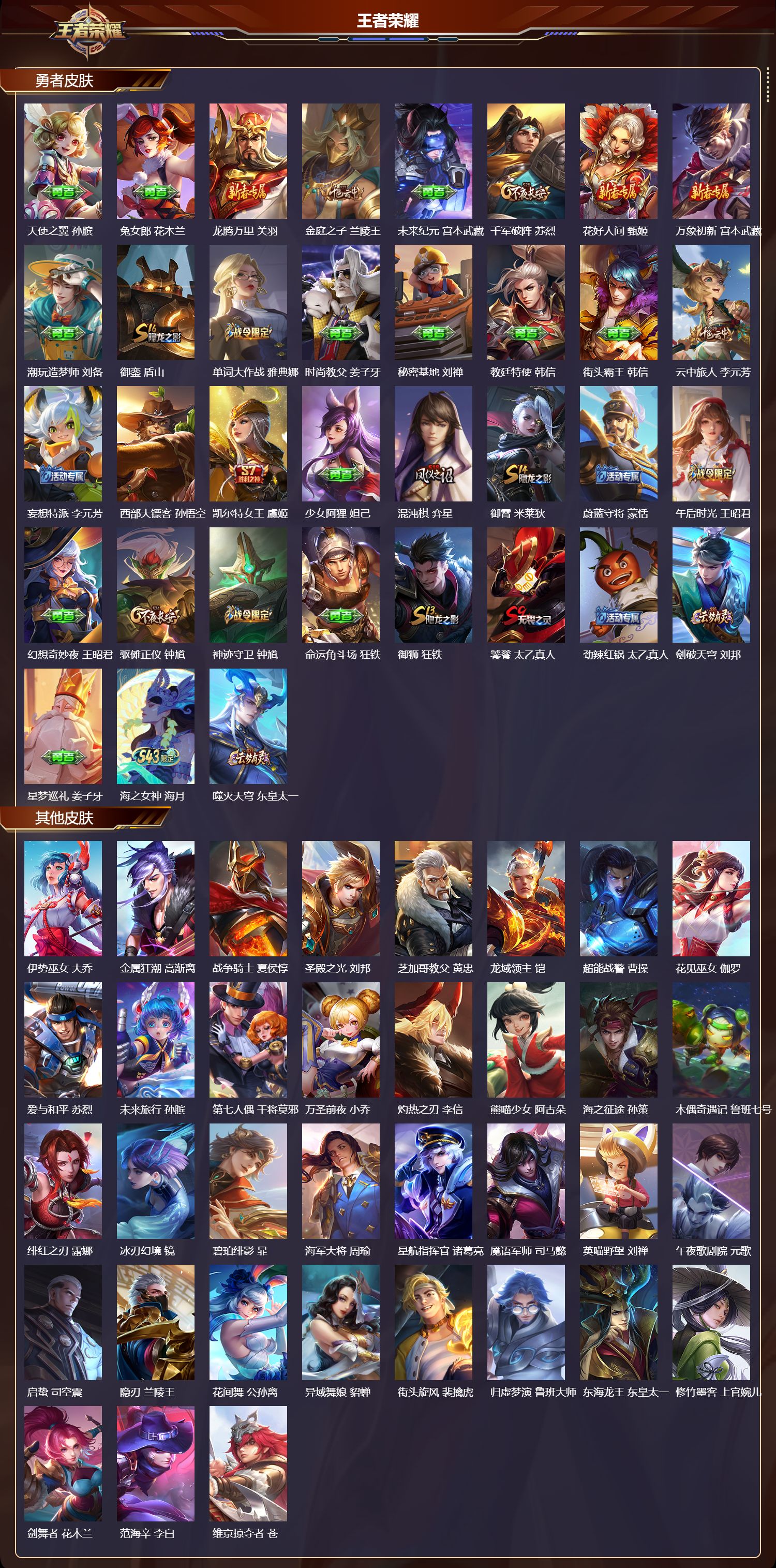 【63,其他皮肤】伊势巫女,大乔,金属狂潮,高渐离,战争骑士,夏侯惇,圣殿之光,刘邦,芝加哥教父,黄忠,龙域领主,铠,超能战警,曹操,花见巫女,伽罗,爱与和平,苏烈,未来旅行,孙膑,第七人偶,干将莫邪,万圣前夜,小乔,灼热之刃,李信,熊喵少女,阿古朵,海之征途,孙策,木偶奇遇记,鲁班七号,绯红之刃,露娜,冰刃幻境,镜,碧珀绯影,暃,海军大将,周瑜,星航指挥官,诸葛亮,魇语军师,司马懿,英喵野望,刘禅,午夜歌剧院,元歌,启蛰,司空震,隐刃,兰陵王,花间舞,公孙离,异域舞娘,貂蝉,街头旋风,裴擒虎,归虚梦演,鲁班大师,东海龙王,东皇太一,修竹墨客,上官婉儿,剑舞者,花木兰,范海辛,李白,维京掠夺者,苍,归虚梦演,蒙犽,激情绿茵,马可波罗,埃及法老,杨戬,阿摩司公爵,鬼谷子,画中游,桑启,年年有余,猪八戒,尼罗河女神,女娲,锦衣卫,狄仁杰,归虚梦演,曜,华尔街大亨,程咬金,威尼斯狂欢,百里玄策,幸存者,马超,战争女神,雅典娜,荷鲁斯之眼,云中君,创世神祝,盘古,特种部队,李元芳,绝影神枪,百里守约,蔷薇王座,蔡文姬,森,瑶,孤猎,澜,踏雪寻梅,弈星,秩序猎龙将,蒙恬,精准探案法,米莱狄,赤焰之缨,云缨,露花倒影,嫦娥,美梦成真,梦奇,圆桌骑士,太乙真人,西部大镖客,孙悟空,