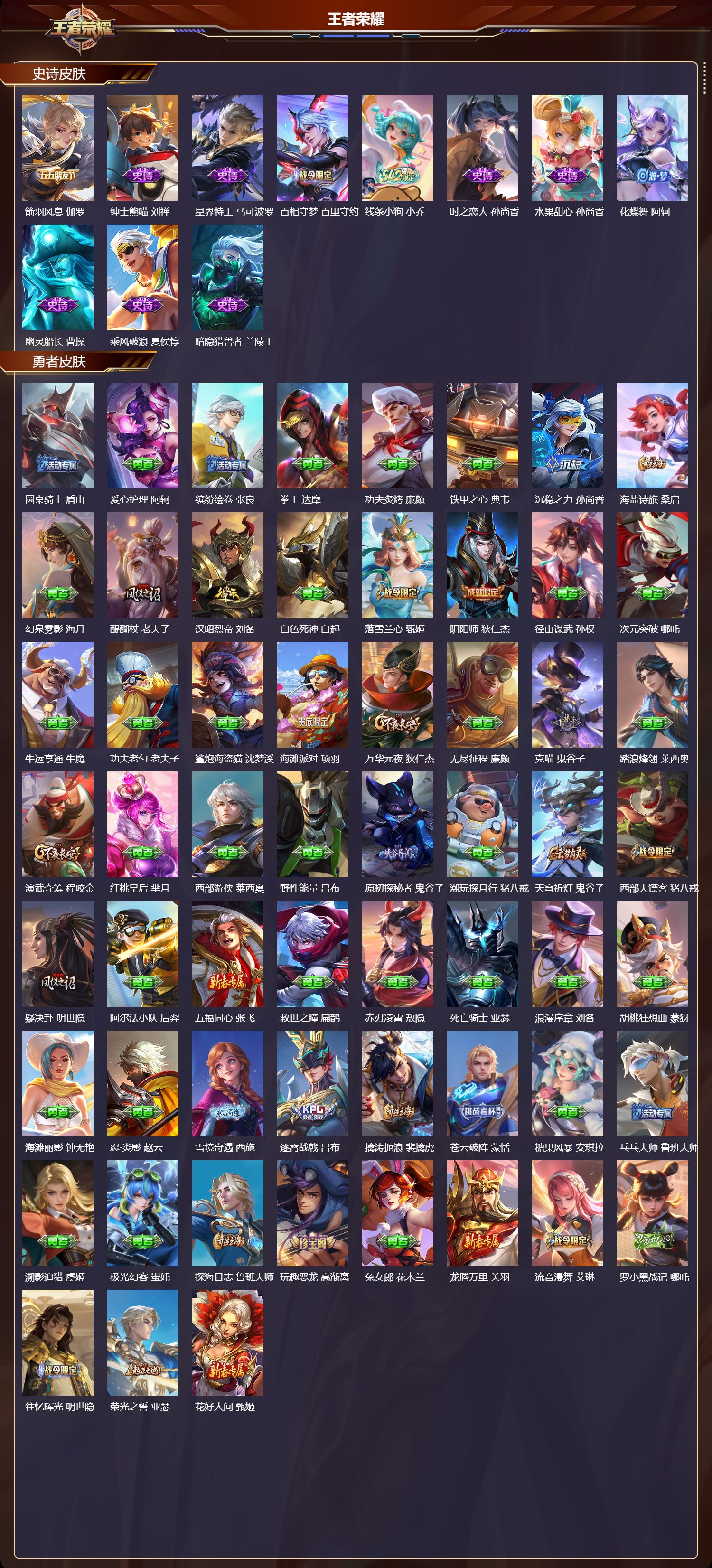 【68,史诗皮肤】电玩小子,鲁班七号,末日机甲,吕布,紫霞仙子,露娜,暗影游猎,马可波罗,冰霜恋舞曲,干将莫邪,猫狗日记,大乔,德古拉伯爵,刘邦,心灵战警,亚瑟,无心,元歌,巫礼祀神,少司缘,鬼剑武藏,宫本武藏,星夜王子,白起,无限星赏官,公孙离,线条小狗,周瑜,黄金分割率,诸葛亮,偶像歌手,王昭君,女仆咖啡,妲己,白蛇,大乔,九幽镇关,项羽,晚萤,娜可露露,繁星吟游,蔡文姬,鹰眼统帅,狄仁杰,傩神司,兰陵王,李小龙,裴擒虎,光弋星穹,莱西奥,特工魅影,百里守约,原初追逐者,百里玄策,逐浪之夏,李元芳,未来纪元,赵云,雪豹·霜爪,百里守约,魔术师,狄仁杰,龙之律动,狂铁,顽岩魄,蒙犽,皇家上将,赵云,冰冠公主,雅典娜,至尊宝,孙悟空,辉光之辰,后羿,功夫厨神,程咬金,圣诞恋歌,貂蝉,水晶猎龙者,花木兰,涂山容容,公孙离,破空之剑,亚连,烈魂,黄忠,御风骁将,吕布,圣诞狂欢,吕布,魅语,不知火舞,浮光幕影,芈月,罗小黑战记,百里玄策,夏日便利店,蔡文姬,茶境仙,孙膑,蔷薇恋人,孙尚香,冰雪圆舞曲,甄姬,千年之狐,李白,节奏热浪,阿轲,曙光守护者,铠,万灵启世,女娲,乘龙·聚宝船,安琪拉,箭羽风息,伽罗,绅士熊喵,刘禅,星界特工,马可波罗,百相守梦,百里守约,线条小狗,小乔,时之恋人,孙尚香,水果甜心,孙尚香,化蝶舞,阿轲,幽灵船长,曹操,乘风破浪,夏侯惇,暗隐猎兽者,兰陵王,