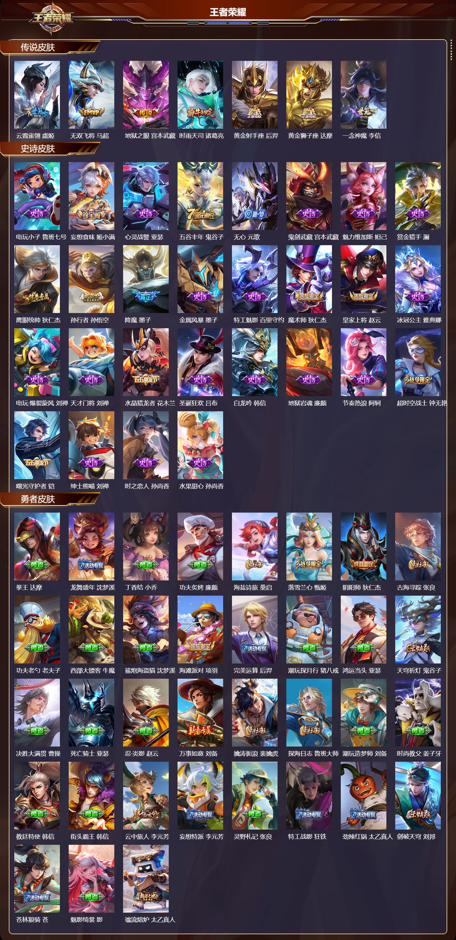 【37,勇者皮肤】拳王,达摩,龙舞盛年,沈梦溪,丁香结,小乔,功夫炙烤,廉颇,海盐诗旅,桑启,落雪兰心,甄姬,阴阳师,狄仁杰,古海寻踪,张良,功夫老勺,老夫子,西部大镖客,牛魔,鲨炮海盗猫,沈梦溪,海滩派对,项羽,完美运算,后羿,潮玩探月行,猪八戒,鸿运当头,亚瑟,天穹祈灯,鬼谷子,决胜大满贯,曹操,死亡骑士,亚瑟,忍·炎影,赵云,万事如意,刘备,擒涛扼浪,裴擒虎,探海日志,鲁班大师,潮玩造梦师,刘备,时尚教父,姜子牙,教廷特使,韩信,街头霸王,韩信,云中旅人,李元芳,妄想特派,李元芳,灵野札记,张良,特工战影,狂铁,劲辣红锅,太乙真人,剑破天穹,刘邦,苍林狼骑,苍,魅影绮裳,影,谧流熔炉,太乙真人,鹤鸣心笺,艾琳,噬灭天穹,东皇太一,