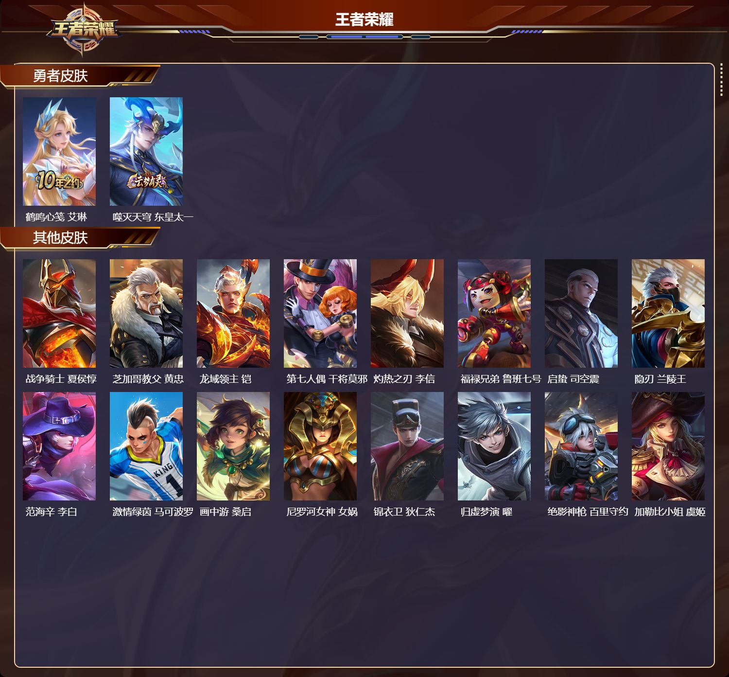 【16,其他皮肤】战争骑士,夏侯惇,芝加哥教父,黄忠,龙域领主,铠,第七人偶,干将莫邪,灼热之刃,李信,福禄兄弟,鲁班七号,启蛰,司空震,隐刃,兰陵王,范海辛,李白,激情绿茵,马可波罗,画中游,桑启,尼罗河女神,女娲,锦衣卫,狄仁杰,归虚梦演,曜,绝影神枪,百里守约,加勒比小姐,虞姬,