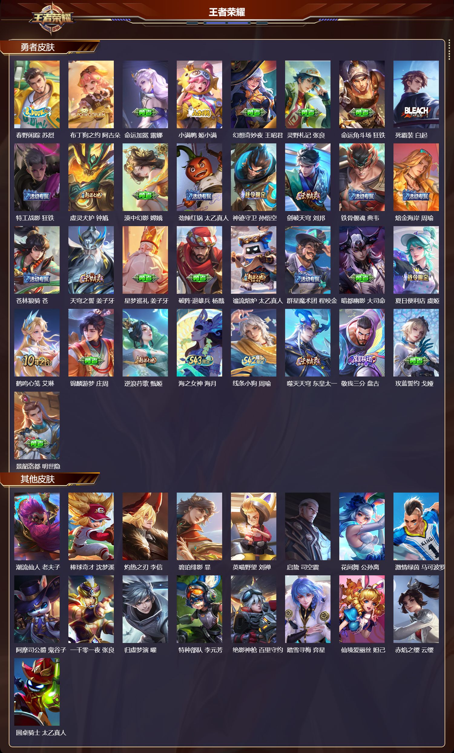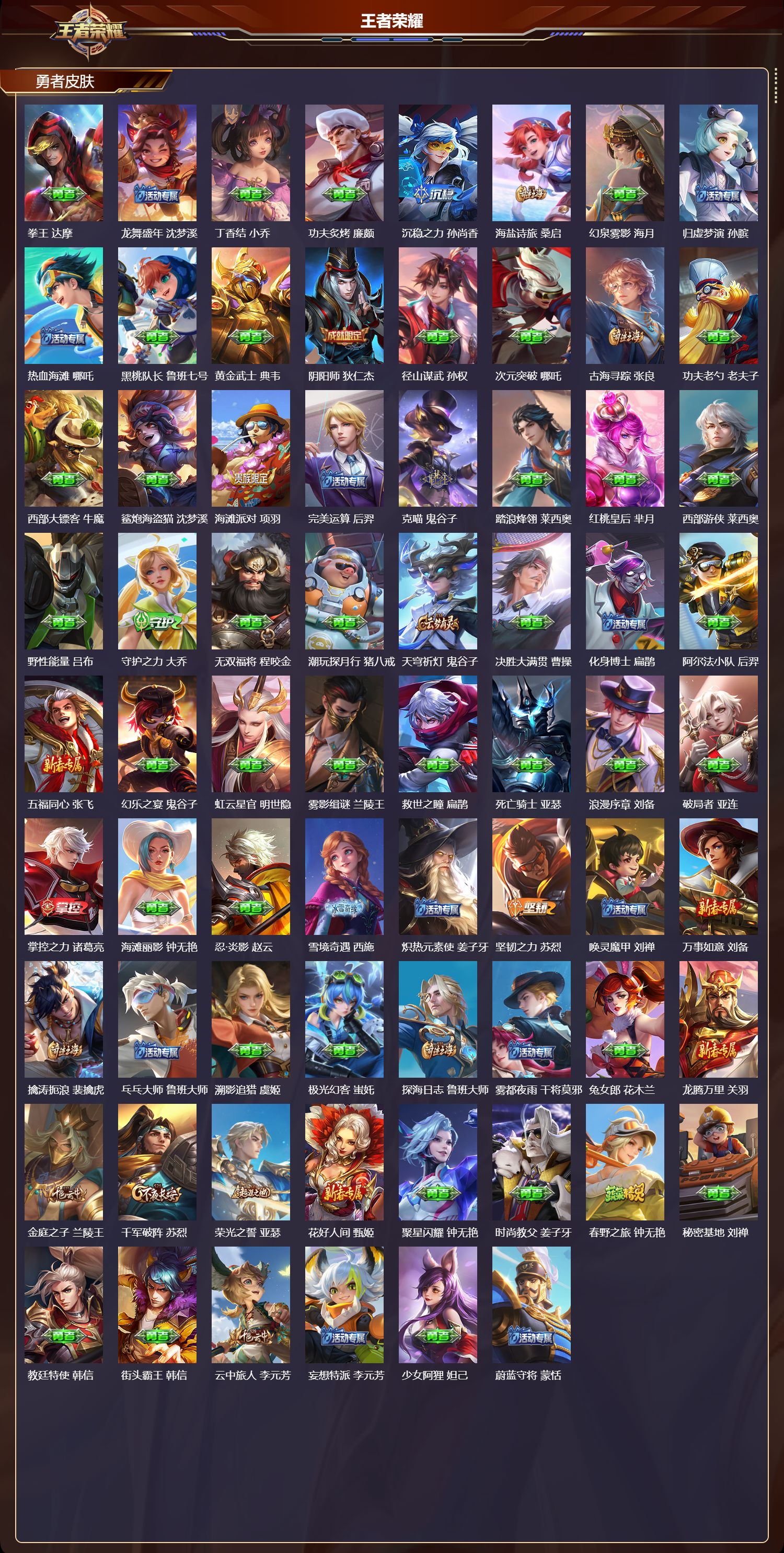 【108,勇者皮肤】圆桌骑士,盾山,爱心护理,阿轲,大漠名商,沈梦溪,缤纷绘卷,张良,纽约教父,刘备,拳王,达摩,龙舞盛年,沈梦溪,丁香结,小乔,功夫炙烤,廉颇,沉稳之力,孙尚香,海盐诗旅,桑启,幻泉雾影,海月,归虚梦演,孙膑,热血海滩,哪吒,黑桃队长,鲁班七号,黄金武士,典韦,阴阳师,狄仁杰,径山谋武,孙权,次元突破,哪吒,古海寻踪,张良,功夫老勺,老夫子,西部大镖客,牛魔,鲨炮海盗猫,沈梦溪,海滩派对,项羽,完美运算,后羿,克喵,鬼谷子,踏浪烽翎,莱西奥,红桃皇后,芈月,西部游侠,莱西奥,野性能量,吕布,守护之力,大乔,无双福将,程咬金,潮玩探月行,猪八戒,天穹祈灯,鬼谷子,决胜大满贯,曹操,化身博士,扁鹊,阿尔法小队,后羿,五福同心,张飞,幻乐之宴,鬼谷子,虹云星官,明世隐,雾影缉谜,兰陵王,救世之瞳,扁鹊,死亡骑士,亚瑟,浪漫序章,刘备,破局者,亚连,掌控之力,诸葛亮,海滩丽影,钟无艳,忍·炎影,赵云,雪境奇遇,西施,炽热元素使,姜子牙,坚韧之力,苏烈,唤灵魔甲,刘禅,万事如意,刘备,擒涛扼浪,裴擒虎,乓乓大师,鲁班大师,溯影追猎,虞姬,极光幻客,蚩奼,探海日志,鲁班大师,雾都夜雨,干将莫邪,兔女郎,花木兰,龙腾万里,关羽,金庭之子,兰陵王,千军破阵,苏烈,荣光之誓,亚瑟,花好人间,甄姬,聚星闪耀,钟无艳,时尚教父,姜子牙,春野之旅,钟无艳,秘密基地,刘禅,教廷特使,韩信,街头霸王,韩信,云中旅人,李元芳,妄想特派,李元芳,少女阿狸,妲己,蔚蓝守将,蒙恬,春野闲踪,苏烈,布丁狗之约,阿古朵,命运加冕,露娜,小满鸭,姬小满,幻想奇妙夜,王昭君,灵野札记,张良,命运角斗场,狂铁,死霸装,白起,特工战影,狂铁,虚灵犬护,钟馗,漠中幻影,嫦娥,劲辣红锅,太乙真人,神迹守卫,孙悟空,剑破天穹,刘邦,铁骨偃魂,典韦,熔金海岸,周瑜,苍林狼骑,苍,天穹之誓,姜子牙,星梦巡礼,姜子牙,破阵·退雄兵,杨戬,谧流熔炉,太乙真人,群星魔术团,程咬金,暗都幽影,大司命,夏日便利店,虞姬,鹤鸣心笺,艾琳,锦麟游梦,庄周,逆浪荇歌,甄姬,海之女神,海月,线条小狗,周瑜,噬灭天穹,东皇太一,敬我三分,盘古,玫蓝誓约,戈娅,景韶洛都,明世隐,