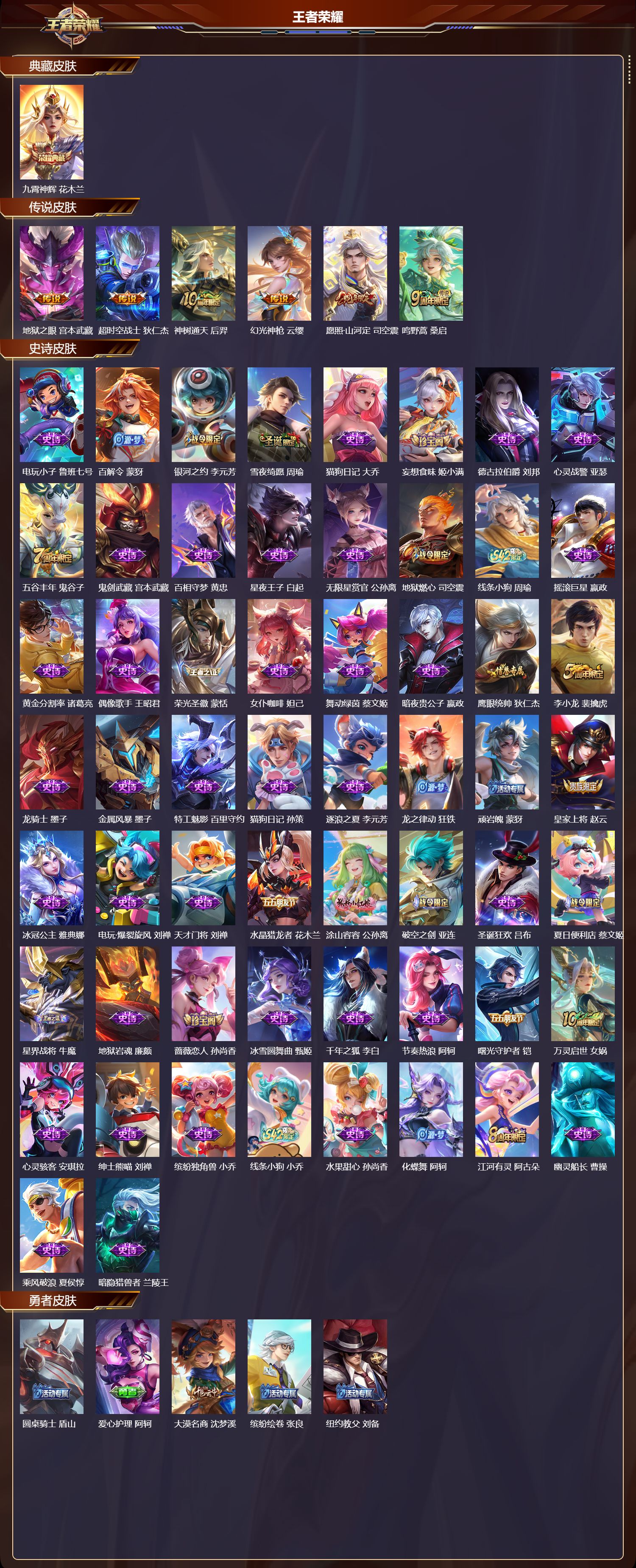 【58,史诗皮肤】电玩小子,鲁班七号,百解令,蒙犽,银河之约,李元芳,雪夜绮愿,周瑜,猫狗日记,大乔,妄想食味,姬小满,德古拉伯爵,刘邦,心灵战警,亚瑟,五谷丰年,鬼谷子,鬼剑武藏,宫本武藏,百相守梦,黄忠,星夜王子,白起,无限星赏官,公孙离,地狱燃心,司空震,线条小狗,周瑜,摇滚巨星,嬴政,黄金分割率,诸葛亮,偶像歌手,王昭君,荣光圣徽,蒙恬,女仆咖啡,妲己,舞动绿茵,蔡文姬,暗夜贵公子,嬴政,鹰眼统帅,狄仁杰,李小龙,裴擒虎,龙骑士,墨子,金属风暴,墨子,特工魅影,百里守约,猫狗日记,孙策,逐浪之夏,李元芳,龙之律动,狂铁,顽岩魄,蒙犽,皇家上将,赵云,冰冠公主,雅典娜,电玩·爆裂旋风,刘禅,天才门将,刘禅,水晶猎龙者,花木兰,涂山容容,公孙离,破空之剑,亚连,圣诞狂欢,吕布,夏日便利店,蔡文姬,星界战将,牛魔,地狱岩魂,廉颇,蔷薇恋人,孙尚香,冰雪圆舞曲,甄姬,千年之狐,李白,节奏热浪,阿轲,曙光守护者,铠,万灵启世,女娲,心灵骇客,安琪拉,绅士熊喵,刘禅,缤纷独角兽,小乔,线条小狗,小乔,水果甜心,孙尚香,化蝶舞,阿轲,江河有灵,阿古朵,幽灵船长,曹操,乘风破浪,夏侯惇,暗隐猎兽者,兰陵王,