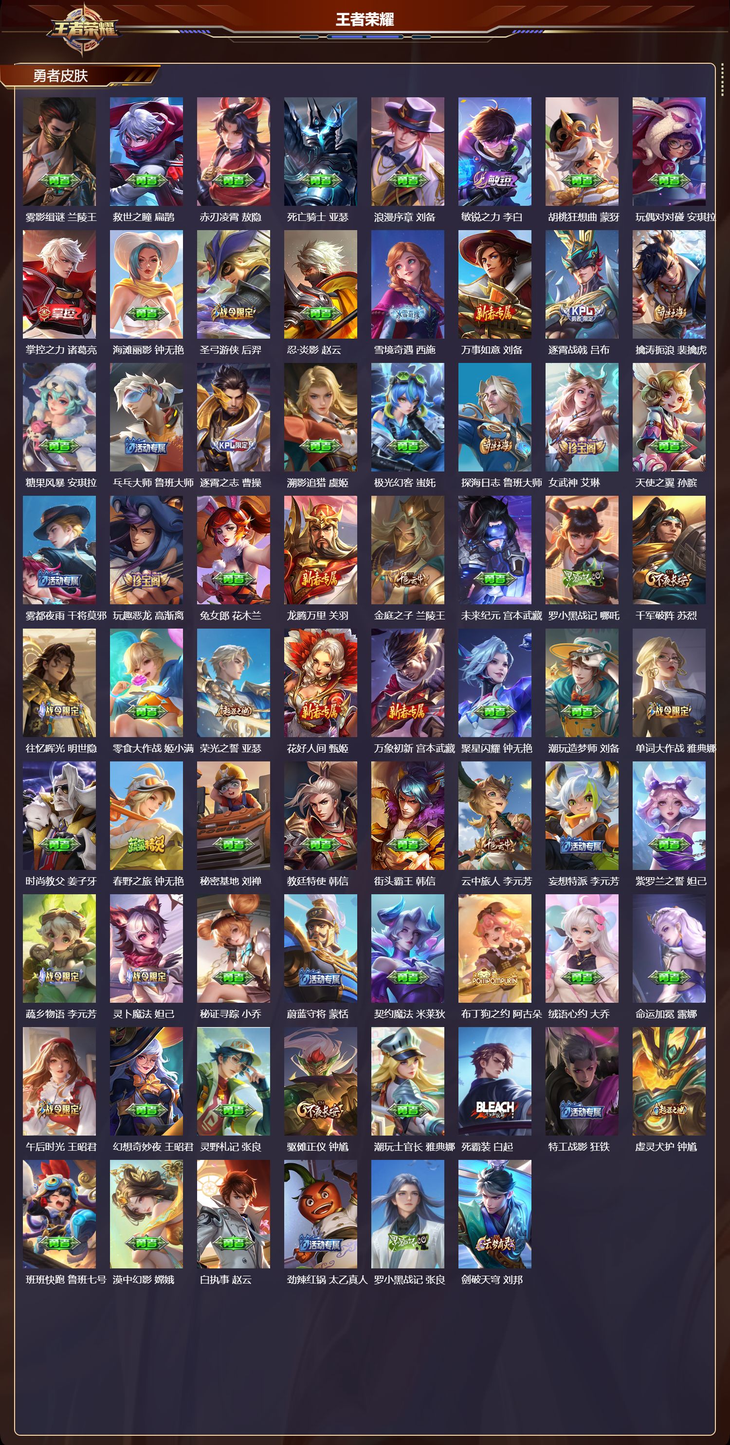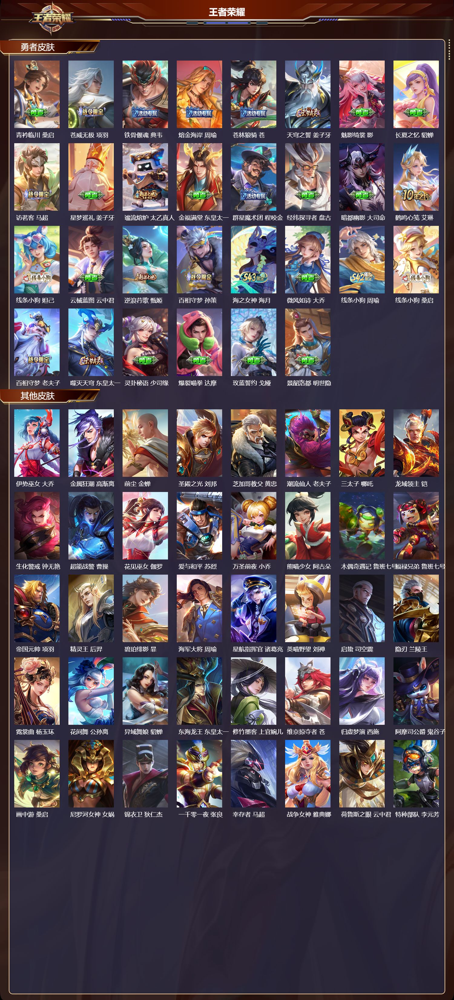 【151,勇者皮肤】时空谍影,海诺,玲珑珍味,西施,圆桌骑士,盾山,沙漠行僧,达摩,大漠名商,沈梦溪,暖冬絮语,程咬金,缤纷绘卷,张良,纽约教父,刘备,拳王,达摩,龙舞盛年,沈梦溪,丁香结,小乔,功夫炙烤,廉颇,沉稳之力,孙尚香,海盐诗旅,桑启,归虚梦演,孙膑,热血海滩,哪吒,白色死神,白起,黄金武士,典韦,王牌新星,海月,阴阳师,狄仁杰,径山谋武,孙权,次元突破,哪吒,古海寻踪,张良,戏梦巡演,空空儿,功夫老勺,老夫子,西部大镖客,牛魔,鲨炮海盗猫,沈梦溪,虎啸剑宗,刘邦,海滩派对,项羽,完美运算,后羿,万华元夜,狄仁杰,克喵,鬼谷子,踏浪烽翎,莱西奥,演武夺筹,程咬金,西部游侠,莱西奥,哥特玫瑰,露娜,守护之力,大乔,无双福将,程咬金,瓷语鉴心,露娜,原初探秘者,鬼谷子,潮玩探月行,猪八戒,鸿运当头,亚瑟,天穹祈灯,鬼谷子,化身博士,扁鹊,阿尔法小队,后羿,五福同心,张飞,夜都怪侠,白起,金色潮汐,朵莉亚,次元傲视,杨戬,幻乐之宴,鬼谷子,虹云星官,明世隐,雾影缉谜,兰陵王,救世之瞳,扁鹊,赤刃凌霄,敖隐,死亡骑士,亚瑟,浪漫序章,刘备,敏锐之力,李白,胡桃狂想曲,蒙犽,玩偶对对碰,安琪拉,掌控之力,诸葛亮,海滩丽影,钟无艳,圣弓游侠,后羿,忍·炎影,赵云,雪境奇遇,西施,万事如意,刘备,逐霄战戟,吕布,擒涛扼浪,裴擒虎,糖果风暴,安琪拉,乓乓大师,鲁班大师,逐霄之志,曹操,溯影追猎,虞姬,极光幻客,蚩奼,探海日志,鲁班大师,女武神,艾琳,天使之翼,孙膑,雾都夜雨,干将莫邪,玩趣恶龙,高渐离,兔女郎,花木兰,龙腾万里,关羽,金庭之子,兰陵王,未来纪元,宫本武藏,罗小黑战记,哪吒,千军破阵,苏烈,往忆晖光,明世隐,零食大作战,姬小满,荣光之誓,亚瑟,花好人间,甄姬,万象初新,宫本武藏,聚星闪耀,钟无艳,潮玩造梦师,刘备,单词大作战,雅典娜,时尚教父,姜子牙,春野之旅,钟无艳,秘密基地,刘禅,教廷特使,韩信,街头霸王,韩信,云中旅人,李元芳,妄想特派,李元芳,紫罗兰之誓,妲己,蔬乡物语,李元芳,灵卜魔法,妲己,秘证寻踪,小乔,蔚蓝守将,蒙恬,契约魔法,米莱狄,布丁狗之约,阿古朵,绒语心约,大乔,命运加冕,露娜,午后时光,王昭君,幻想奇妙夜,王昭君,灵野札记,张良,驱傩正仪,钟馗,潮玩士官长,雅典娜,死霸装,白起,特工战影,狂铁,虚灵犬护,钟馗,班班快跑,鲁班七号,漠中幻影,嫦娥,白执事,赵云,劲辣红锅,太乙真人,罗小黑战记,张良,剑破天穹,刘邦,青衿临川,桑启,苍威无极,项羽,铁骨偃魂,典韦,熔金海岸,周瑜,苍林狼骑,苍,天穹之誓,姜子牙,魅影绮裳,影,长夏之忆,貂蝉,访茗客,马超,星梦巡礼,姜子牙,谧流熔炉,太乙真人,金福满堂,东皇太一,群星魔术团,程咬金,经纬探寻者,盘古,暗都幽影,大司命,鹤鸣心笺,艾琳,线条小狗,妲己,云械蓝图,云中君,逆浪荇歌,甄姬,百相守梦,孙策,海之女神,海月,微风如诗,大乔,线条小狗,周瑜,线条小狗,桑启,百相守梦,老夫子,噬灭天穹,东皇太一,灵卦秘语,少司缘,爆裂喵拳,达摩,玫蓝誓约,戈娅,景韶洛都,明世隐,