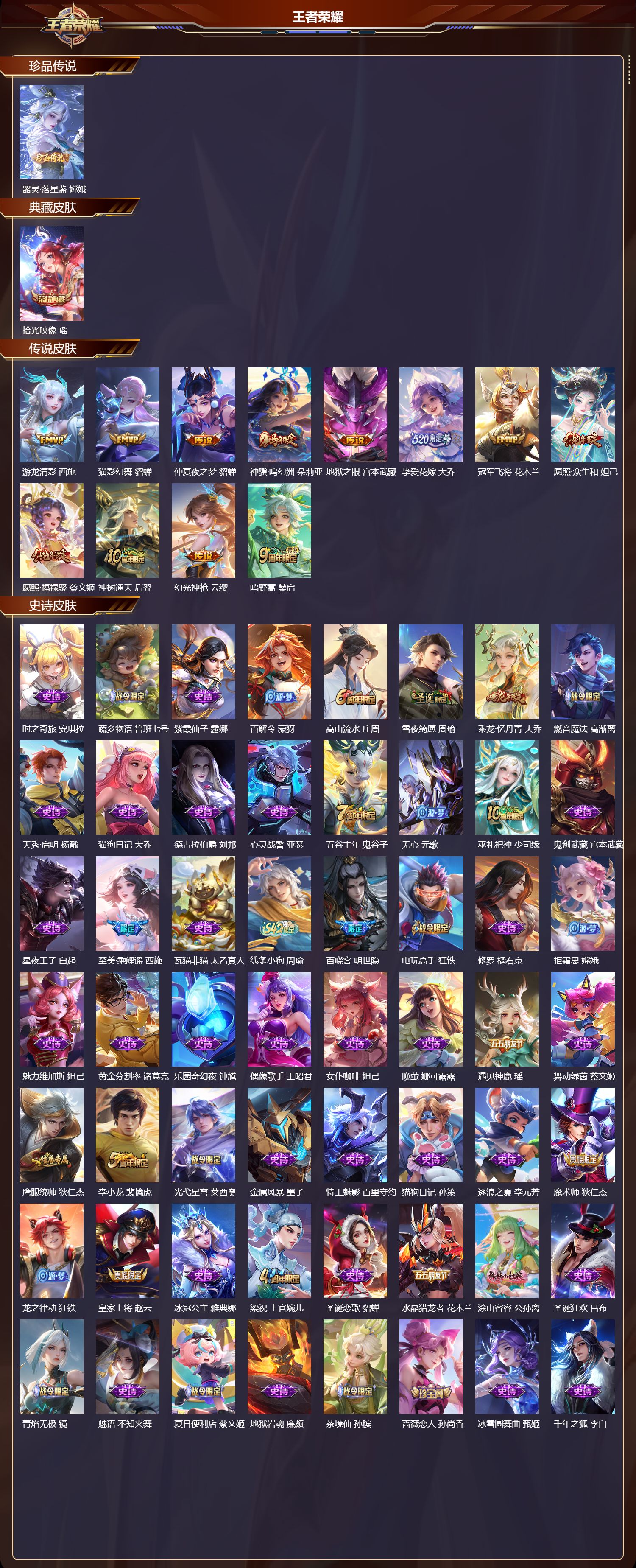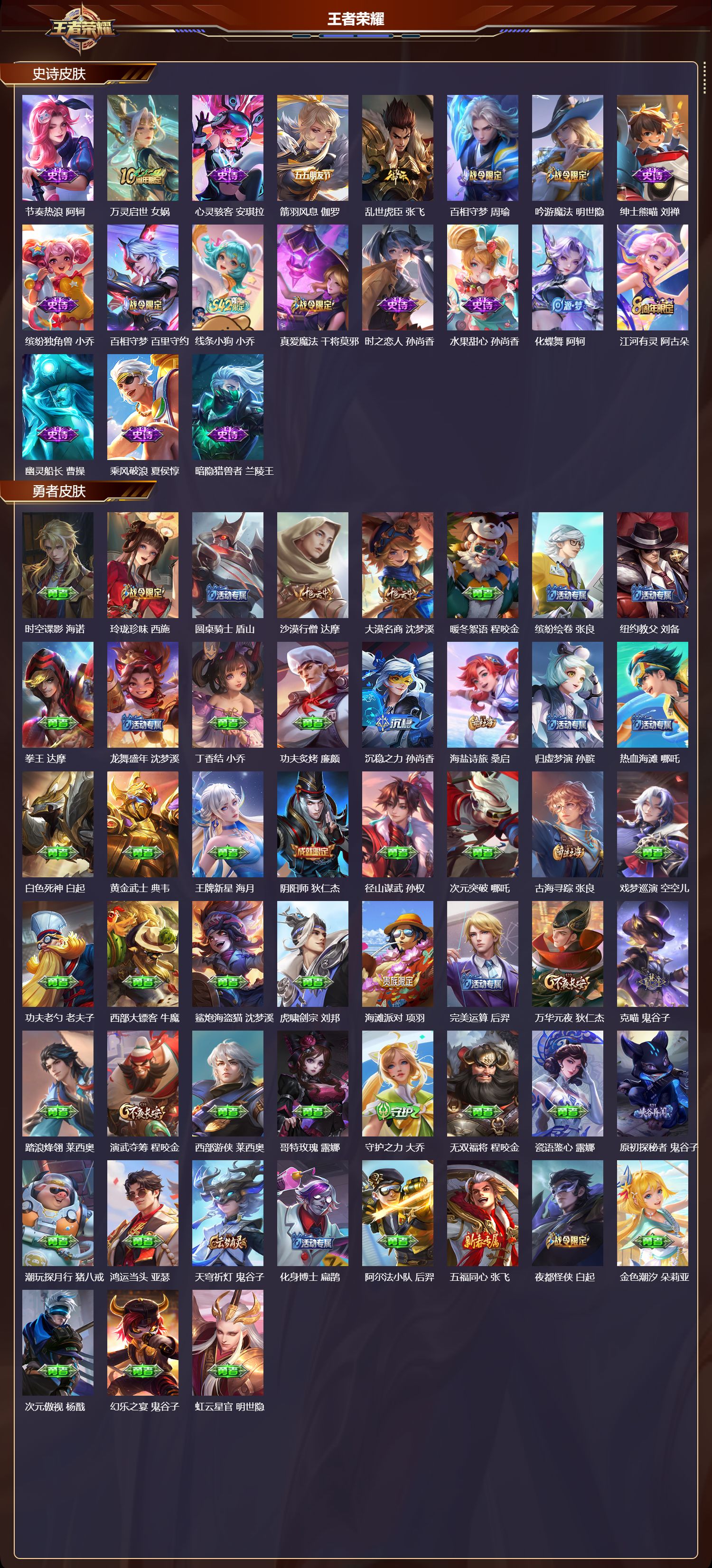 【75,史诗皮肤】时之奇旅,安琪拉,蔬乡物语,鲁班七号,紫霞仙子,露娜,百解令,蒙犽,高山流水,庄周,雪夜绮愿,周瑜,乘龙·忆丹青,大乔,燃音魔法,高渐离,天秀·启明,杨戬,猫狗日记,大乔,德古拉伯爵,刘邦,心灵战警,亚瑟,五谷丰年,鬼谷子,无心,元歌,巫礼祀神,少司缘,鬼剑武藏,宫本武藏,星夜王子,白起,至美·乘鲤谣,西施,瓦猫非猫,太乙真人,线条小狗,周瑜,百晓客,明世隐,电玩高手,狂铁,修罗,橘右京,拒霜思,嫦娥,魅力维加斯,妲己,黄金分割率,诸葛亮,乐园奇幻夜,钟馗,偶像歌手,王昭君,女仆咖啡,妲己,晚萤,娜可露露,遇见神鹿,瑶,舞动绿茵,蔡文姬,鹰眼统帅,狄仁杰,李小龙,裴擒虎,光弋星穹,莱西奥,金属风暴,墨子,特工魅影,百里守约,猫狗日记,孙策,逐浪之夏,李元芳,魔术师,狄仁杰,龙之律动,狂铁,皇家上将,赵云,冰冠公主,雅典娜,梁祝,上官婉儿,圣诞恋歌,貂蝉,水晶猎龙者,花木兰,涂山容容,公孙离,圣诞狂欢,吕布,青焰无极,镜,魅语,不知火舞,夏日便利店,蔡文姬,地狱岩魂,廉颇,茶境仙,孙膑,蔷薇恋人,孙尚香,冰雪圆舞曲,甄姬,千年之狐,李白,节奏热浪,阿轲,万灵启世,女娲,心灵骇客,安琪拉,箭羽风息,伽罗,乱世虎臣,张飞,百相守梦,周瑜,吟游魔法,明世隐,绅士熊喵,刘禅,缤纷独角兽,小乔,百相守梦,百里守约,线条小狗,小乔,真爱魔法,干将莫邪,时之恋人,孙尚香,水果甜心,孙尚香,化蝶舞,阿轲,江河有灵,阿古朵,幽灵船长,曹操,乘风破浪,夏侯惇,暗隐猎兽者,兰陵王,