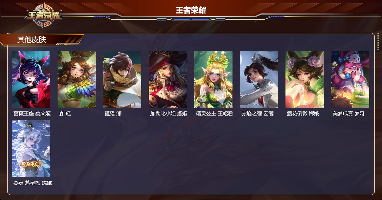 【49,其他皮肤】伊势巫女,大乔,金属狂潮,高渐离,前尘,金蝉,圣殿之光,刘邦,芝加哥教父,黄忠,潮流仙人,老夫子,三太子,哪吒,龙域领主,铠,生化警戒,钟无艳,超能战警,曹操,花见巫女,伽罗,爱与和平,苏烈,万圣前夜,小乔,熊喵少女,阿古朵,木偶奇遇记,鲁班七号,福禄兄弟,鲁班七号,帝国元帅,项羽,精灵王,后羿,碧珀绯影,暃,海军大将,周瑜,星航指挥官,诸葛亮,英喵野望,刘禅,启蛰,司空震,隐刃,兰陵王,霓裳曲,杨玉环,花间舞,公孙离,异域舞娘,貂蝉,东海龙王,东皇太一,修竹墨客,上官婉儿,维京掠夺者,苍,归虚梦演,西施,阿摩司公爵,鬼谷子,画中游,桑启,尼罗河女神,女娲,锦衣卫,狄仁杰,一千零一夜,张良,幸存者,马超,战争女神,雅典娜,荷鲁斯之眼,云中君,特种部队,李元芳,蔷薇王座,蔡文姬,森,瑶,孤猎,澜,加勒比小姐,虞姬,精灵公主,王昭君,赤焰之缨,云缨,露花倒影,嫦娥,美梦成真,梦奇,器灵·落星盏,嫦娥,