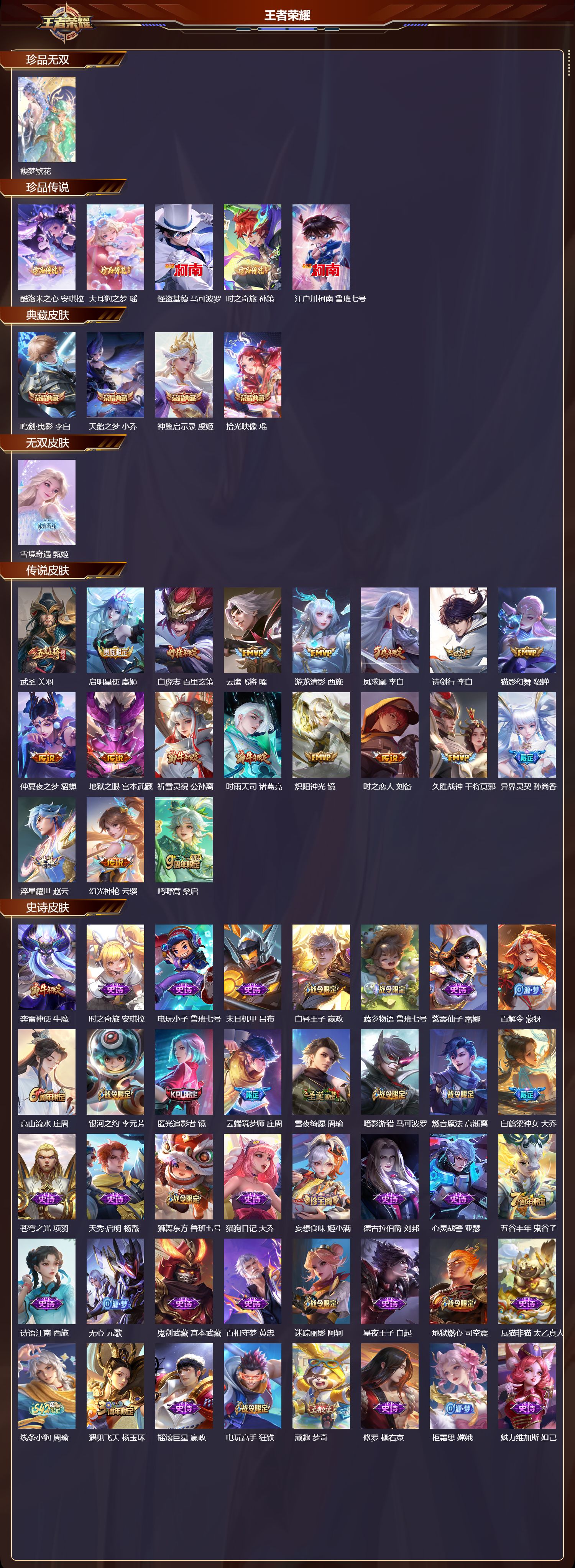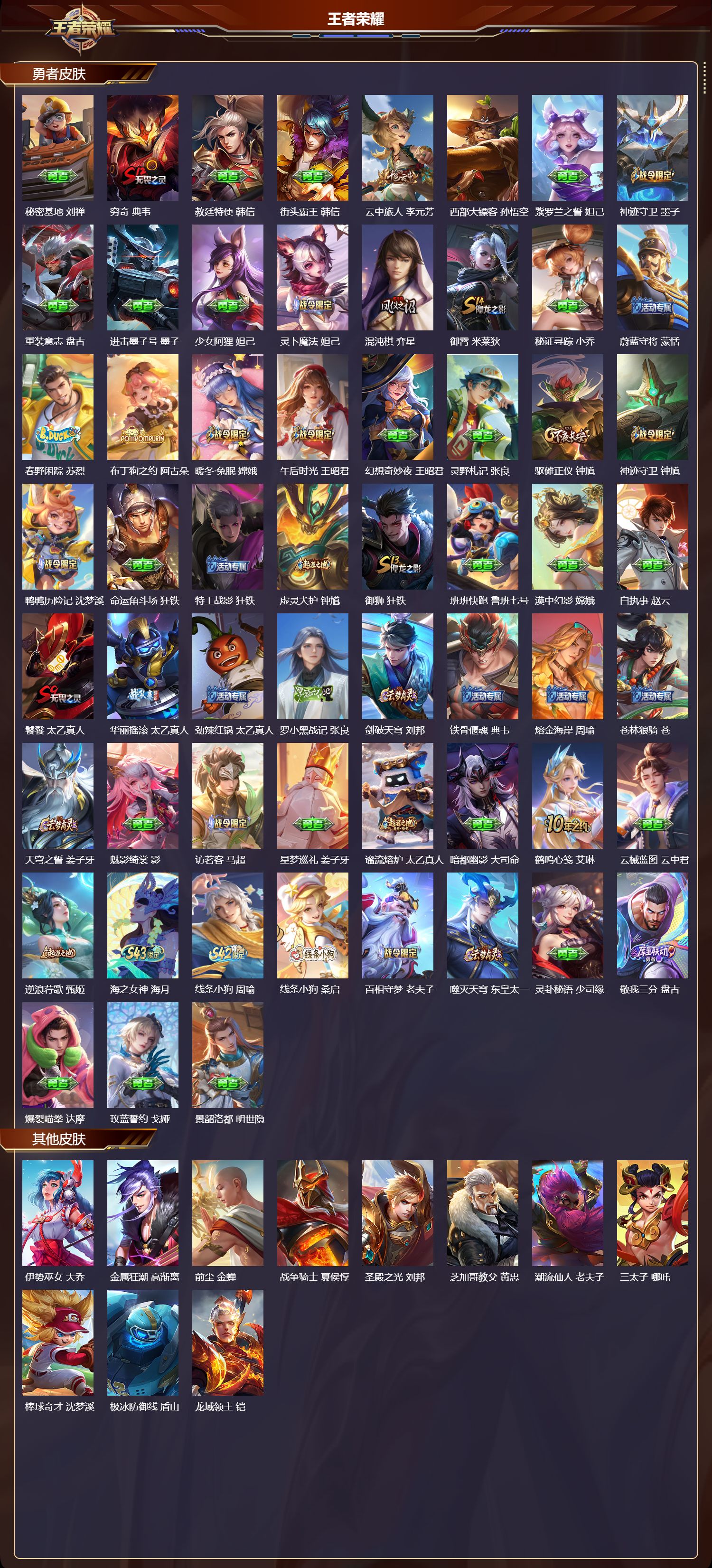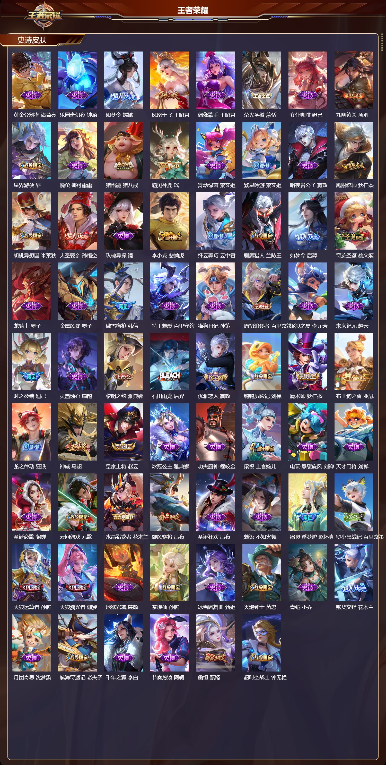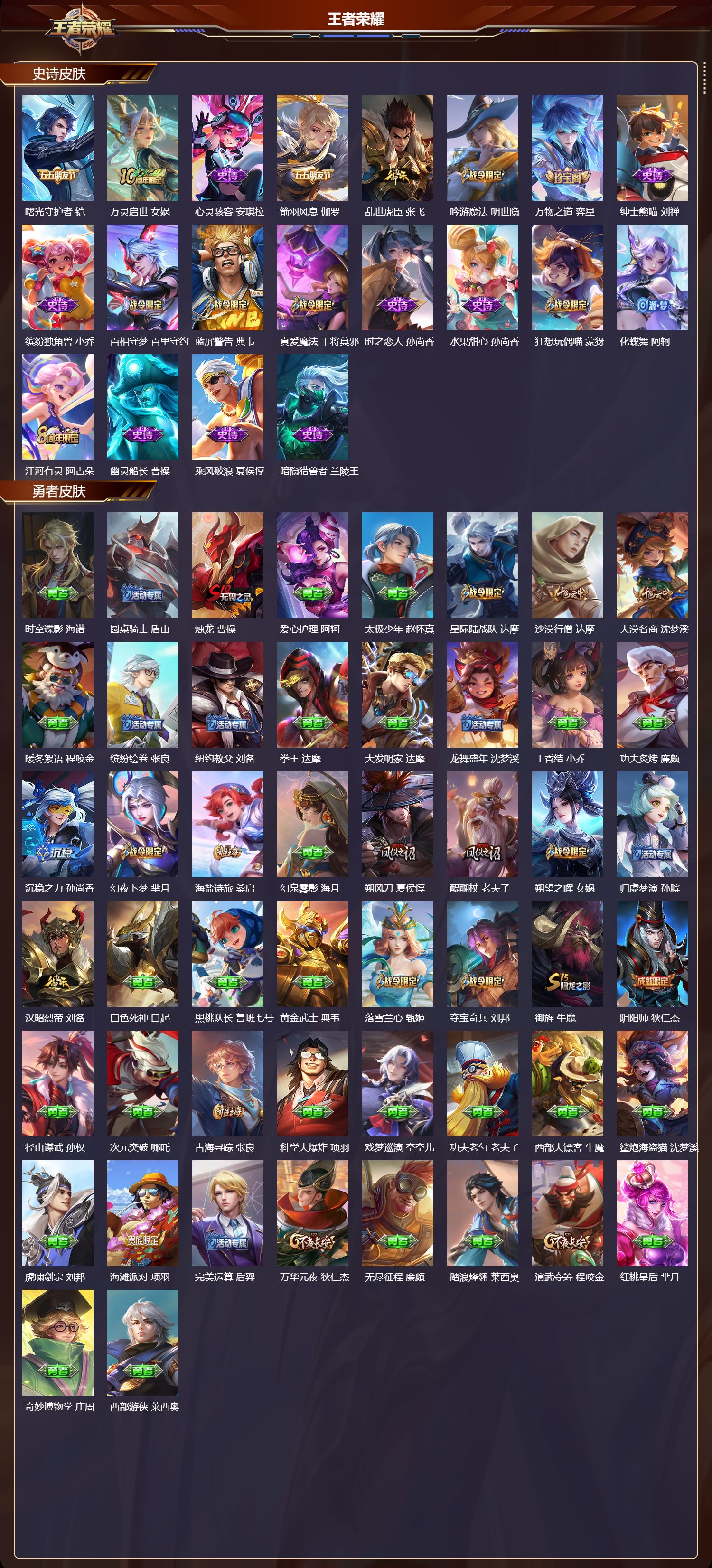 【130,史诗皮肤】奔雷神使,牛魔,时之奇旅,安琪拉,电玩小子,鲁班七号,末日机甲,吕布,白昼王子,嬴政,蔬乡物语,鲁班七号,紫霞仙子,露娜,百解令,蒙犽,高山流水,庄周,银河之约,李元芳,匿光追影者,镜,云端筑梦师,庄周,雪夜绮愿,周瑜,暗影游猎,马可波罗,燃音魔法,高渐离,白鹤梁神女,大乔,苍穹之光,项羽,天秀·启明,杨戬,狮舞东方,鲁班七号,猫狗日记,大乔,妄想食味,姬小满,德古拉伯爵,刘邦,心灵战警,亚瑟,五谷丰年,鬼谷子,诗语江南,西施,无心,元歌,鬼剑武藏,宫本武藏,百相守梦,黄忠,迷踪丽影,阿轲,星夜王子,白起,地狱燃心,司空震,瓦猫非猫,太乙真人,线条小狗,周瑜,遇见飞天,杨玉环,摇滚巨星,嬴政,电玩高手,狂铁,顽趣,梦奇,修罗,橘右京,拒霜思,嫦娥,魅力维加斯,妲己,黄金分割率,诸葛亮,乐园奇幻夜,钟馗,如梦令,嫦娥,凤凰于飞,王昭君,偶像歌手,王昭君,荣光圣徽,蒙恬,女仆咖啡,妲己,九幽镇关,项羽,星界游侠,暃,晚萤,娜可露露,猪悟能,猪八戒,遇见神鹿,瑶,舞动绿茵,蔡文姬,繁星吟游,蔡文姬,暗夜贵公子,嬴政,鹰眼统帅,狄仁杰,胡桃异想国,米莱狄,大圣娶亲,孙悟空,玫瑰异探,镜,李小龙,裴擒虎,纤云弄巧,云中君,驯魔猎人,兰陵王,如梦令,后羿,奇迹圣诞,蔡文姬,龙骑士,墨子,金属风暴,墨子,傲雪梅枪,韩信,特工魅影,百里守约,猫狗日记,孙策,原初追逐者,百里玄策,逐浪之夏,李元芳,未来纪元,赵云,时之彼端,妲己,灵蛊蚀心,扁鹊,黎明之约,雅典娜,石田雨龙,后羿,优雅恋人,嬴政,鸭鸭历险记,刘禅,魔术师,狄仁杰,布丁狗之誓,亚瑟,龙之律动,狂铁,神威,马超,皇家上将,赵云,冰冠公主,雅典娜,功夫厨神,程咬金,梁祝,上官婉儿,电玩·爆裂旋风,刘禅,天才门将,刘禅,圣诞恋歌,貂蝉,云间偶戏,元歌,水晶猎龙者,花木兰,御风骁将,吕布,圣诞狂欢,吕布,魅语,不知火舞,器灵·浮梦炉,赵怀真,罗小黑战记,百里玄策,天狼运算者,孙膑,天狼溯光者,伽罗,地狱岩魂,廉颇,茶境仙,孙膑,冰雪圆舞曲,甄姬,火炮绅士,黄忠,青蛇,小乔,默契交锋,花木兰,月团寄思,沈梦溪,航海奇遇记,老夫子,千年之狐,李白,节奏热浪,阿轲,幽恒,甄姬,超时空战士,钟无艳,曙光守护者,铠,万灵启世,女娲,心灵骇客,安琪拉,箭羽风息,伽罗,乱世虎臣,张飞,吟游魔法,明世隐,万物之道,弈星,绅士熊喵,刘禅,缤纷独角兽,小乔,百相守梦,百里守约,蓝屏警告,典韦,真爱魔法,干将莫邪,时之恋人,孙尚香,水果甜心,孙尚香,狂想玩偶喵,蒙犽,化蝶舞,阿轲,江河有灵,阿古朵,幽灵船长,曹操,乘风破浪,夏侯惇,暗隐猎兽者,兰陵王,
