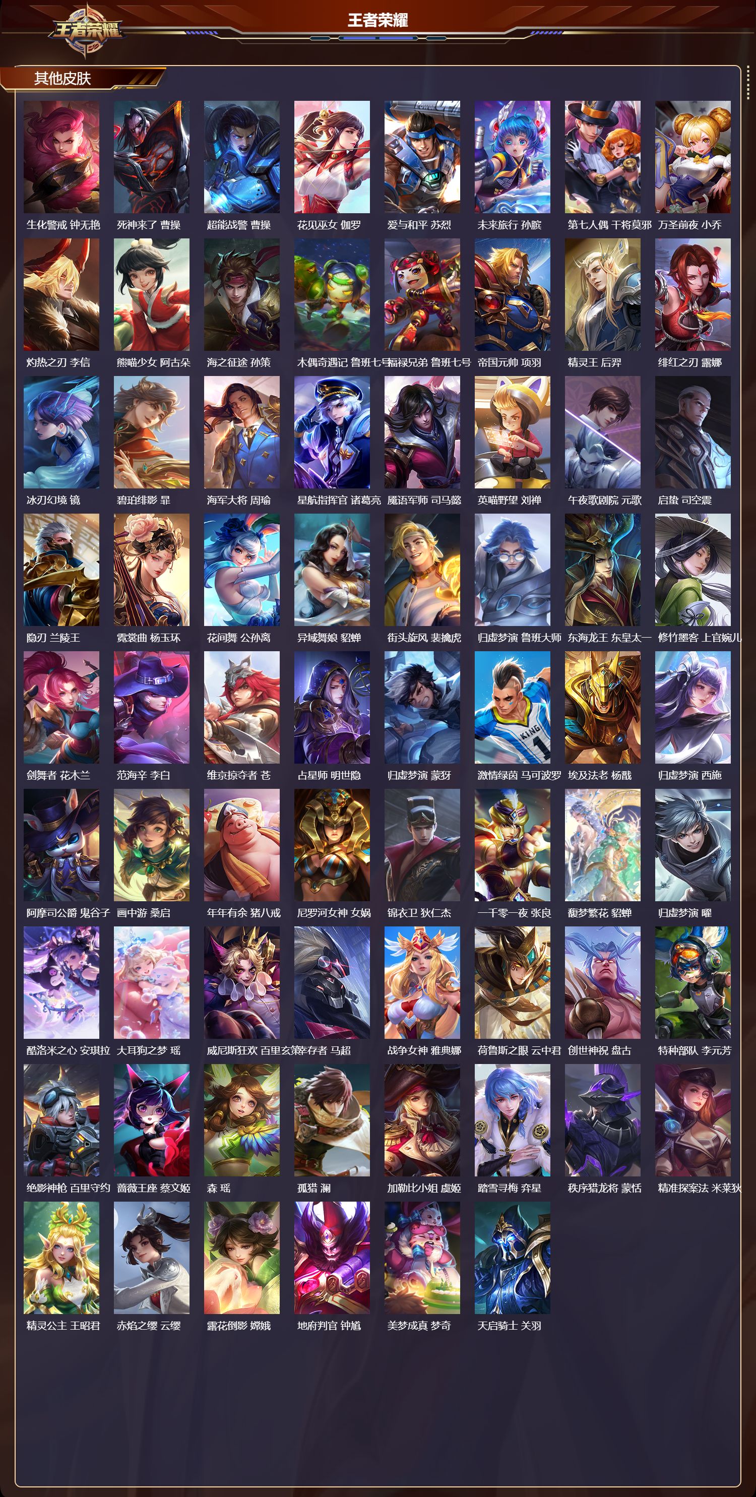 【86,其他皮肤】伊势巫女,大乔,金属狂潮,高渐离,前尘,金蝉,战争骑士,夏侯惇,圣殿之光,刘邦,芝加哥教父,黄忠,潮流仙人,老夫子,三太子,哪吒,棒球奇才,沈梦溪,极冰防御线,盾山,龙域领主,铠,生化警戒,钟无艳,死神来了,曹操,超能战警,曹操,花见巫女,伽罗,爱与和平,苏烈,未来旅行,孙膑,第七人偶,干将莫邪,万圣前夜,小乔,灼热之刃,李信,熊喵少女,阿古朵,海之征途,孙策,木偶奇遇记,鲁班七号,福禄兄弟,鲁班七号,帝国元帅,项羽,精灵王,后羿,绯红之刃,露娜,冰刃幻境,镜,碧珀绯影,暃,海军大将,周瑜,星航指挥官,诸葛亮,魇语军师,司马懿,英喵野望,刘禅,午夜歌剧院,元歌,启蛰,司空震,隐刃,兰陵王,霓裳曲,杨玉环,花间舞,公孙离,异域舞娘,貂蝉,街头旋风,裴擒虎,归虚梦演,鲁班大师,东海龙王,东皇太一,修竹墨客,上官婉儿,剑舞者,花木兰,范海辛,李白,维京掠夺者,苍,占星师,明世隐,归虚梦演,蒙犽,激情绿茵,马可波罗,埃及法老,杨戬,归虚梦演,西施,阿摩司公爵,鬼谷子,画中游,桑启,年年有余,猪八戒,尼罗河女神,女娲,锦衣卫,狄仁杰,一千零一夜,张良,馥梦繁花,貂蝉,归虚梦演,曜,酷洛米之心,安琪拉,大耳狗之梦,瑶,威尼斯狂欢,百里玄策,幸存者,马超,战争女神,雅典娜,荷鲁斯之眼,云中君,创世神祝,盘古,特种部队,李元芳,绝影神枪,百里守约,蔷薇王座,蔡文姬,森,瑶,孤猎,澜,加勒比小姐,虞姬,踏雪寻梅,弈星,秩序猎龙将,蒙恬,精准探案法,米莱狄,精灵公主,王昭君,赤焰之缨,云缨,露花倒影,嫦娥,地府判官,钟馗,美梦成真,梦奇,天启骑士,关羽,圆桌骑士,太乙真人,怪盗基德,马可波罗,西部大镖客,孙悟空,时之奇旅,孙策,江户川柯南,鲁班七号,