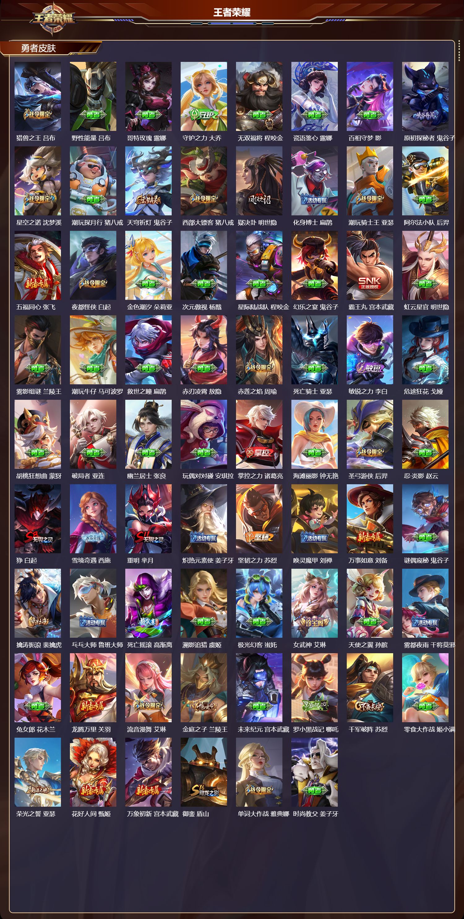 【179,勇者皮肤】时空谍影,海诺,圆桌骑士,盾山,烛龙,曹操,爱心护理,阿轲,太极少年,赵怀真,星际陆战队,达摩,沙漠行僧,达摩,大漠名商,沈梦溪,暖冬絮语,程咬金,缤纷绘卷,张良,纽约教父,刘备,拳王,达摩,大发明家,达摩,龙舞盛年,沈梦溪,丁香结,小乔,功夫炙烤,廉颇,沉稳之力,孙尚香,幻夜卜梦,芈月,海盐诗旅,桑启,幻泉雾影,海月,朔风刀,夏侯惇,醍醐杖,老夫子,朔望之晖,女娲,归虚梦演,孙膑,汉昭烈帝,刘备,白色死神,白起,黑桃队长,鲁班七号,黄金武士,典韦,落雪兰心,甄姬,夺宝奇兵,刘邦,御旌,牛魔,阴阳师,狄仁杰,径山谋武,孙权,次元突破,哪吒,古海寻踪,张良,科学大爆炸,项羽,戏梦巡演,空空儿,功夫老勺,老夫子,西部大镖客,牛魔,鲨炮海盗猫,沈梦溪,虎啸剑宗,刘邦,海滩派对,项羽,完美运算,后羿,万华元夜,狄仁杰,无尽征程,廉颇,踏浪烽翎,莱西奥,演武夺筹,程咬金,红桃皇后,芈月,奇妙博物学,庄周,西部游侠,莱西奥,猎兽之王,吕布,野性能量,吕布,哥特玫瑰,露娜,守护之力,大乔,无双福将,程咬金,瓷语鉴心,露娜,百相守梦,影,原初探秘者,鬼谷子,星空之诺,沈梦溪,潮玩探月行,猪八戒,天穹祈灯,鬼谷子,西部大镖客,猪八戒,疑决卦,明世隐,化身博士,扁鹊,潮玩骑士王,亚瑟,阿尔法小队,后羿,五福同心,张飞,夜都怪侠,白起,金色潮汐,朵莉亚,次元傲视,杨戬,星际陆战队,程咬金,幻乐之宴,鬼谷子,霸王丸,宫本武藏,虹云星官,明世隐,雾影缉谜,兰陵王,潮玩牛仔,马可波罗,救世之瞳,扁鹊,赤刃凌霄,敖隐,赤莲之焰,周瑜,死亡骑士,亚瑟,敏锐之力,李白,危途狂花,戈娅,胡桃狂想曲,蒙犽,破局者,亚连,幽兰居士,张良,玩偶对对碰,安琪拉,掌控之力,诸葛亮,海滩丽影,钟无艳,圣弓游侠,后羿,忍·炎影,赵云,狰,白起,雪境奇遇,西施,重明,芈月,炽热元素使,姜子牙,坚韧之力,苏烈,唤灵魔甲,刘禅,万事如意,刘备,谜偶窥秘,鬼谷子,擒涛扼浪,裴擒虎,乓乓大师,鲁班大师,死亡摇滚,高渐离,溯影追猎,虞姬,极光幻客,蚩奼,女武神,艾琳,天使之翼,孙膑,雾都夜雨,干将莫邪,兔女郎,花木兰,龙腾万里,关羽,流音漫舞,艾琳,金庭之子,兰陵王,未来纪元,宫本武藏,罗小黑战记,哪吒,千军破阵,苏烈,零食大作战,姬小满,荣光之誓,亚瑟,花好人间,甄姬,万象初新,宫本武藏,御銮,盾山,单词大作战,雅典娜,时尚教父,姜子牙,秘密基地,刘禅,穷奇,典韦,教廷特使,韩信,街头霸王,韩信,云中旅人,李元芳,西部大镖客,孙悟空,紫罗兰之誓,妲己,神迹守卫,墨子,重装意志,盘古,进击墨子号,墨子,少女阿狸,妲己,灵卜魔法,妲己,混沌棋,弈星,御霄,米莱狄,秘证寻踪,小乔,蔚蓝守将,蒙恬,春野闲踪,苏烈,布丁狗之约,阿古朵,暖冬·兔眠,嫦娥,午后时光,王昭君,幻想奇妙夜,王昭君,灵野札记,张良,驱傩正仪,钟馗,神迹守卫,钟馗,鸭鸭历险记,沈梦溪,命运角斗场,狂铁,特工战影,狂铁,虚灵犬护,钟馗,御狮,狂铁,班班快跑,鲁班七号,漠中幻影,嫦娥,白执事,赵云,饕餮,太乙真人,华丽摇滚,太乙真人,劲辣红锅,太乙真人,罗小黑战记,张良,剑破天穹,刘邦,铁骨偃魂,典韦,熔金海岸,周瑜,苍林狼骑,苍,天穹之誓,姜子牙,魅影绮裳,影,访茗客,马超,星梦巡礼,姜子牙,谧流熔炉,太乙真人,暗都幽影,大司命,鹤鸣心笺,艾琳,云械蓝图,云中君,逆浪荇歌,甄姬,海之女神,海月,线条小狗,周瑜,线条小狗,桑启,百相守梦,老夫子,噬灭天穹,东皇太一,灵卦秘语,少司缘,敬我三分,盘古,爆裂喵拳,达摩,玫蓝誓约,戈娅,景韶洛都,明世隐,