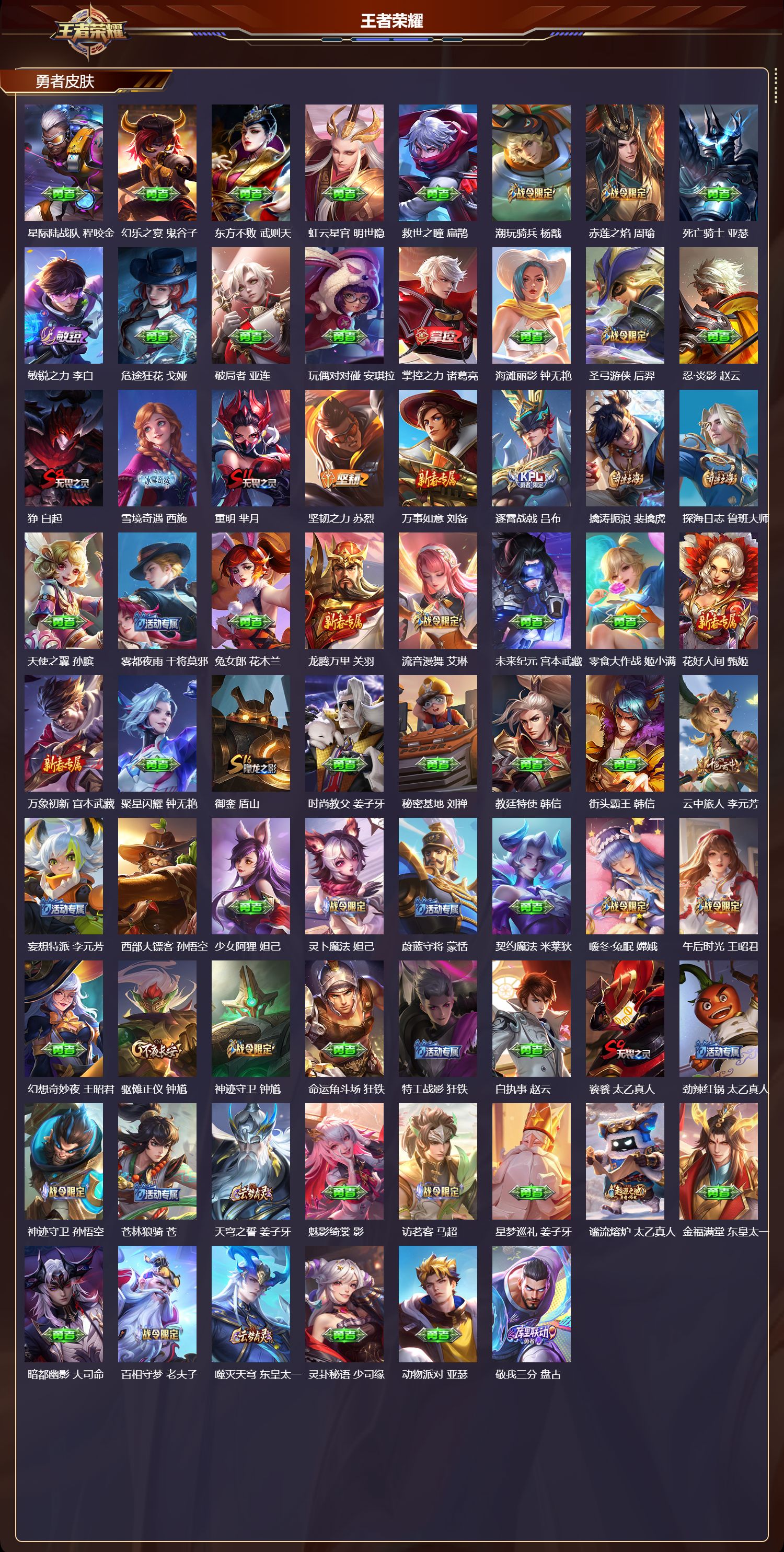 【126,勇者皮肤】时空谍影,海诺,玲珑珍味,西施,圆桌骑士,盾山,烛龙,曹操,爱心护理,阿轲,太极少年,赵怀真,大漠名商,沈梦溪,拳王,达摩,大发明家,达摩,龙舞盛年,沈梦溪,乐园追猎者,白起,丁香结,小乔,功夫炙烤,廉颇,沉稳之力,孙尚香,爱与正义,程咬金,海盐诗旅,桑启,幻泉雾影,海月,朔风刀,夏侯惇,汉昭烈帝,刘备,热血海滩,哪吒,白色死神,白起,黑桃队长,鲁班七号,黄金武士,典韦,王牌新星,海月,落雪兰心,甄姬,夺宝奇兵,刘邦,阴阳师,狄仁杰,次元突破,哪吒,古海寻踪,张良,牛运亨通,牛魔,功夫老勺,老夫子,西部大镖客,牛魔,鲨炮海盗猫,沈梦溪,鲤鱼之梦,庄周,海滩派对,项羽,红桃皇后,芈月,西部游侠,莱西奥,美猴王,孙悟空,野性能量,吕布,哥特玫瑰,露娜,守护之力,大乔,无双福将,程咬金,原初探秘者,鬼谷子,潮玩探月行,猪八戒,鸿运当头,亚瑟,决胜大满贯,曹操,西部大镖客,猪八戒,疑决卦,明世隐,化身博士,扁鹊,潮玩骑士王,亚瑟,阿尔法小队,后羿,五福同心,张飞,金色潮汐,朵莉亚,次元傲视,杨戬,星际陆战队,程咬金,幻乐之宴,鬼谷子,东方不败,武则天,虹云星官,明世隐,救世之瞳,扁鹊,潮玩骑兵,杨戬,赤莲之焰,周瑜,死亡骑士,亚瑟,敏锐之力,李白,危途狂花,戈娅,破局者,亚连,玩偶对对碰,安琪拉,掌控之力,诸葛亮,海滩丽影,钟无艳,圣弓游侠,后羿,忍·炎影,赵云,狰,白起,雪境奇遇,西施,重明,芈月,坚韧之力,苏烈,万事如意,刘备,逐霄战戟,吕布,擒涛扼浪,裴擒虎,探海日志,鲁班大师,天使之翼,孙膑,雾都夜雨,干将莫邪,兔女郎,花木兰,龙腾万里,关羽,流音漫舞,艾琳,未来纪元,宫本武藏,零食大作战,姬小满,花好人间,甄姬,万象初新,宫本武藏,聚星闪耀,钟无艳,御銮,盾山,时尚教父,姜子牙,秘密基地,刘禅,教廷特使,韩信,街头霸王,韩信,云中旅人,李元芳,妄想特派,李元芳,西部大镖客,孙悟空,少女阿狸,妲己,灵卜魔法,妲己,蔚蓝守将,蒙恬,契约魔法,米莱狄,暖冬·兔眠,嫦娥,午后时光,王昭君,幻想奇妙夜,王昭君,驱傩正仪,钟馗,神迹守卫,钟馗,命运角斗场,狂铁,特工战影,狂铁,白执事,赵云,饕餮,太乙真人,劲辣红锅,太乙真人,神迹守卫,孙悟空,苍林狼骑,苍,天穹之誓,姜子牙,魅影绮裳,影,访茗客,马超,星梦巡礼,姜子牙,谧流熔炉,太乙真人,金福满堂,东皇太一,暗都幽影,大司命,百相守梦,老夫子,噬灭天穹,东皇太一,灵卦秘语,少司缘,动物派对,亚瑟,敬我三分,盘古,怪诞之夜,米莱狄,爆裂喵拳,达摩,