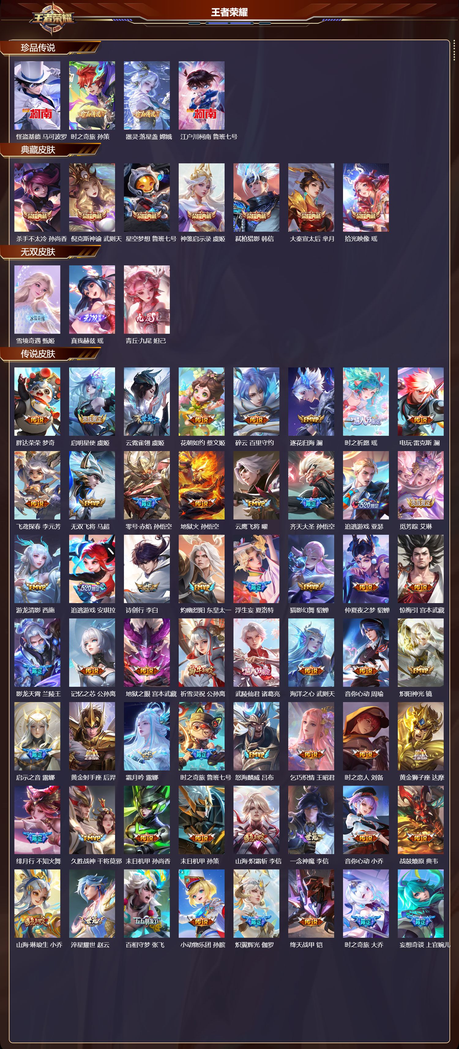 PX_2579275-Q/至圣王者/430皮肤/126英雄/7典藏/0珍品无双/3无双/4珍品传说/73传说/139史诗/10稀有英雄