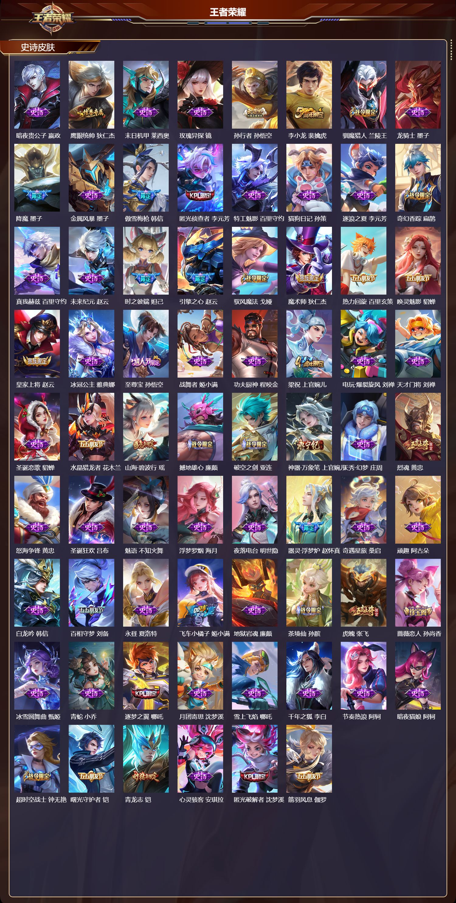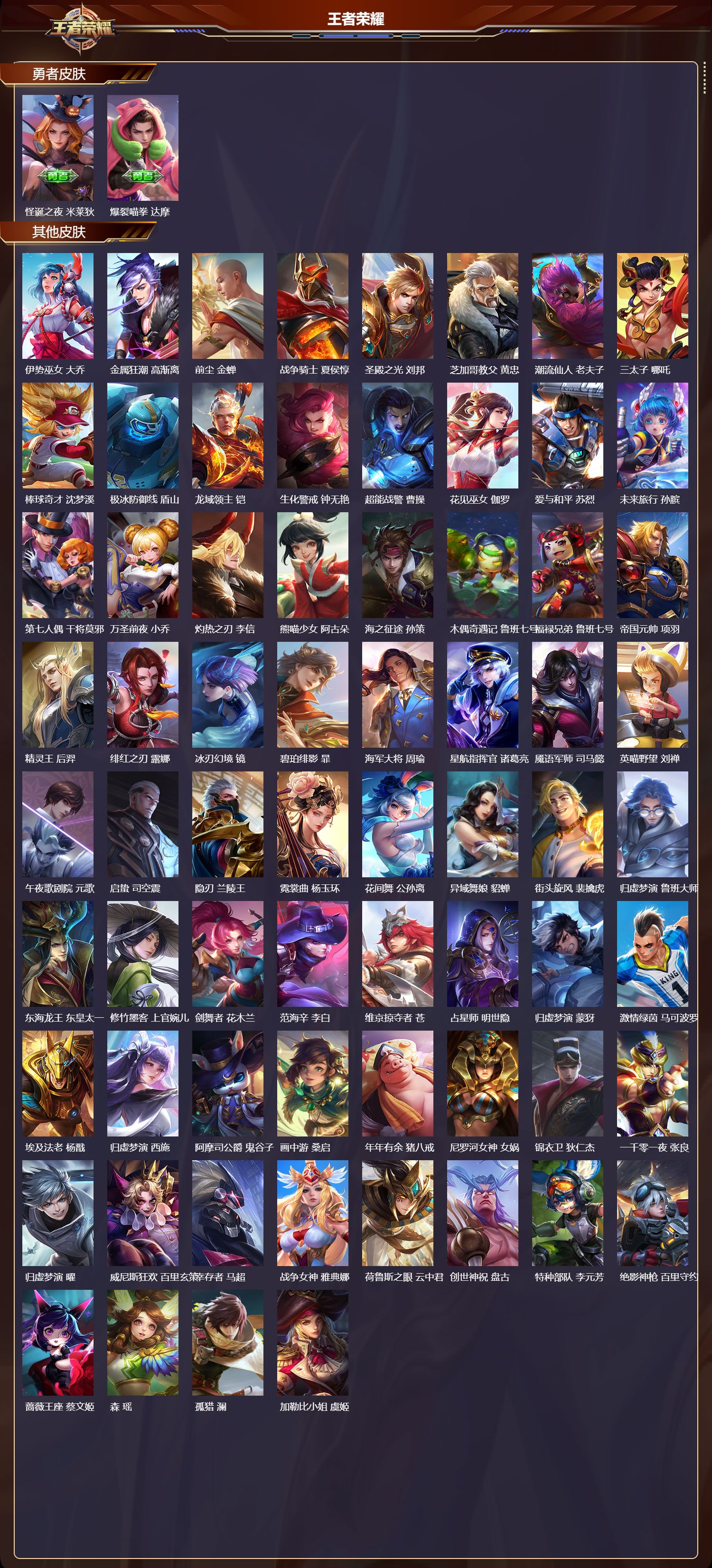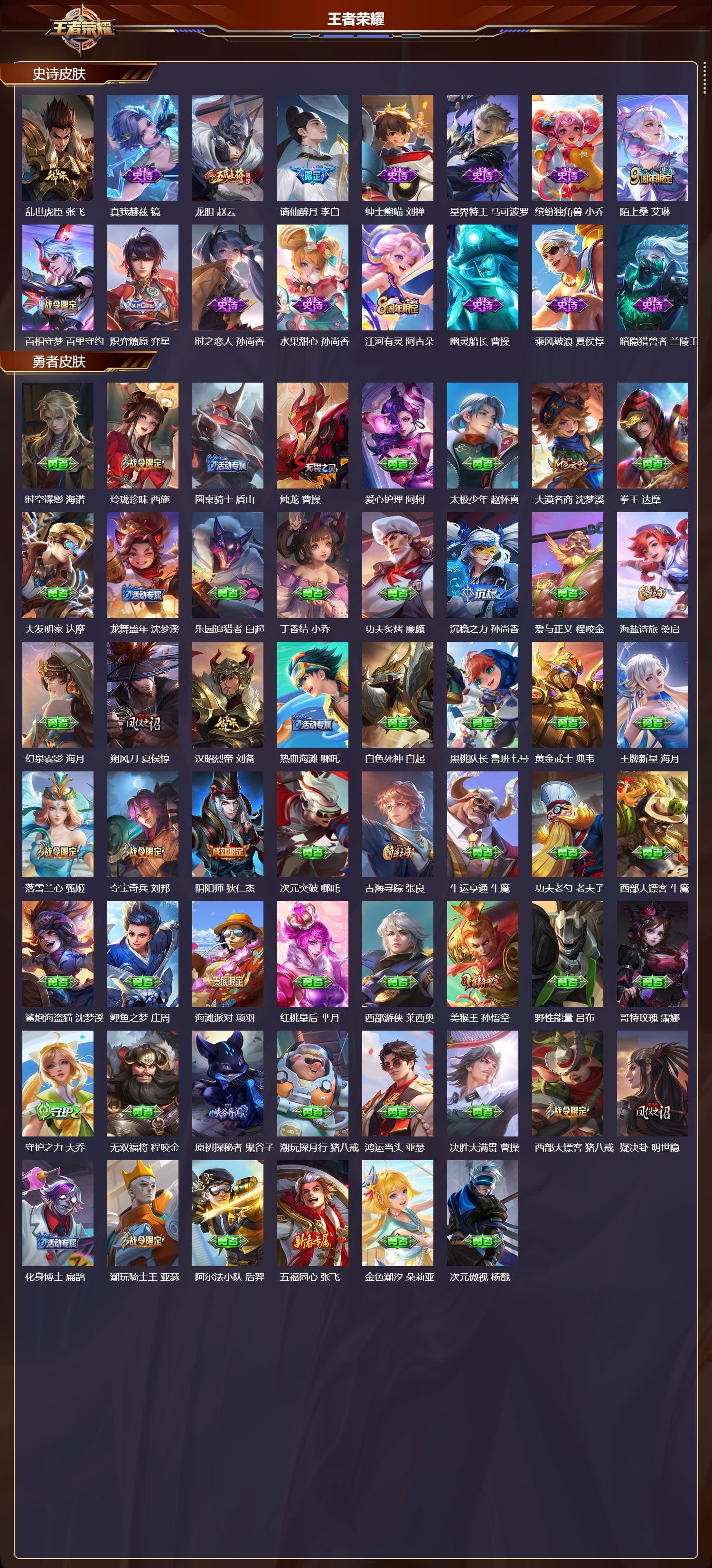 【139,史诗皮肤】龙鼓争鸣,蒙犽,乒乒小将,鲁班七号,时之奇旅,安琪拉,电玩小子,鲁班七号,末日机甲,吕布,紫霞仙子,露娜,时之奇旅,妲己,匿光追影者,镜,云端筑梦师,庄周,奇遇舞章,艾琳,唐三藏,金蝉,暗渊魔法,司马懿,燃音魔法,高渐离,天秀·音浪,高渐离,苍穹之光,项羽,天秀·启明,杨戬,猫狗日记,大乔,德古拉伯爵,刘邦,山海·玄木吟,马可波罗,心灵战警,亚瑟,闲日渔趣,姜子牙,五谷丰年,鬼谷子,银翎春语,杨玉环,诗语江南,西施,无心,元歌,鬼剑武藏,宫本武藏,星夜王子,白起,无限星赏官,公孙离,千筹问战,张良,玉兔公主,公孙离,摇滚巨星,嬴政,电玩高手,狂铁,百相守梦,关羽,修罗,橘右京,魅力维加斯,妲己,黄金分割率,诸葛亮,电玩·兔顽号,蔡文姬,滕王阁序,弈星,乐园奇幻夜,钟馗,苍鳞隐世,白起,偶像歌手,王昭君,完美假期,米莱狄,荣光圣徽,蒙恬,女仆咖啡,妲己,逐梦之音,貂蝉,白蛇,大乔,赏金猎手,澜,星界游侠,暃,晚萤,娜可露露,猪悟能,猪八戒,遇见神鹿,瑶,舞动绿茵,蔡文姬,繁星吟游,蔡文姬,暗夜贵公子,嬴政,鹰眼统帅,狄仁杰,末日机甲,莱西奥,玫瑰异探,镜,孙行者,孙悟空,李小龙,裴擒虎,驯魔猎人,兰陵王,龙骑士,墨子,降魔,墨子,金属风暴,墨子,傲雪梅枪,韩信,匿光侦查者,李元芳,特工魅影,百里守约,猫狗日记,孙策,逐浪之夏,李元芳,奇幻香踪,扁鹊,真我赫兹,百里守约,未来纪元,赵云,时之彼端,妲己,引擎之心,赵云,驭风魔法,戈娅,魔术师,狄仁杰,热力回旋,百里玄策,唤灵魅影,貂蝉,皇家上将,赵云,冰冠公主,雅典娜,至尊宝,孙悟空,战舞者,姬小满,功夫厨神,程咬金,梁祝,上官婉儿,电玩·爆裂旋风,刘禅,天才门将,刘禅,圣诞恋歌,貂蝉,水晶猎龙者,花木兰,山海·碧波行,瑶,撼地雄心,廉颇,破空之剑,亚连,神器·万象笔,上官婉儿,天秀·幻梦,庄周,烈魂,黄忠,怒海争锋,黄忠,圣诞狂欢,吕布,魅语,不知火舞,浮梦罗烟,海月,夜落电台,明世隐,器灵·浮梦炉,赵怀真,奇遇星旅,桑启,顽趣,阿古朵,白龙吟,韩信,百相守梦,刘备,永昼,夏洛特,飞车小橘子,姬小满,地狱岩魂,廉颇,茶境仙,孙膑,虎魄,张飞,蔷薇恋人,孙尚香,冰雪圆舞曲,甄姬,青蛇,小乔,逐梦之翼,哪吒,月团寄思,沈梦溪,雪上飞焰,哪吒,千年之狐,李白,节奏热浪,阿轲,暗夜猫娘,阿轲,超时空战士,钟无艳,曙光守护者,铠,青龙志,铠,心灵骇客,安琪拉,匿光破解者,沈梦溪,箭羽风息,伽罗,乱世虎臣,张飞,真我赫兹,镜,龙胆,赵云,谪仙醉月,李白,绅士熊喵,刘禅,星界特工,马可波罗,缤纷独角兽,小乔,陌上桑,艾琳,百相守梦,百里守约,炽弈燎原,弈星,时之恋人,孙尚香,水果甜心,孙尚香,江河有灵,阿古朵,幽灵船长,曹操,乘风破浪,夏侯惇,暗隐猎兽者,兰陵王,