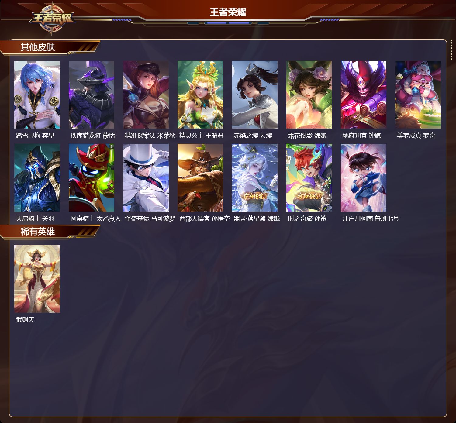【83,其他皮肤】伊势巫女,大乔,金属狂潮,高渐离,前尘,金蝉,战争骑士,夏侯惇,圣殿之光,刘邦,芝加哥教父,黄忠,潮流仙人,老夫子,三太子,哪吒,棒球奇才,沈梦溪,极冰防御线,盾山,龙域领主,铠,生化警戒,钟无艳,超能战警,曹操,花见巫女,伽罗,爱与和平,苏烈,未来旅行,孙膑,第七人偶,干将莫邪,万圣前夜,小乔,灼热之刃,李信,熊喵少女,阿古朵,海之征途,孙策,木偶奇遇记,鲁班七号,福禄兄弟,鲁班七号,帝国元帅,项羽,精灵王,后羿,绯红之刃,露娜,冰刃幻境,镜,碧珀绯影,暃,海军大将,周瑜,星航指挥官,诸葛亮,魇语军师,司马懿,英喵野望,刘禅,午夜歌剧院,元歌,启蛰,司空震,隐刃,兰陵王,霓裳曲,杨玉环,花间舞,公孙离,异域舞娘,貂蝉,街头旋风,裴擒虎,归虚梦演,鲁班大师,东海龙王,东皇太一,修竹墨客,上官婉儿,剑舞者,花木兰,范海辛,李白,维京掠夺者,苍,占星师,明世隐,归虚梦演,蒙犽,激情绿茵,马可波罗,埃及法老,杨戬,归虚梦演,西施,阿摩司公爵,鬼谷子,画中游,桑启,年年有余,猪八戒,尼罗河女神,女娲,锦衣卫,狄仁杰,一千零一夜,张良,归虚梦演,曜,威尼斯狂欢,百里玄策,幸存者,马超,战争女神,雅典娜,荷鲁斯之眼,云中君,创世神祝,盘古,特种部队,李元芳,绝影神枪,百里守约,蔷薇王座,蔡文姬,森,瑶,孤猎,澜,加勒比小姐,虞姬,踏雪寻梅,弈星,秩序猎龙将,蒙恬,精准探案法,米莱狄,精灵公主,王昭君,赤焰之缨,云缨,露花倒影,嫦娥,地府判官,钟馗,美梦成真,梦奇,天启骑士,关羽,圆桌骑士,太乙真人,怪盗基德,马可波罗,西部大镖客,孙悟空,器灵·落星盏,嫦娥,时之奇旅,孙策,江户川柯南,鲁班七号,