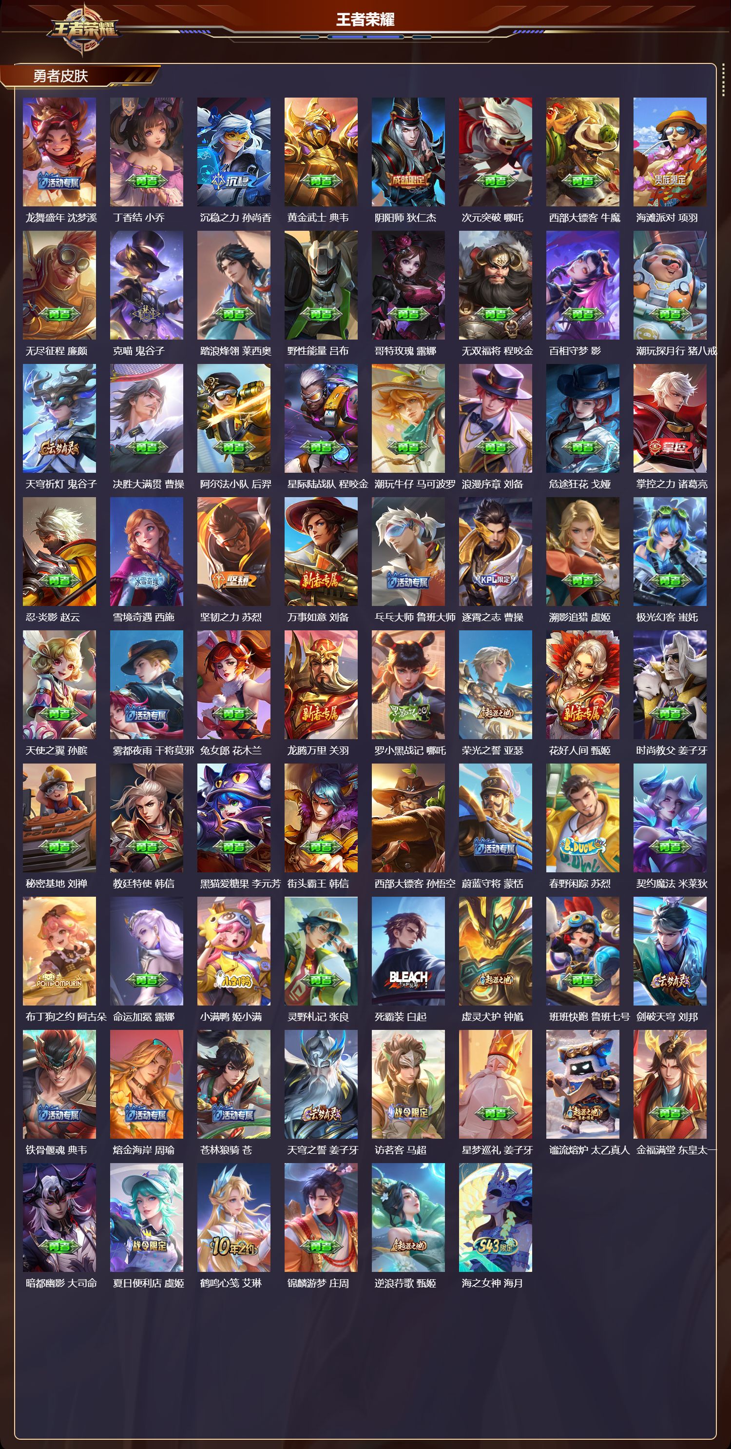 【79,勇者皮肤】时空谍影,海诺,纽约教父,刘备,拳王,达摩,龙舞盛年,沈梦溪,丁香结,小乔,沉稳之力,孙尚香,黄金武士,典韦,阴阳师,狄仁杰,次元突破,哪吒,西部大镖客,牛魔,海滩派对,项羽,无尽征程,廉颇,克喵,鬼谷子,踏浪烽翎,莱西奥,野性能量,吕布,哥特玫瑰,露娜,无双福将,程咬金,百相守梦,影,潮玩探月行,猪八戒,天穹祈灯,鬼谷子,决胜大满贯,曹操,阿尔法小队,后羿,星际陆战队,程咬金,潮玩牛仔,马可波罗,浪漫序章,刘备,危途狂花,戈娅,掌控之力,诸葛亮,忍·炎影,赵云,雪境奇遇,西施,坚韧之力,苏烈,万事如意,刘备,乓乓大师,鲁班大师,逐霄之志,曹操,溯影追猎,虞姬,极光幻客,蚩奼,天使之翼,孙膑,雾都夜雨,干将莫邪,兔女郎,花木兰,龙腾万里,关羽,罗小黑战记,哪吒,荣光之誓,亚瑟,花好人间,甄姬,时尚教父,姜子牙,秘密基地,刘禅,教廷特使,韩信,黑猫爱糖果,李元芳,街头霸王,韩信,西部大镖客,孙悟空,蔚蓝守将,蒙恬,春野闲踪,苏烈,契约魔法,米莱狄,布丁狗之约,阿古朵,命运加冕,露娜,小满鸭,姬小满,灵野札记,张良,死霸装,白起,虚灵犬护,钟馗,班班快跑,鲁班七号,剑破天穹,刘邦,铁骨偃魂,典韦,熔金海岸,周瑜,苍林狼骑,苍,天穹之誓,姜子牙,访茗客,马超,星梦巡礼,姜子牙,谧流熔炉,太乙真人,金福满堂,东皇太一,暗都幽影,大司命,夏日便利店,虞姬,鹤鸣心笺,艾琳,锦麟游梦,庄周,逆浪荇歌,甄姬,海之女神,海月,线条小狗,周瑜,百相守梦,老夫子,噬灭天穹,东皇太一,敬我三分,盘古,玫蓝誓约,戈娅,景韶洛都,明世隐,