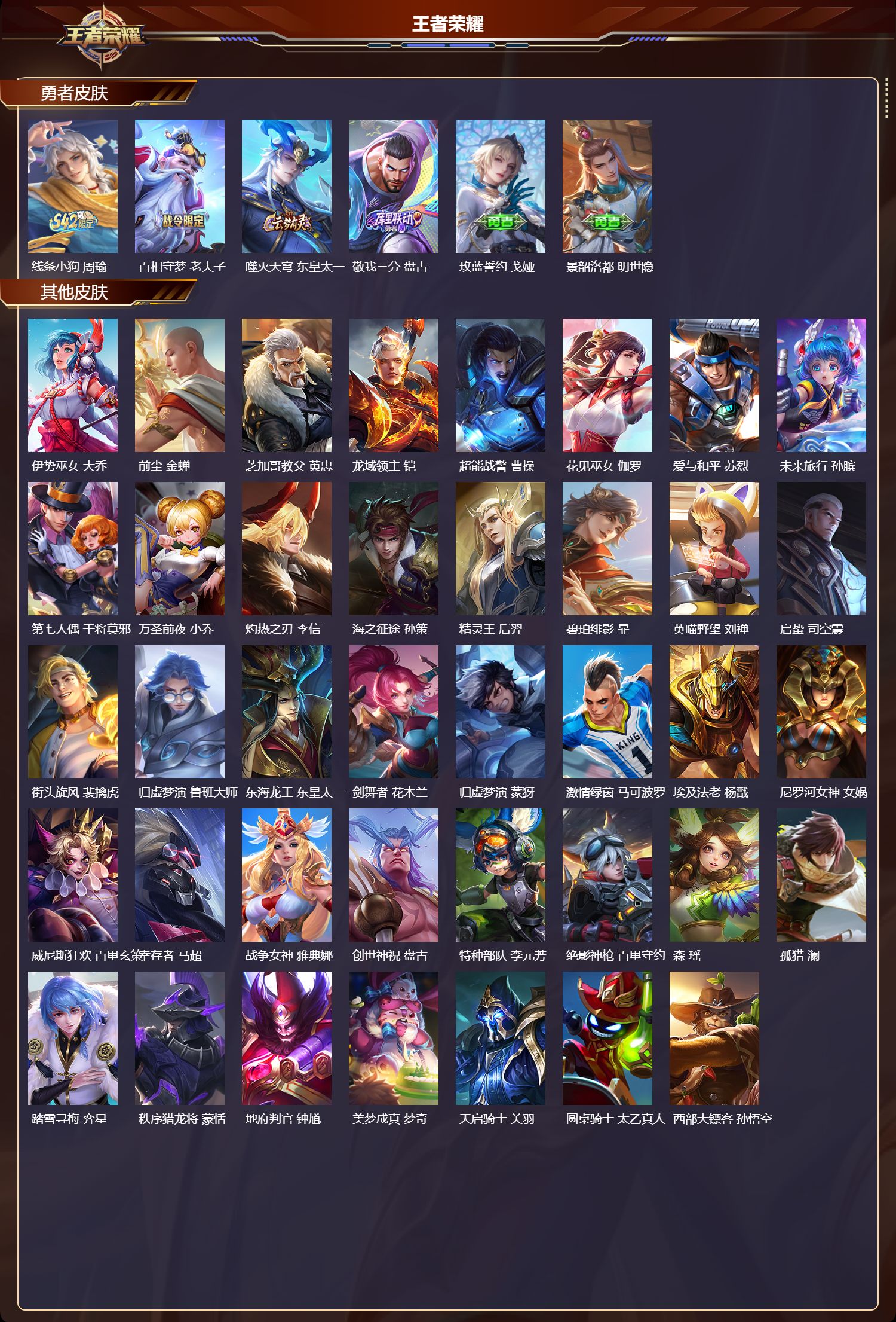【39,其他皮肤】伊势巫女,大乔,前尘,金蝉,芝加哥教父,黄忠,龙域领主,铠,超能战警,曹操,花见巫女,伽罗,爱与和平,苏烈,未来旅行,孙膑,第七人偶,干将莫邪,万圣前夜,小乔,灼热之刃,李信,海之征途,孙策,精灵王,后羿,碧珀绯影,暃,英喵野望,刘禅,启蛰,司空震,街头旋风,裴擒虎,归虚梦演,鲁班大师,东海龙王,东皇太一,剑舞者,花木兰,归虚梦演,蒙犽,激情绿茵,马可波罗,埃及法老,杨戬,尼罗河女神,女娲,威尼斯狂欢,百里玄策,幸存者,马超,战争女神,雅典娜,创世神祝,盘古,特种部队,李元芳,绝影神枪,百里守约,森,瑶,孤猎,澜,踏雪寻梅,弈星,秩序猎龙将,蒙恬,地府判官,钟馗,美梦成真,梦奇,天启骑士,关羽,圆桌骑士,太乙真人,西部大镖客,孙悟空,