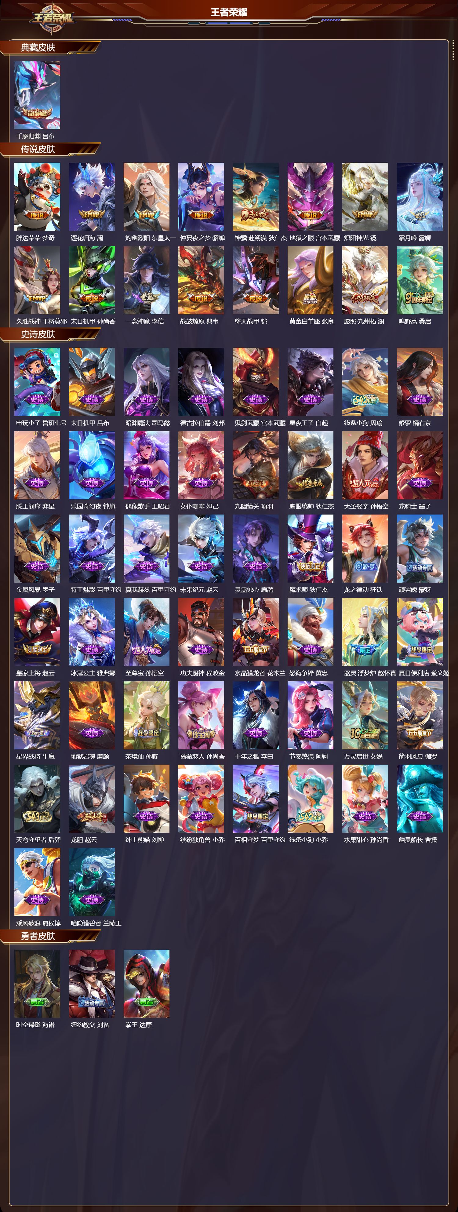 【50,史诗皮肤】电玩小子,鲁班七号,末日机甲,吕布,暗渊魔法,司马懿,德古拉伯爵,刘邦,鬼剑武藏,宫本武藏,星夜王子,白起,线条小狗,周瑜,修罗,橘右京,滕王阁序,弈星,乐园奇幻夜,钟馗,偶像歌手,王昭君,女仆咖啡,妲己,九幽镇关,项羽,鹰眼统帅,狄仁杰,大圣娶亲,孙悟空,龙骑士,墨子,金属风暴,墨子,特工魅影,百里守约,真我赫兹,百里守约,未来纪元,赵云,灵蛊蚀心,扁鹊,魔术师,狄仁杰,龙之律动,狂铁,顽岩魄,蒙犽,皇家上将,赵云,冰冠公主,雅典娜,至尊宝,孙悟空,功夫厨神,程咬金,水晶猎龙者,花木兰,怒海争锋,黄忠,器灵·浮梦炉,赵怀真,夏日便利店,蔡文姬,星界战将,牛魔,地狱岩魂,廉颇,茶境仙,孙膑,蔷薇恋人,孙尚香,千年之狐,李白,节奏热浪,阿轲,万灵启世,女娲,箭羽风息,伽罗,天穹守望者,后羿,龙胆,赵云,绅士熊喵,刘禅,缤纷独角兽,小乔,百相守梦,百里守约,线条小狗,小乔,水果甜心,孙尚香,幽灵船长,曹操,乘风破浪,夏侯惇,暗隐猎兽者,兰陵王,