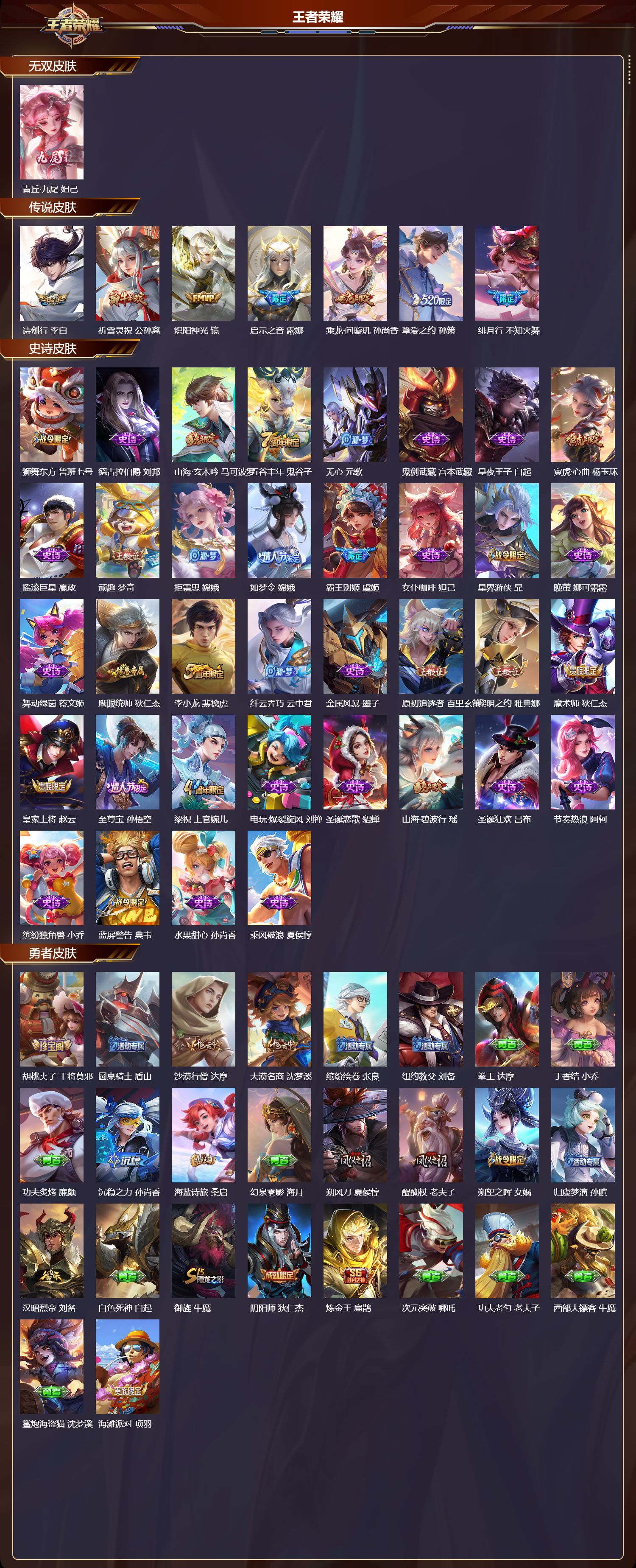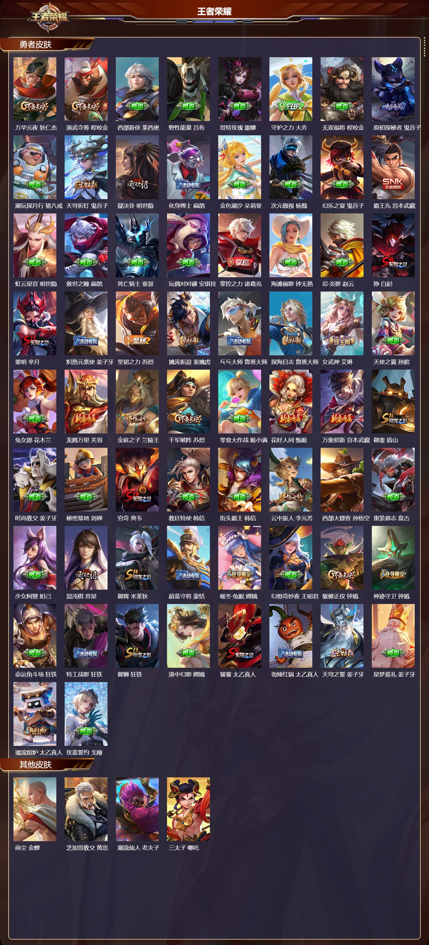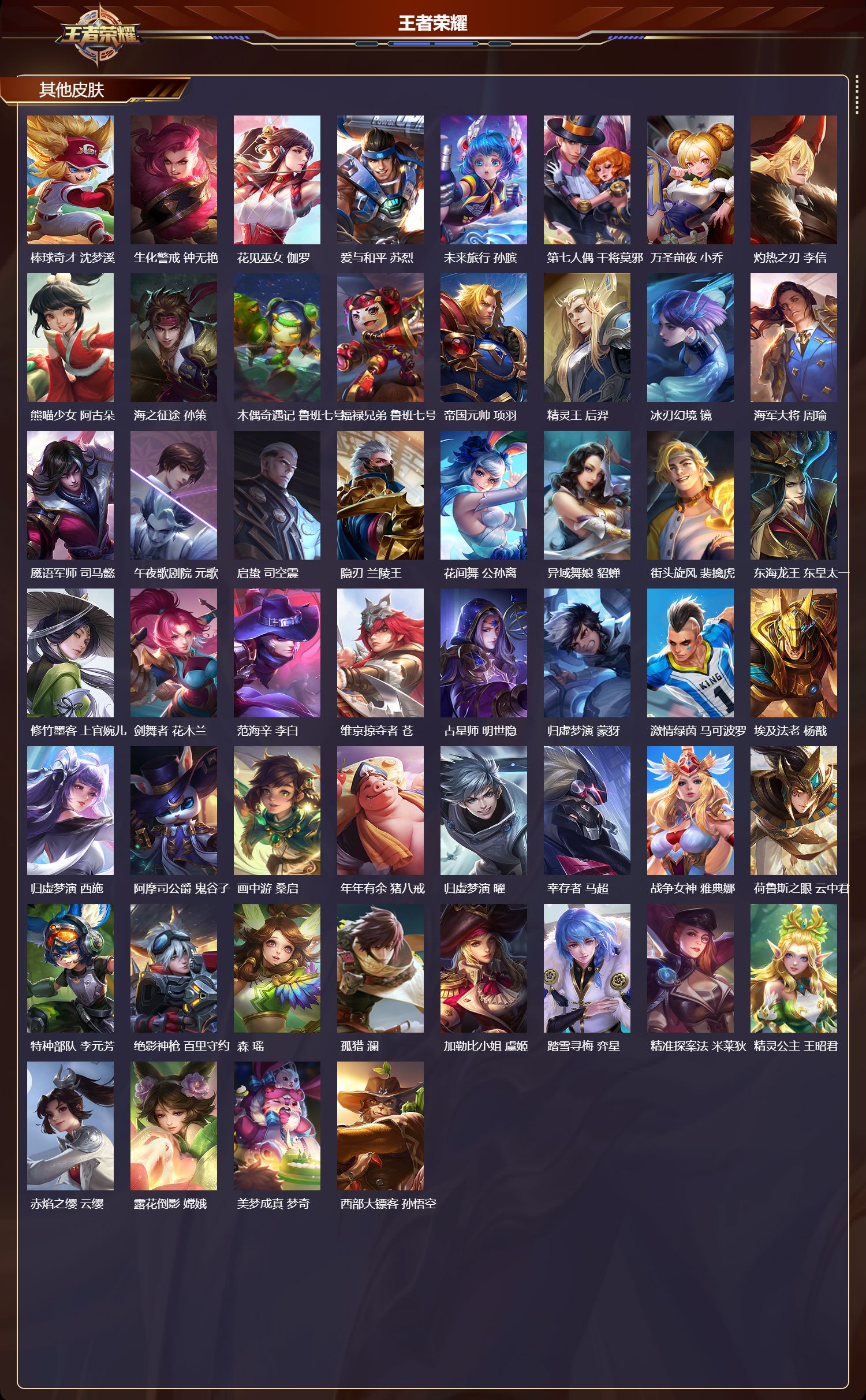 【56,其他皮肤】前尘,金蝉,芝加哥教父,黄忠,潮流仙人,老夫子,三太子,哪吒,棒球奇才,沈梦溪,生化警戒,钟无艳,花见巫女,伽罗,爱与和平,苏烈,未来旅行,孙膑,第七人偶,干将莫邪,万圣前夜,小乔,灼热之刃,李信,熊喵少女,阿古朵,海之征途,孙策,木偶奇遇记,鲁班七号,福禄兄弟,鲁班七号,帝国元帅,项羽,精灵王,后羿,冰刃幻境,镜,海军大将,周瑜,魇语军师,司马懿,午夜歌剧院,元歌,启蛰,司空震,隐刃,兰陵王,花间舞,公孙离,异域舞娘,貂蝉,街头旋风,裴擒虎,东海龙王,东皇太一,修竹墨客,上官婉儿,剑舞者,花木兰,范海辛,李白,维京掠夺者,苍,占星师,明世隐,归虚梦演,蒙犽,激情绿茵,马可波罗,埃及法老,杨戬,归虚梦演,西施,阿摩司公爵,鬼谷子,画中游,桑启,年年有余,猪八戒,归虚梦演,曜,幸存者,马超,战争女神,雅典娜,荷鲁斯之眼,云中君,特种部队,李元芳,绝影神枪,百里守约,森,瑶,孤猎,澜,加勒比小姐,虞姬,踏雪寻梅,弈星,精准探案法,米莱狄,精灵公主,王昭君,赤焰之缨,云缨,露花倒影,嫦娥,美梦成真,梦奇,西部大镖客,孙悟空,
