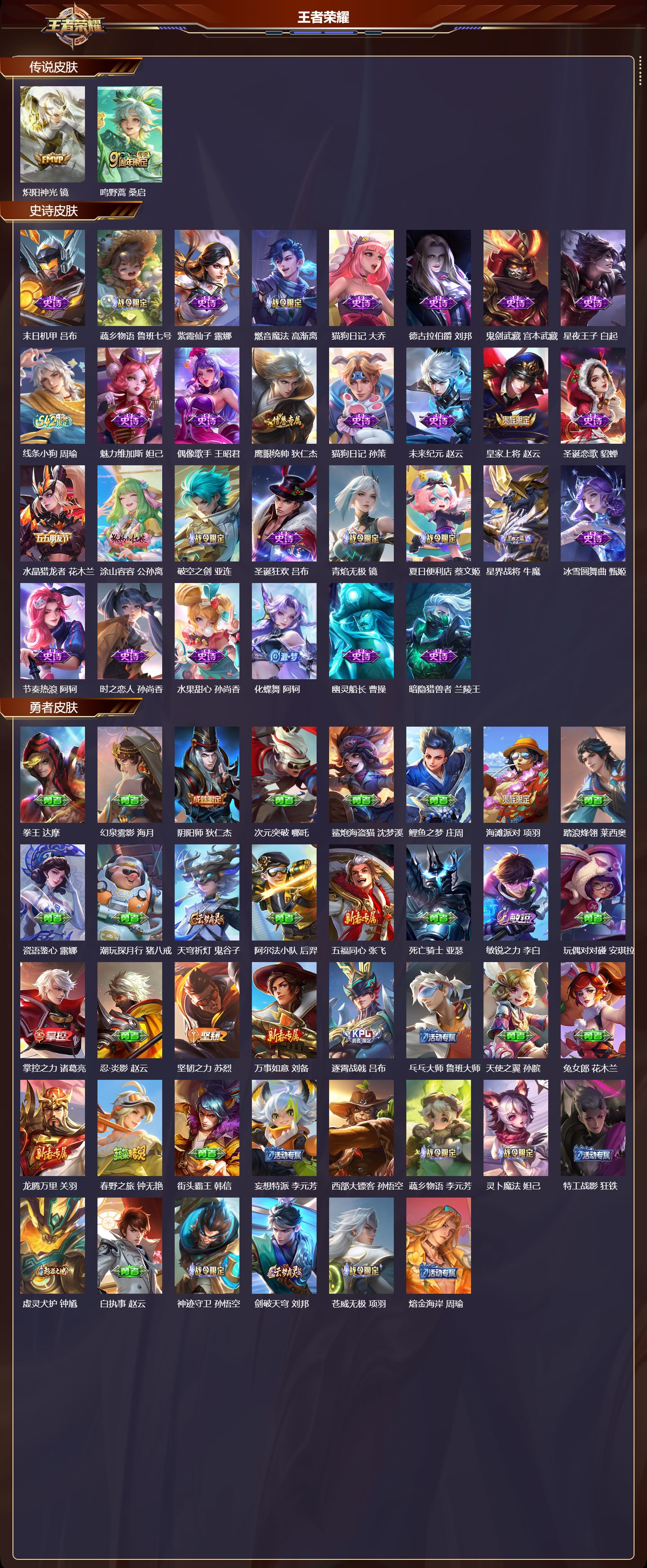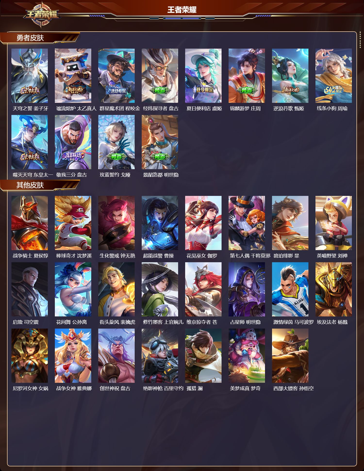 【50,勇者皮肤】,拳王,达摩,幻泉雾影,海月,阴阳师,狄仁杰,次元突破,哪吒,鲨炮海盗猫,沈梦溪,鲤鱼之梦,庄周,海滩派对,项羽,踏浪烽翎,莱西奥,瓷语鉴心,露娜,潮玩探月行,猪八戒,天穹祈灯,鬼谷子,阿尔法小队,后羿,五福同心,张飞,死亡骑士,亚瑟,敏锐之力,李白,玩偶对对碰,安琪拉,掌控之力,诸葛亮,忍·炎影,赵云,坚韧之力,苏烈,万事如意,刘备,逐霄战戟,吕布,乓乓大师,鲁班大师,天使之翼,孙膑,兔女郎,花木兰,龙腾万里,关羽,春野之旅,钟无艳,街头霸王,韩信,妄想特派,李元芳,西部大镖客,孙悟空,蔬乡物语,李元芳,灵卜魔法,妲己,特工战影,狂铁,虚灵犬护,钟馗,白执事,赵云,神迹守卫,孙悟空,剑破天穹,刘邦,苍威无极,项羽,熔金海岸,周瑜,天穹之誓,姜子牙,谧流熔炉,太乙真人,群星魔术团,程咬金,经纬探寻者,盘古,夏日便利店,虞姬,锦麟游梦,庄周,逆浪荇歌,甄姬,线条小狗,周瑜,噬灭天穹,东皇太一,敬我三分,盘古,玫蓝誓约,戈娅,景韶洛都,明世隐,