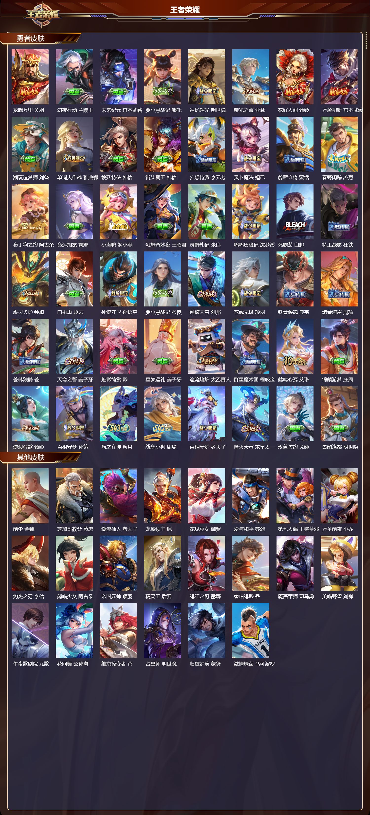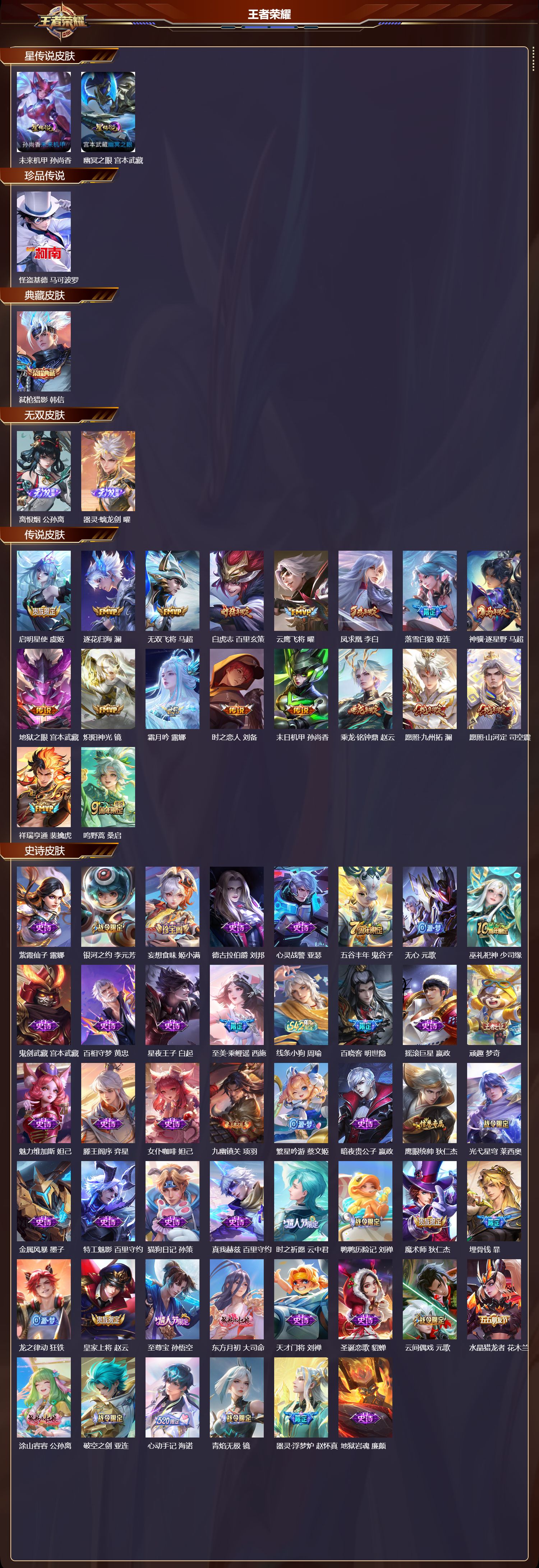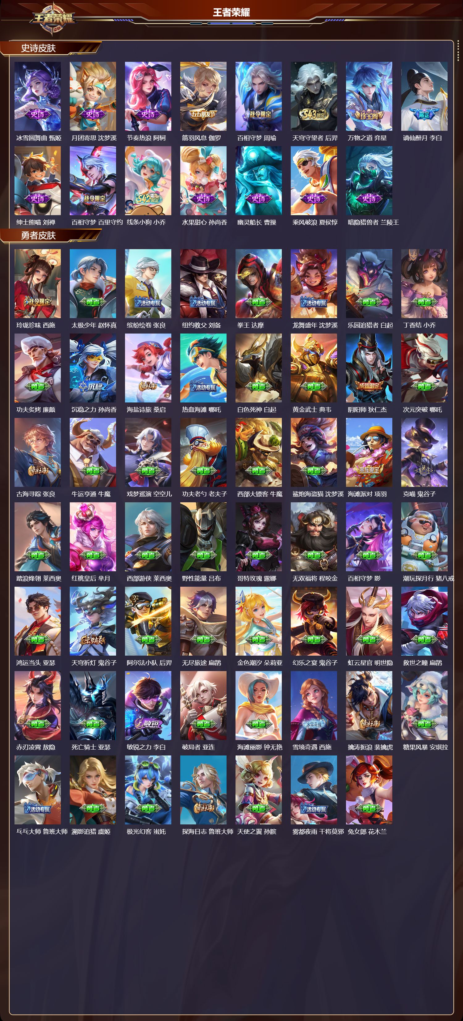 【61,史诗皮肤】,紫霞仙子,露娜,银河之约,李元芳,妄想食味,姬小满,德古拉伯爵,刘邦,心灵战警,亚瑟,五谷丰年,鬼谷子,无心,元歌,巫礼祀神,少司缘,鬼剑武藏,宫本武藏,百相守梦,黄忠,星夜王子,白起,至美·乘鲤谣,西施,线条小狗,周瑜,百晓客,明世隐,摇滚巨星,嬴政,顽趣,梦奇,魅力维加斯,妲己,滕王阁序,弈星,女仆咖啡,妲己,九幽镇关,项羽,繁星吟游,蔡文姬,暗夜贵公子,嬴政,鹰眼统帅,狄仁杰,光弋星穹,莱西奥,金属风暴,墨子,特工魅影,百里守约,猫狗日记,孙策,真我赫兹,百里守约,时之祈愿,云中君,鸭鸭历险记,刘禅,魔术师,狄仁杰,埋骨钱,暃,龙之律动,狂铁,皇家上将,赵云,至尊宝,孙悟空,东方月初,大司命,天才门将,刘禅,圣诞恋歌,貂蝉,云间偶戏,元歌,水晶猎龙者,花木兰,涂山容容,公孙离,破空之剑,亚连,心动手记,海诺,青焰无极,镜,器灵·浮梦炉,赵怀真,地狱岩魂,廉颇,冰雪圆舞曲,甄姬,月团寄思,沈梦溪,节奏热浪,阿轲,箭羽风息,伽罗,百相守梦,周瑜,天穹守望者,后羿,万物之道,弈星,谪仙醉月,李白,绅士熊喵,刘禅,百相守梦,百里守约,线条小狗,小乔,水果甜心,孙尚香,幽灵船长,曹操,乘风破浪,夏侯惇,暗隐猎兽者,兰陵王,