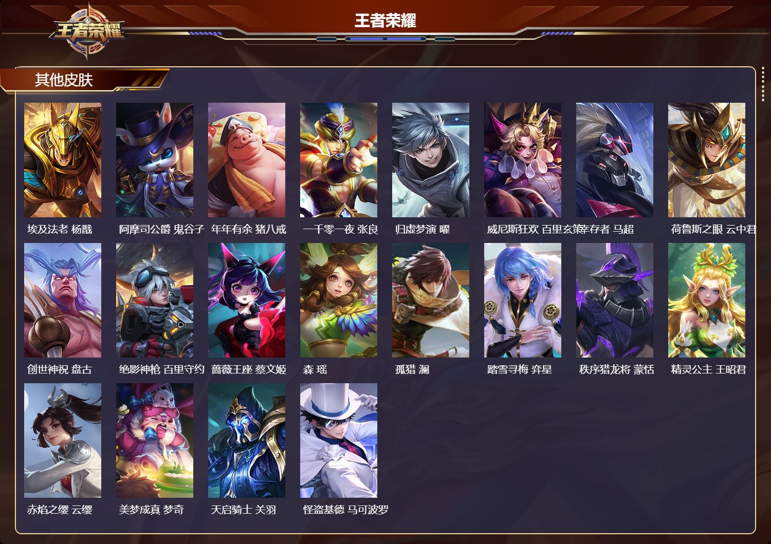 【42,其他皮肤】,前尘,金蝉,芝加哥教父,黄忠,潮流仙人,老夫子,龙域领主,铠,花见巫女,伽罗,爱与和平,苏烈,第七人偶,干将莫邪,万圣前夜,小乔,灼热之刃,李信,熊喵少女,阿古朵,帝国元帅,项羽,精灵王,后羿,绯红之刃,露娜,碧珀绯影,暃,魇语军师,司马懿,英喵野望,刘禅,午夜歌剧院,元歌,花间舞,公孙离,维京掠夺者,苍,占星师,明世隐,归虚梦演,蒙犽,激情绿茵,马可波罗,埃及法老,杨戬,阿摩司公爵,鬼谷子,年年有余,猪八戒,一千零一夜,张良,归虚梦演,曜,威尼斯狂欢,百里玄策,幸存者,马超,荷鲁斯之眼,云中君,创世神祝,盘古,绝影神枪,百里守约,蔷薇王座,蔡文姬,森,瑶,孤猎,澜,踏雪寻梅,弈星,秩序猎龙将,蒙恬,精灵公主,王昭君,赤焰之缨,云缨,美梦成真,梦奇,天启骑士,关羽,怪盗基德,马可波罗,