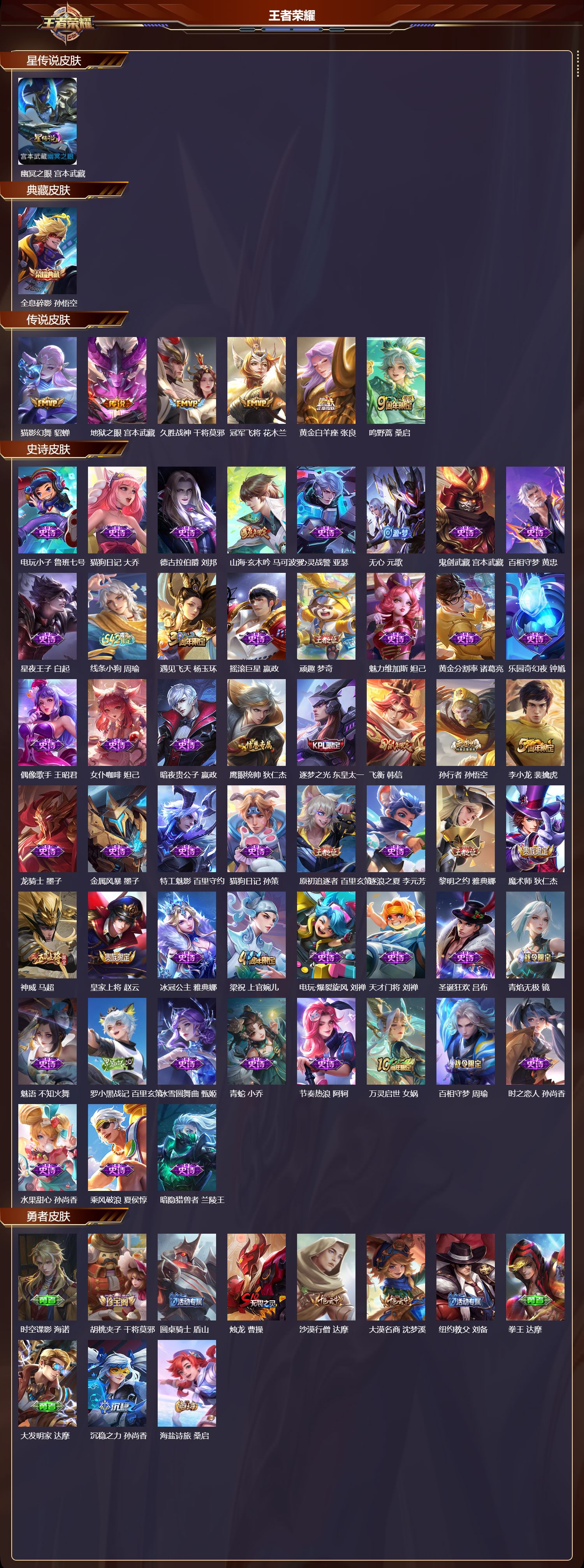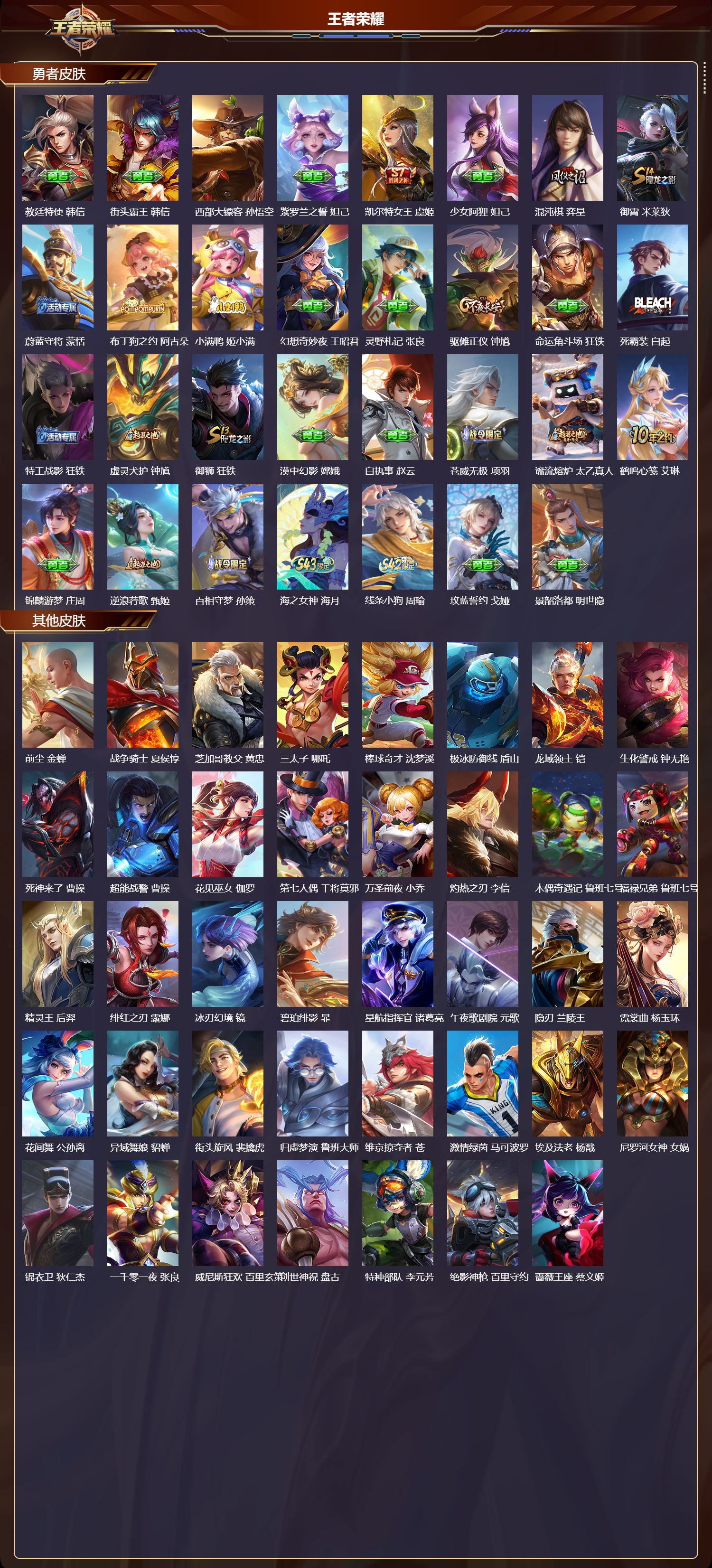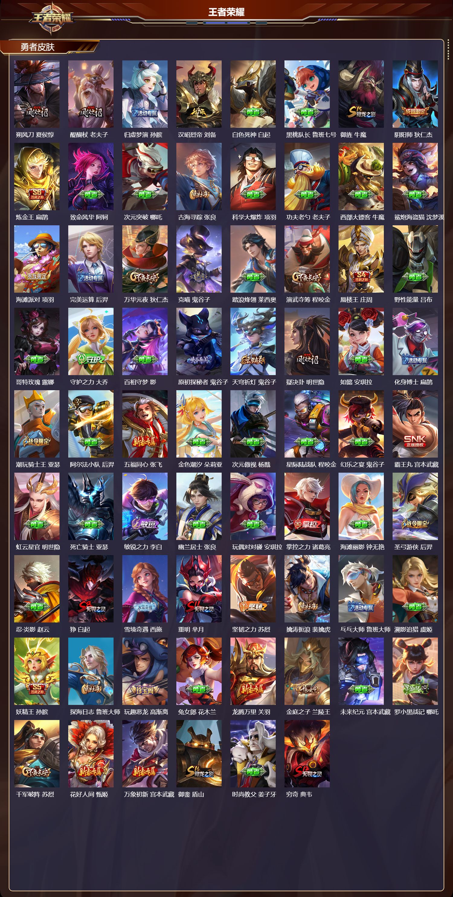 【112,勇者皮肤】,时空谍影,海诺,胡桃夹子,干将莫邪,圆桌骑士,盾山,烛龙,曹操,沙漠行僧,达摩,大漠名商,沈梦溪,纽约教父,刘备,拳王,达摩,大发明家,达摩,沉稳之力,孙尚香,海盐诗旅,桑启,朔风刀,夏侯惇,醍醐杖,老夫子,归虚梦演,孙膑,汉昭烈帝,刘备,白色死神,白起,黑桃队长,鲁班七号,御旌,牛魔,阴阳师,狄仁杰,炼金王,扁鹊,致命风华,阿轲,次元突破,哪吒,古海寻踪,张良,科学大爆炸,项羽,功夫老勺,老夫子,西部大镖客,牛魔,鲨炮海盗猫,沈梦溪,海滩派对,项羽,完美运算,后羿,万华元夜,狄仁杰,克喵,鬼谷子,踏浪烽翎,莱西奥,演武夺筹,程咬金,蜃楼王,庄周,野性能量,吕布,哥特玫瑰,露娜,守护之力,大乔,百相守梦,影,原初探秘者,鬼谷子,天穹祈灯,鬼谷子,疑决卦,明世隐,如懿,安琪拉,化身博士,扁鹊,潮玩骑士王,亚瑟,阿尔法小队,后羿,五福同心,张飞,金色潮汐,朵莉亚,次元傲视,杨戬,星际陆战队,程咬金,幻乐之宴,鬼谷子,霸王丸,宫本武藏,虹云星官,明世隐,死亡骑士,亚瑟,敏锐之力,李白,幽兰居士,张良,玩偶对对碰,安琪拉,掌控之力,诸葛亮,海滩丽影,钟无艳,圣弓游侠,后羿,忍·炎影,赵云,狰,白起,雪境奇遇,西施,重明,芈月,坚韧之力,苏烈,擒涛扼浪,裴擒虎,乓乓大师,鲁班大师,溯影追猎,虞姬,妖精王,孙膑,探海日志,鲁班大师,玩趣恶龙,高渐离,兔女郎,花木兰,龙腾万里,关羽,金庭之子,兰陵王,未来纪元,宫本武藏,罗小黑战记,哪吒,千军破阵,苏烈,花好人间,甄姬,万象初新,宫本武藏,御銮,盾山,时尚教父,姜子牙,穷奇,典韦,教廷特使,韩信,街头霸王,韩信,西部大镖客,孙悟空,紫罗兰之誓,妲己,凯尔特女王,虞姬,少女阿狸,妲己,混沌棋,弈星,御霄,米莱狄,蔚蓝守将,蒙恬,布丁狗之约,阿古朵,小满鸭,姬小满,幻想奇妙夜,王昭君,灵野札记,张良,驱傩正仪,钟馗,命运角斗场,狂铁,死霸装,白起,特工战影,狂铁,虚灵犬护,钟馗,御狮,狂铁,漠中幻影,嫦娥,白执事,赵云,苍威无极,项羽,谧流熔炉,太乙真人,鹤鸣心笺,艾琳,锦麟游梦,庄周,逆浪荇歌,甄姬,百相守梦,孙策,海之女神,海月,线条小狗,周瑜,玫蓝誓约,戈娅,景韶洛都,明世隐,