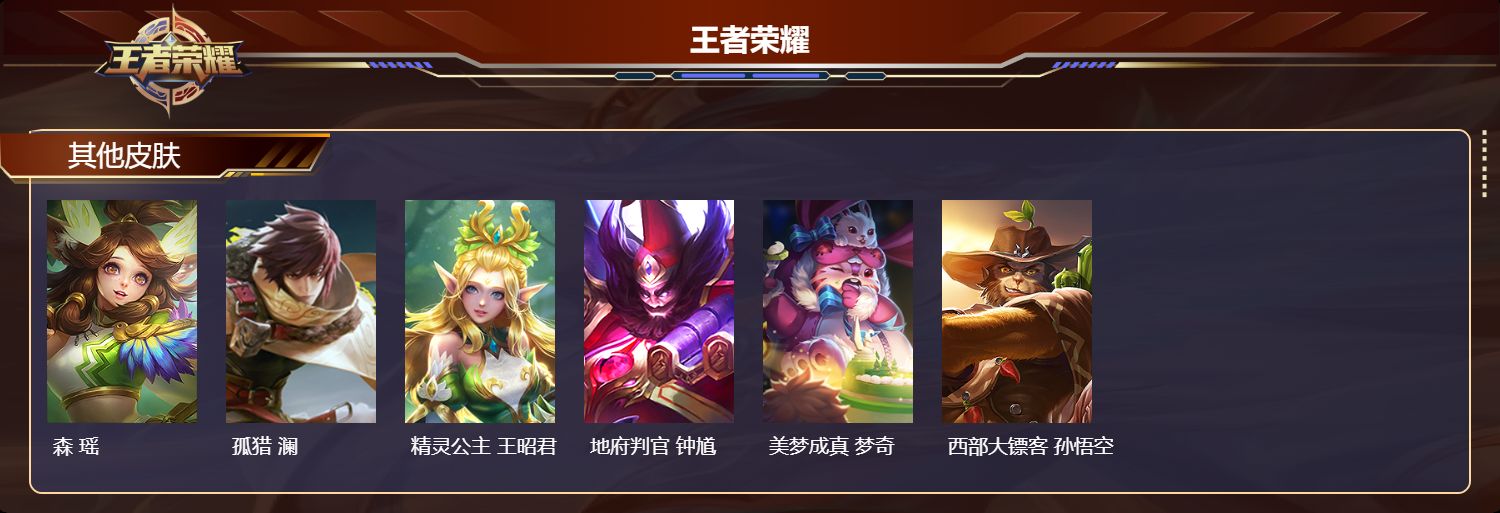 【45,其他皮肤】,前尘,金蝉,战争骑士,夏侯惇,芝加哥教父,黄忠,三太子,哪吒,棒球奇才,沈梦溪,极冰防御线,盾山,龙域领主,铠,生化警戒,钟无艳,死神来了,曹操,超能战警,曹操,花见巫女,伽罗,第七人偶,干将莫邪,万圣前夜,小乔,灼热之刃,李信,木偶奇遇记,鲁班七号,福禄兄弟,鲁班七号,精灵王,后羿,绯红之刃,露娜,冰刃幻境,镜,碧珀绯影,暃,星航指挥官,诸葛亮,午夜歌剧院,元歌,隐刃,兰陵王,霓裳曲,杨玉环,花间舞,公孙离,异域舞娘,貂蝉,街头旋风,裴擒虎,归虚梦演,鲁班大师,维京掠夺者,苍,激情绿茵,马可波罗,埃及法老,杨戬,尼罗河女神,女娲,锦衣卫,狄仁杰,一千零一夜,张良,威尼斯狂欢,百里玄策,创世神祝,盘古,特种部队,李元芳,绝影神枪,百里守约,蔷薇王座,蔡文姬,森,瑶,孤猎,澜,精灵公主,王昭君,地府判官,钟馗,美梦成真,梦奇,西部大镖客,孙悟空,