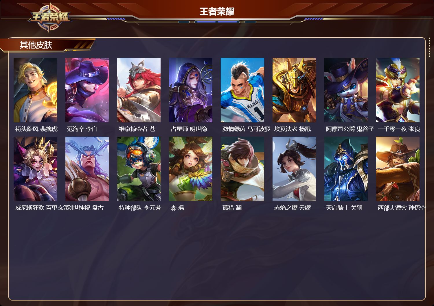 【34,其他皮肤】,金属狂潮,高渐离,前尘,金蝉,芝加哥教父,黄忠,三太子,哪吒,极冰防御线,盾山,龙域领主,铠,生化警戒,钟无艳,灼热之刃,李信,海之征途,孙策,木偶奇遇记,鲁班七号,精灵王,后羿,海军大将,周瑜,星航指挥官,诸葛亮,魇语军师,司马懿,英喵野望,刘禅,启蛰,司空震,花间舞,公孙离,异域舞娘,貂蝉,街头旋风,裴擒虎,范海辛,李白,维京掠夺者,苍,占星师,明世隐,激情绿茵,马可波罗,埃及法老,杨戬,阿摩司公爵,鬼谷子,一千零一夜,张良,威尼斯狂欢,百里玄策,创世神祝,盘古,特种部队,李元芳,森,瑶,孤猎,澜,赤焰之缨,云缨,天启骑士,关羽,西部大镖客,孙悟空,
