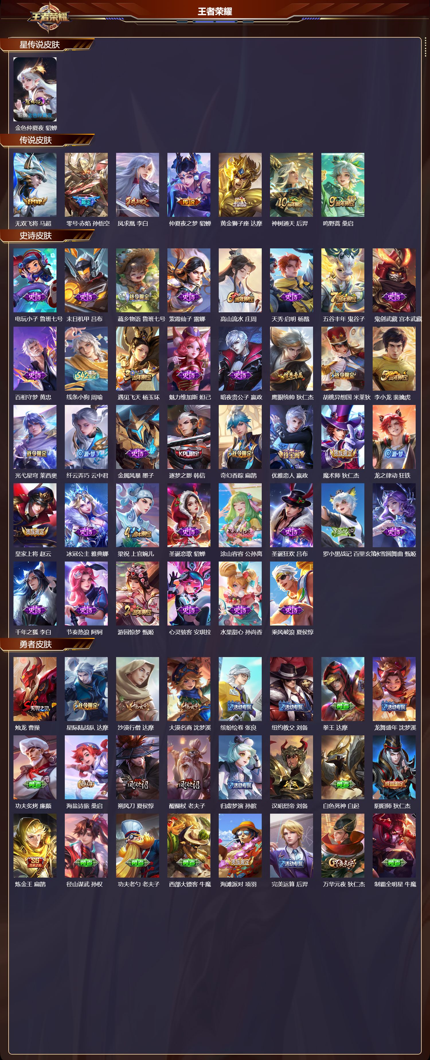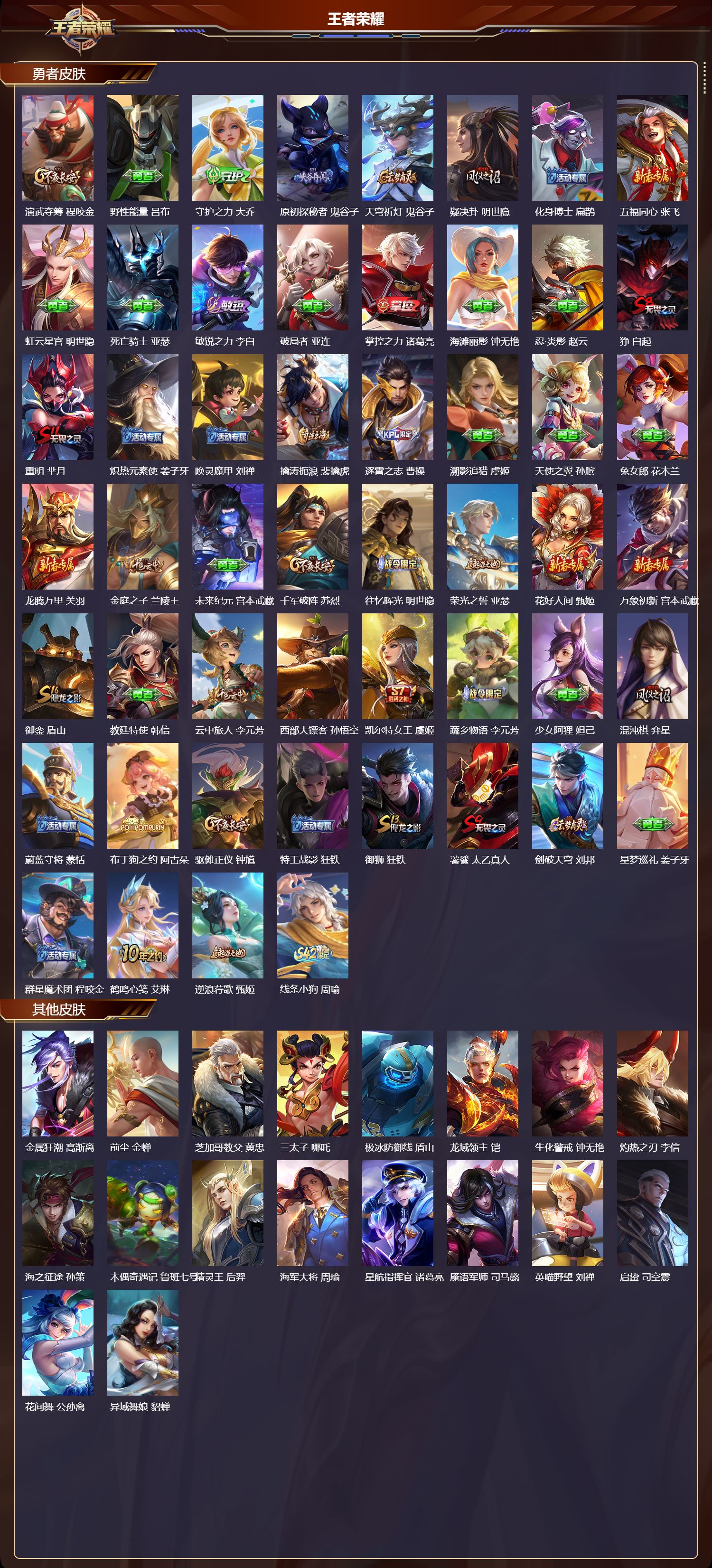 【76,勇者皮肤】,烛龙,曹操,星际陆战队,达摩,沙漠行僧,达摩,大漠名商,沈梦溪,缤纷绘卷,张良,纽约教父,刘备,拳王,达摩,龙舞盛年,沈梦溪,功夫炙烤,廉颇,海盐诗旅,桑启,朔风刀,夏侯惇,醍醐杖,老夫子,归虚梦演,孙膑,汉昭烈帝,刘备,白色死神,白起,阴阳师,狄仁杰,炼金王,扁鹊,径山谋武,孙权,功夫老勺,老夫子,西部大镖客,牛魔,海滩派对,项羽,完美运算,后羿,万华元夜,狄仁杰,制霸全明星,牛魔,演武夺筹,程咬金,野性能量,吕布,守护之力,大乔,原初探秘者,鬼谷子,天穹祈灯,鬼谷子,疑决卦,明世隐,化身博士,扁鹊,五福同心,张飞,虹云星官,明世隐,死亡骑士,亚瑟,敏锐之力,李白,破局者,亚连,掌控之力,诸葛亮,海滩丽影,钟无艳,忍·炎影,赵云,狰,白起,重明,芈月,炽热元素使,姜子牙,唤灵魔甲,刘禅,擒涛扼浪,裴擒虎,逐霄之志,曹操,溯影追猎,虞姬,天使之翼,孙膑,兔女郎,花木兰,龙腾万里,关羽,金庭之子,兰陵王,未来纪元,宫本武藏,千军破阵,苏烈,往忆晖光,明世隐,荣光之誓,亚瑟,花好人间,甄姬,万象初新,宫本武藏,御銮,盾山,教廷特使,韩信,云中旅人,李元芳,西部大镖客,孙悟空,凯尔特女王,虞姬,蔬乡物语,李元芳,少女阿狸,妲己,混沌棋,弈星,蔚蓝守将,蒙恬,布丁狗之约,阿古朵,驱傩正仪,钟馗,特工战影,狂铁,御狮,狂铁,饕餮,太乙真人,剑破天穹,刘邦,星梦巡礼,姜子牙,群星魔术团,程咬金,鹤鸣心笺,艾琳,逆浪荇歌,甄姬,线条小狗,周瑜,