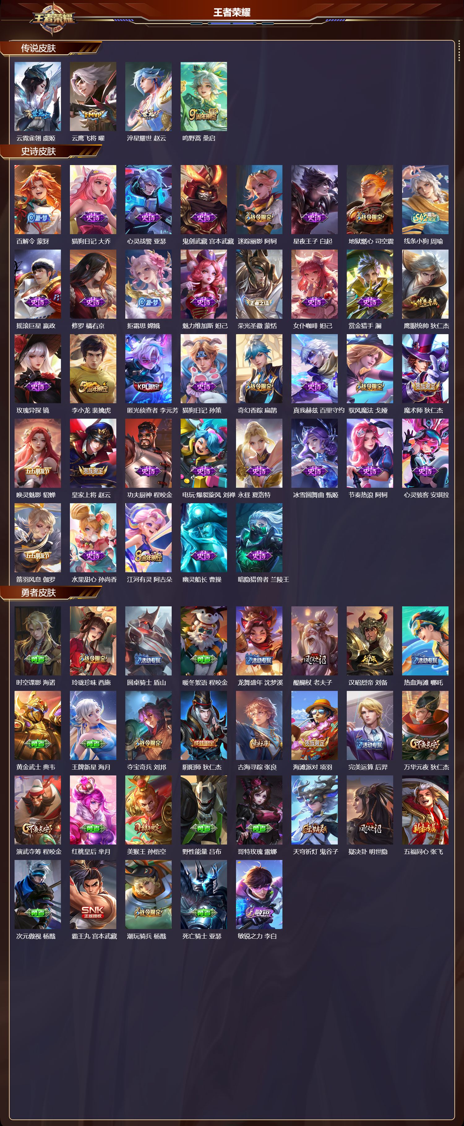 【37,史诗皮肤】,百解令,蒙犽,猫狗日记,大乔,心灵战警,亚瑟,鬼剑武藏,宫本武藏,迷踪丽影,阿轲,星夜王子,白起,地狱燃心,司空震,线条小狗,周瑜,摇滚巨星,嬴政,修罗,橘右京,拒霜思,嫦娥,魅力维加斯,妲己,荣光圣徽,蒙恬,女仆咖啡,妲己,赏金猎手,澜,鹰眼统帅,狄仁杰,玫瑰异探,镜,李小龙,裴擒虎,匿光侦查者,李元芳,猫狗日记,孙策,奇幻香踪,扁鹊,真我赫兹,百里守约,驭风魔法,戈娅,魔术师,狄仁杰,唤灵魅影,貂蝉,皇家上将,赵云,功夫厨神,程咬金,电玩·爆裂旋风,刘禅,永昼,夏洛特,冰雪圆舞曲,甄姬,节奏热浪,阿轲,心灵骇客,安琪拉,箭羽风息,伽罗,水果甜心,孙尚香,江河有灵,阿古朵,幽灵船长,曹操,暗隐猎兽者,兰陵王,