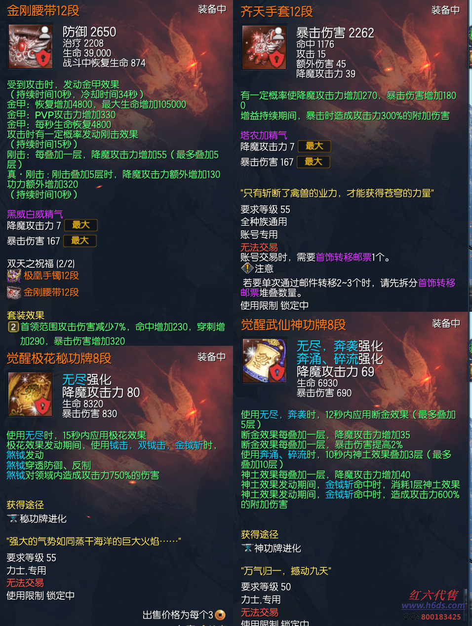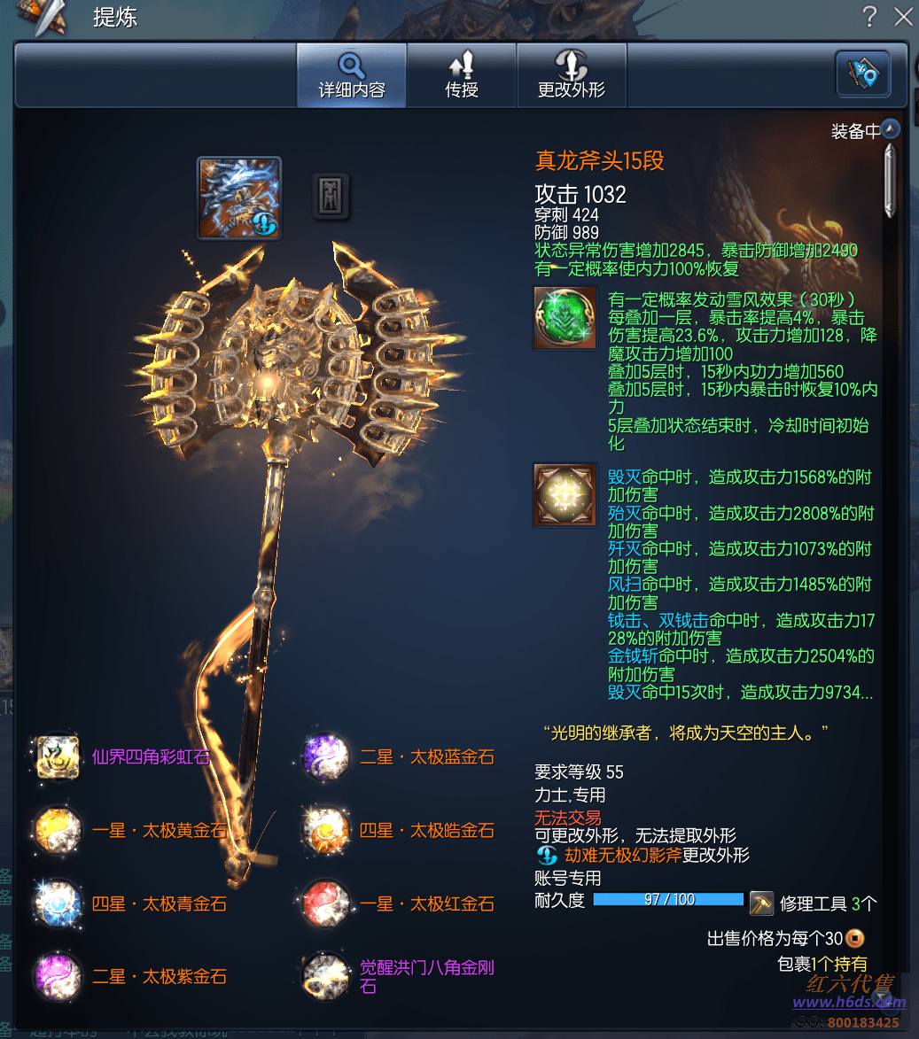 J13538,无日峰力士,侠义团112段,仙界四角彩虹石,四星太极石x2,二星太极石x2,一星太极石x2,雪峰元气石15段,征伐真气石15段,雪峰斧头15段,真龙斧头15段,卓越蟠桃戒指3段,卓越雪峰耳环3段,卓越雪峰项链3段,金刚腰带12段,极凰手镯12段,齐天手套12段,觉醒极花秘功牌8段,觉醒武仙神功牌8段,毁灭南天魂15段,黄龙灵15段,曙光守护石2段,金雷星15段,衣服173,《雪峰15.。真龙15.。双武器。。。爆伤牌子15张。。。爆发7000W。。稳定3500W,金币材料不送》 20000R,