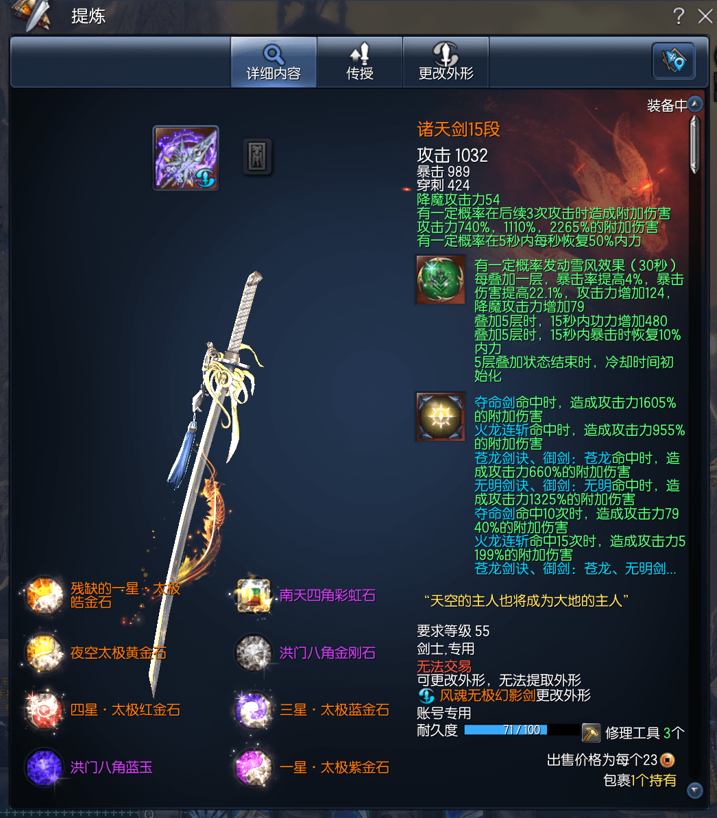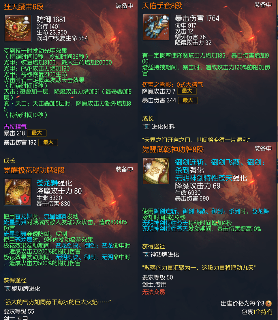 J13692,电二花样年华剑士,侠义团115段,南天四角彩虹石,四星太极石,三星太极石,雪峰元气石11段,征伐真气石13段,诸天剑15段,卓越天目戒指3段,卓越邪花耳环3段,邪花项链10段,泰王项链1段,光雾手镯12段,狂天腰带6段,天佑手套8段,觉醒极花秘功牌8段,觉醒武乾神功牌8段,毁灭梦幻魂15段,凤凰灵9段,烬灭守护石5段,晨晖星12段,衣服260,《细节账号 神秘水还有600多瓶 各种书籍各种宝玉神物 可以提升刀雪峰毕业,仓库有一个三级手镯箱,一手号,起手4000稳定1300,圣地结算1200》2000R,