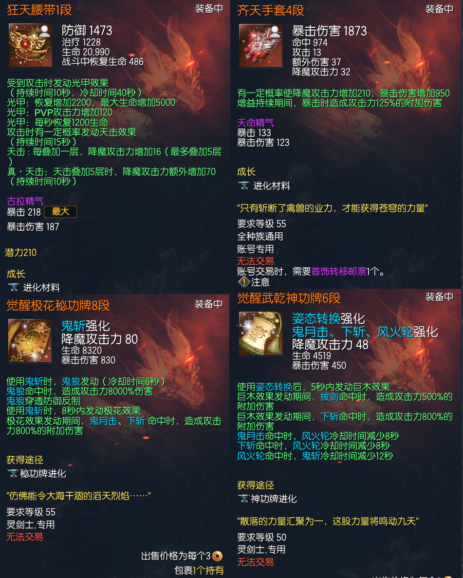 J15019,无日峰灵剑士,侠义团84段,仙界四角彩虹石,四星太极石,二星太极石,一星太极石,雪峰元气石15段,征伐真气石15段,雪峰灵剑14段,卓越蟠桃戒指3段,卓越邪花耳环1段,卓越邪花项链3段,极凰手镯6段,狂天腰带1段,齐天手套4段,觉醒极花秘功牌8段,觉醒武乾神功牌6段,毁灭南天魂11段,凤凰灵2段,极限守护石3段,晨晖星15段,衣服46,《LOL艾欧尼亚基本全英雄白金号,开场5200W~5500W稳定2200W(打木桩)仓库内有八张爆伤牌子》2800R,