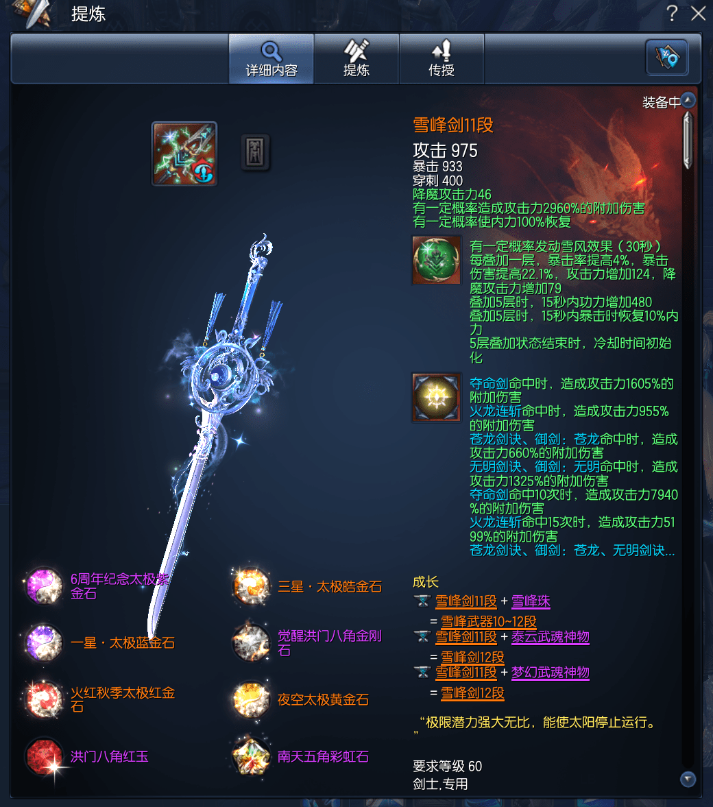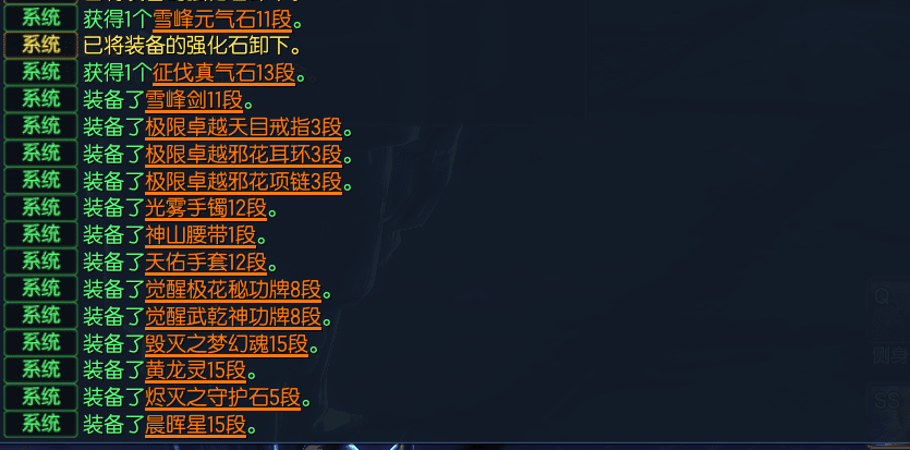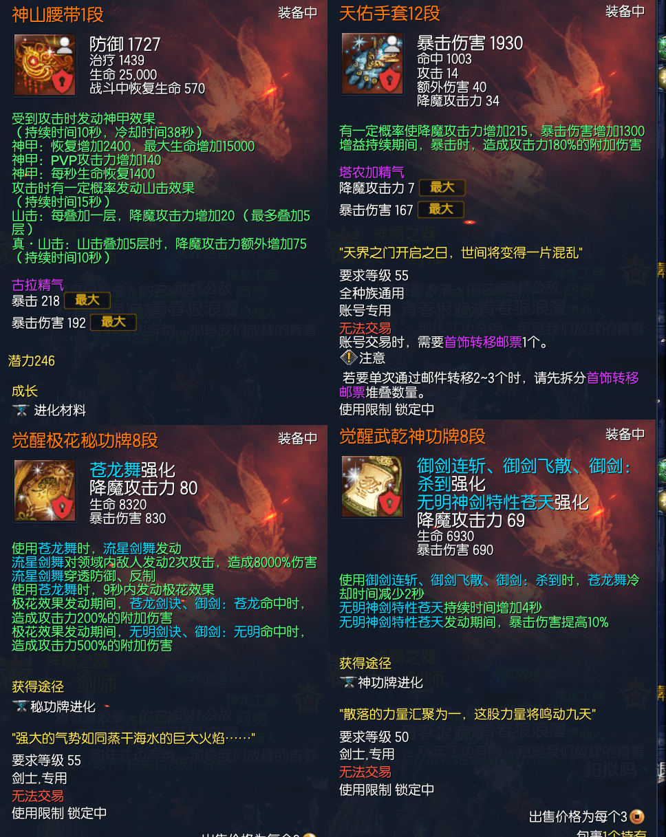 J15114,无日峰剑士,侠义团81段,南天五角彩虹石,三星太极石,一星太极石,雪峰元气石11段,征伐真气石13段,雪峰剑11段,卓越天目戒指3段,卓越邪花耳环3段,卓越邪花项链3段,光雾手镯12段,神山腰带1段,天佑手套12段,觉醒极花秘功牌8段,觉醒武乾神功牌8段,毁灭梦幻魂15段,黄龙灵15段,烬灭守护石5段,晨晖星15段,衣服84,2500R,