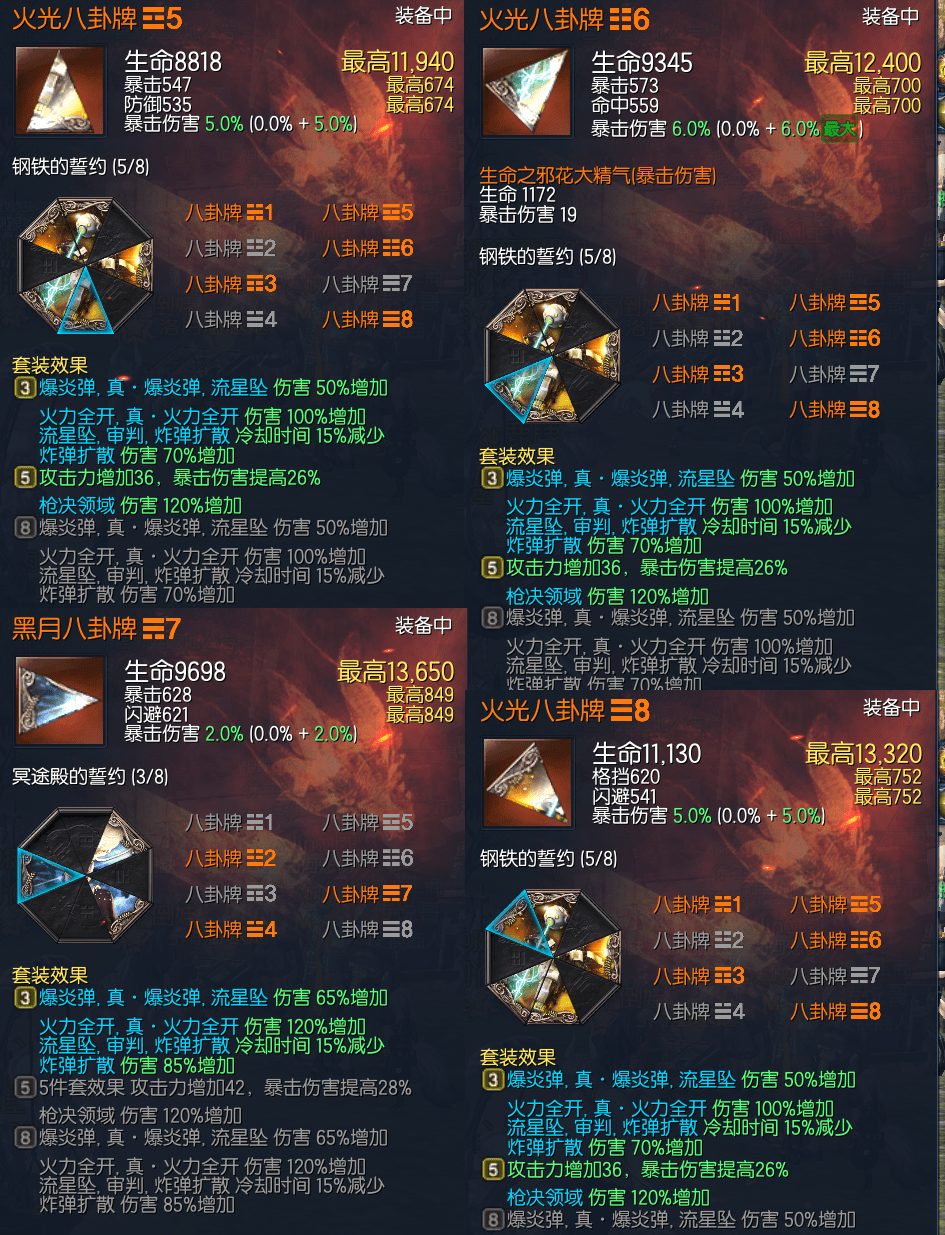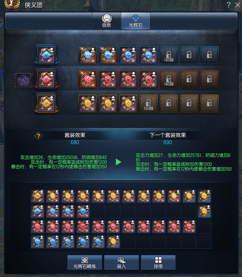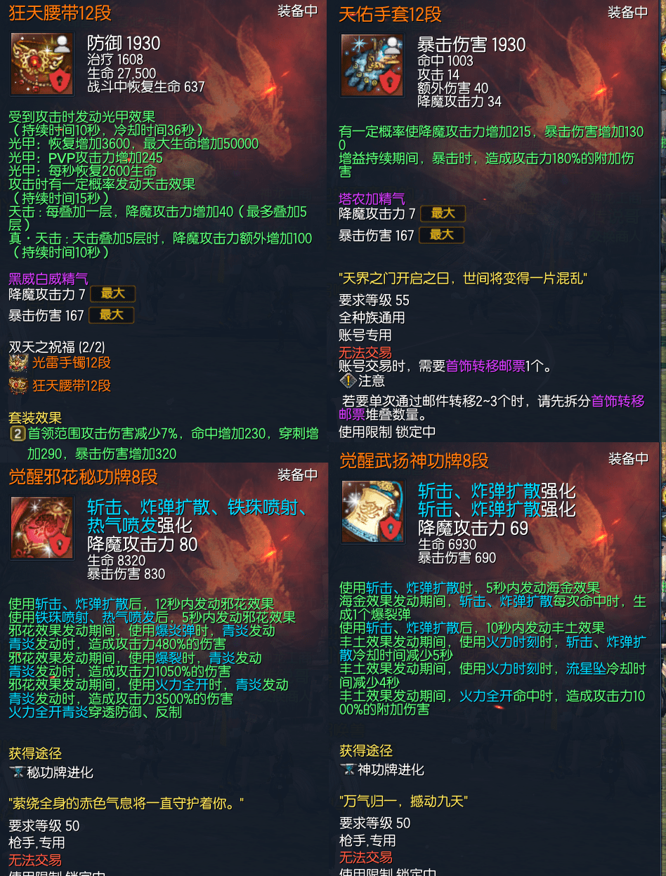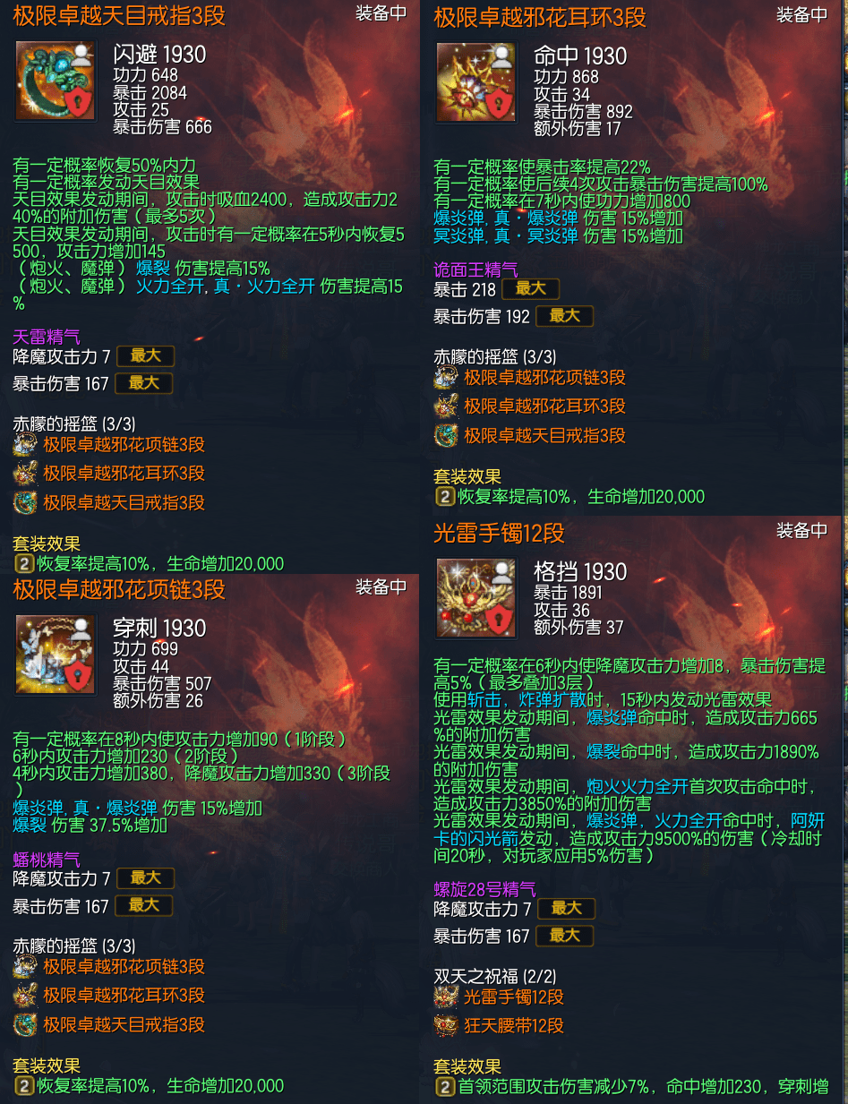 J15226,侠义团等级110,真龙枪11 南天六角彩虹石 五星太极石*1三星太极石*2 二星太极石 一星太极石*2 黑月元气11征伐真气11 雪峰枪11 极限卓越天目戒指3 极限卓越邪花耳环3 极限卓越邪花项链3 光雷手镯12 狂天腰带12 天佑手套12 觉醒邪花秘功8 觉醒武扬神功8 毁灭南天11 黄龙15 不灭5 晨晖15,八卦牌 黑月3雪峰5,称号 一箭倾心 侠之大者 武神传人,衣柜221,(定制13)幻影武器;风魂/混沌/炎魂/丹青/芙蕖。觉醒幻影石;玄武。幻影技能;雪影纷纷 圣诞气息 芙蕖无极。起手6000稳定2100 神秘水764,爆伤牌6张 5500R可包中,