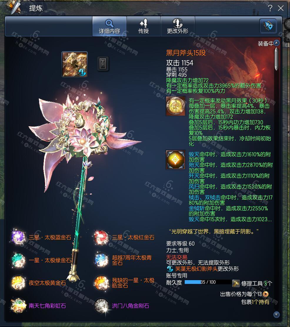 J15740,无日峰力士,侠义团102段,三星太极石×2,南天七角彩虹石,黑月斧头15,黑月元气15,黑月真气11,极限卓越蟠桃戒指3,极限卓越雪峰耳环3,极限卓越雪峰项链3,极凰手镯12,狂天腰带12,齐天手套12,觉醒极花秘功牌8,觉醒武仙神功牌8,毁灭南天魂15,黄龙灵15,烬灭守护石1,金雷星11,衣服108件,茉花相闻焕彩石,6000R,