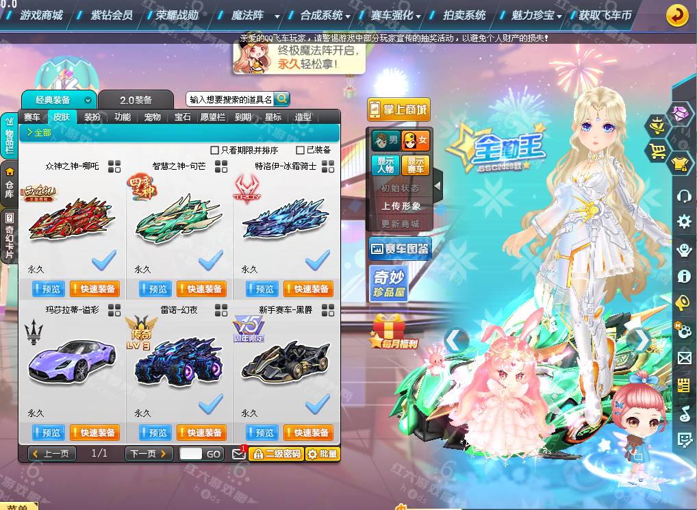 DS3074,红六更号裙777584596【电信一区】魅力1.5W,荣誉21w,S车:智慧之神句芒+29,特洛伊冰霜骑士,众神之神哪吒,A车*14,T1*1,C车:飞碟,骑宠*18:艾丽莎+9,星河绘画师,坐骑*4,套装男30页:神笔马良/炽焰战警,套装女20页:炽焰战警/神笔马良,2088R,
