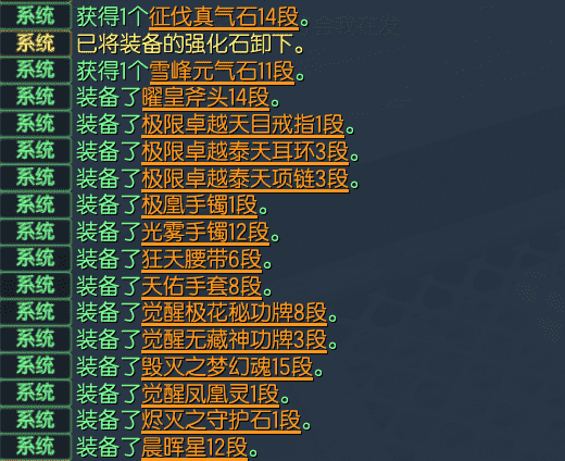 10680,无日峰力士,侠义团69段,三星太极石X1,雪峰元气石11段,征伐真气石14段,曜皇斧头14段,极限卓越天目戒指1段,极限卓越泰天耳环3段,极限卓越泰天项链3段,狂天腰带6段,天佑手套8段,光雾手镯12段,极凰手镯1段,觉醒极花秘功牌8段,觉醒无藏神功牌3段,毁灭之梦幻魂15段,觉醒凤凰灵1段,烬灭之守护石1段,晨晖星12段,衣服131件,10000R,