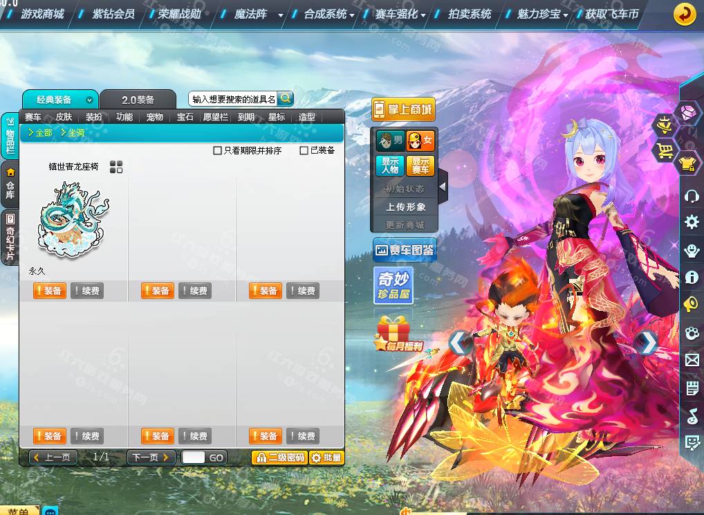 DS3355,红六更号裙762771576【电信一区】魅力:5532,荣誉:140W,紫钻3,三四至尊影龙/烛龙+29,暗影龙骑,A车*2,骑宠:哪吒三太子+10,坐骑*1,套装男5页,套装女4页:烛龙弄焰,9900R,