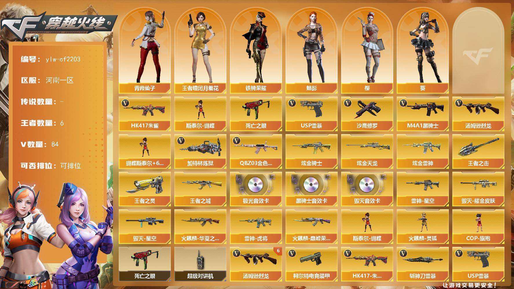 PX_2551682-】:河南一区-84V-6王者-3炫金 【热门武器】:QBZ03-金色蔷薇,HK417-朱雀,死亡之眼,M4A1-黑骑士*4,汤姆逊-烈龙*7,加特林-炼狱*2,斯泰尔-蝴蝶,USP-雷暴,沙鹰-修罗*5 【王者炫金武器】:炫金骑士,炫金天龙,炫金雷神,王者之城,王者之灵,王者之击 【音效卡】:M4A1-黑骑士音效卡,Barrett-毁灭音效卡,Barrett-极光音效卡 【稀有皮肤】