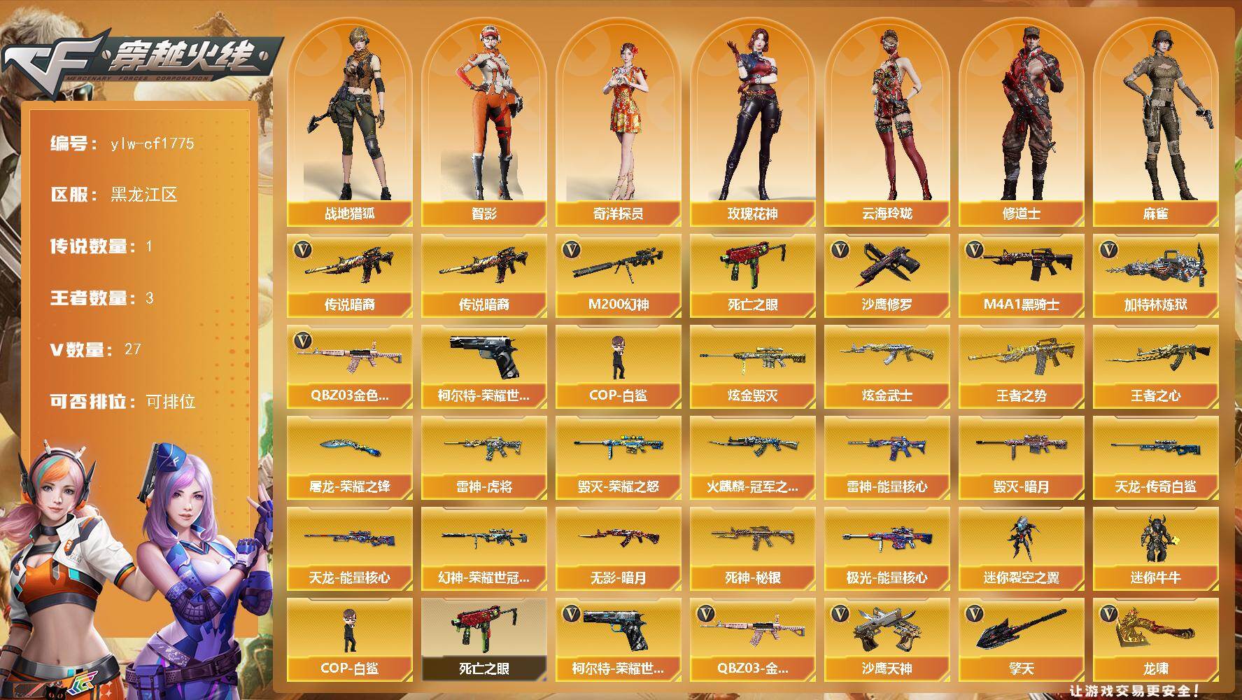 PX_2551696-27V-3王者-2炫金 【传说武器】:传说暗裔 【热门武器】:传说暗裔,QBZ03-金色蔷薇,M200-幻神,柯尔特-荣耀世冠白鲨2023,死亡之眼,M4A1-黑骑士,加特林-炼狱,COP-白鲨,沙鹰-修罗*2 【王者炫金武器】:王者之势,王者之心,炫金武士,炫金毁灭 【皮肤】:幻神-荣耀世冠白鲨2023,皮肤,雷神-能量核心,雷神-虎将,火麒麟-冠军之心,毁灭-暗月,毁灭-荣耀之怒