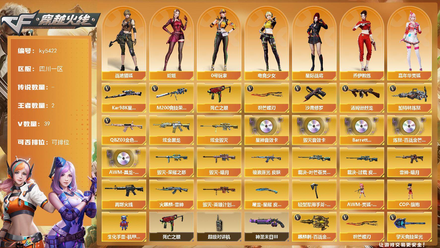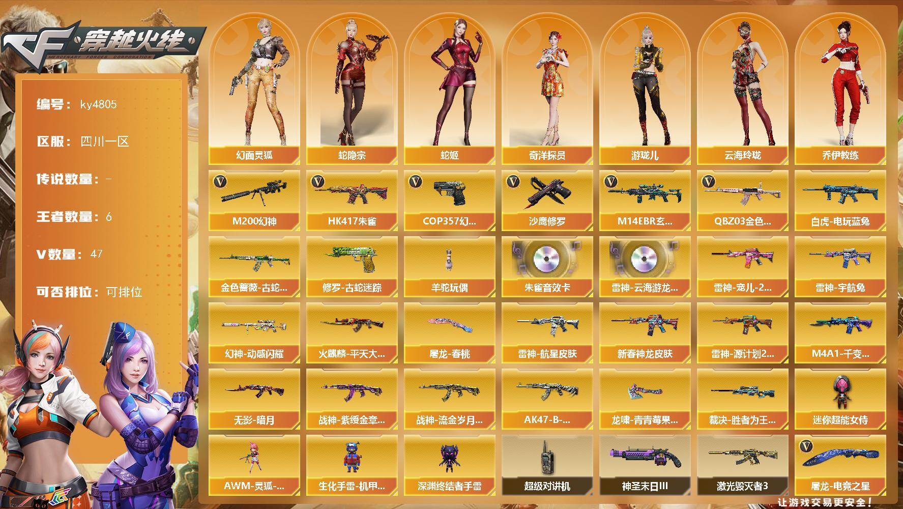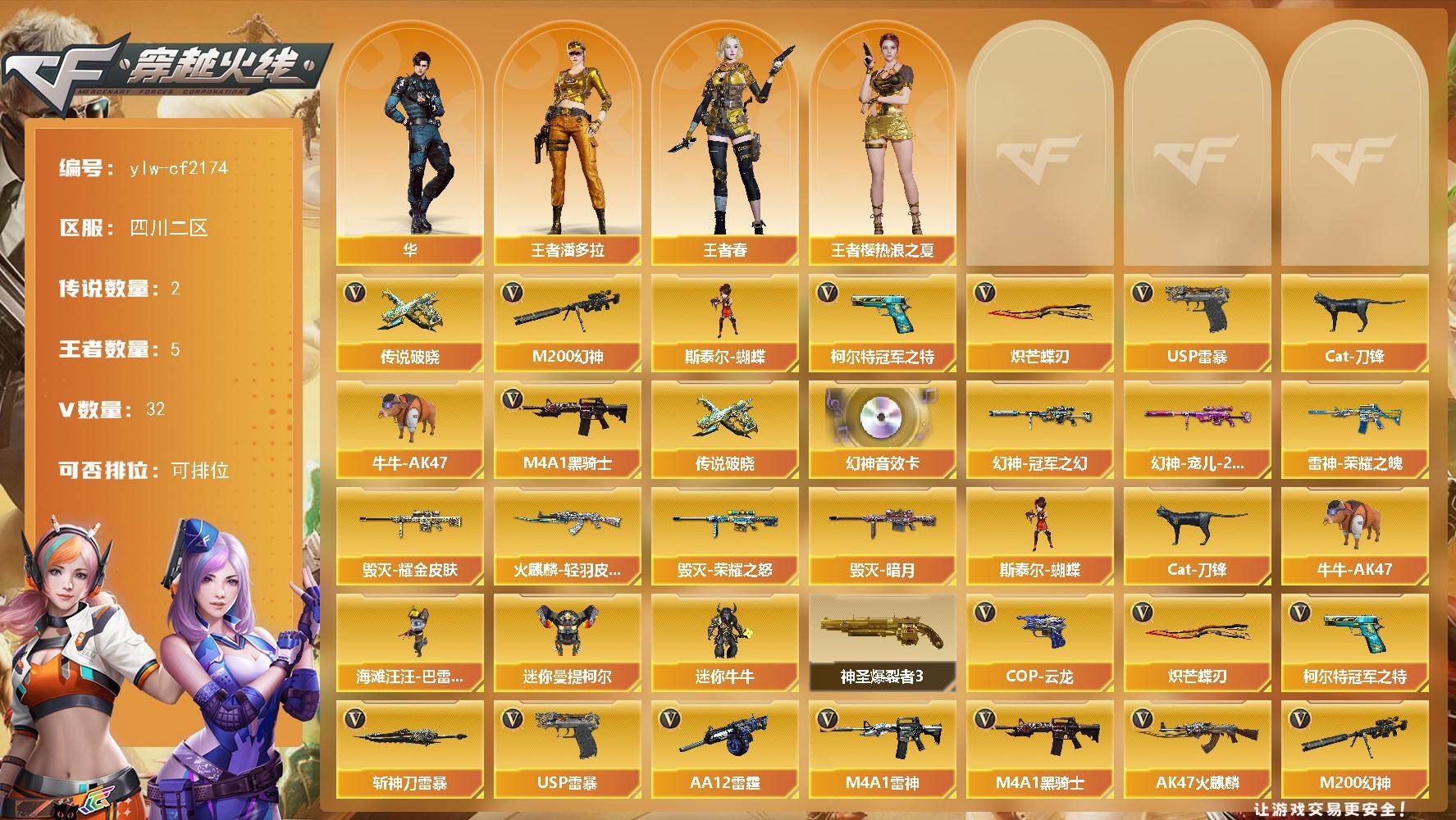 PX_2551687-】:四川二区-32V-5王者-0炫金 【传说武器】:传说破晓 【传说角色】:传说影煞 【热门武器】:传说破晓,M200-幻神,柯尔特-冠军之特,Cat-刀锋,牛牛-AK47,M4A1-黑骑士,斯泰尔-蝴蝶,USP-雷暴,炽芒蝶刃 【音效卡】:M200-幻神音效卡 【稀有皮肤】:幻神-冠军之幻,幻神-宠儿-2021MVP,雷神-荣耀之魄,火麒麟-轻羽皮肤,毁灭-暗月,毁灭-荣耀之怒,毁